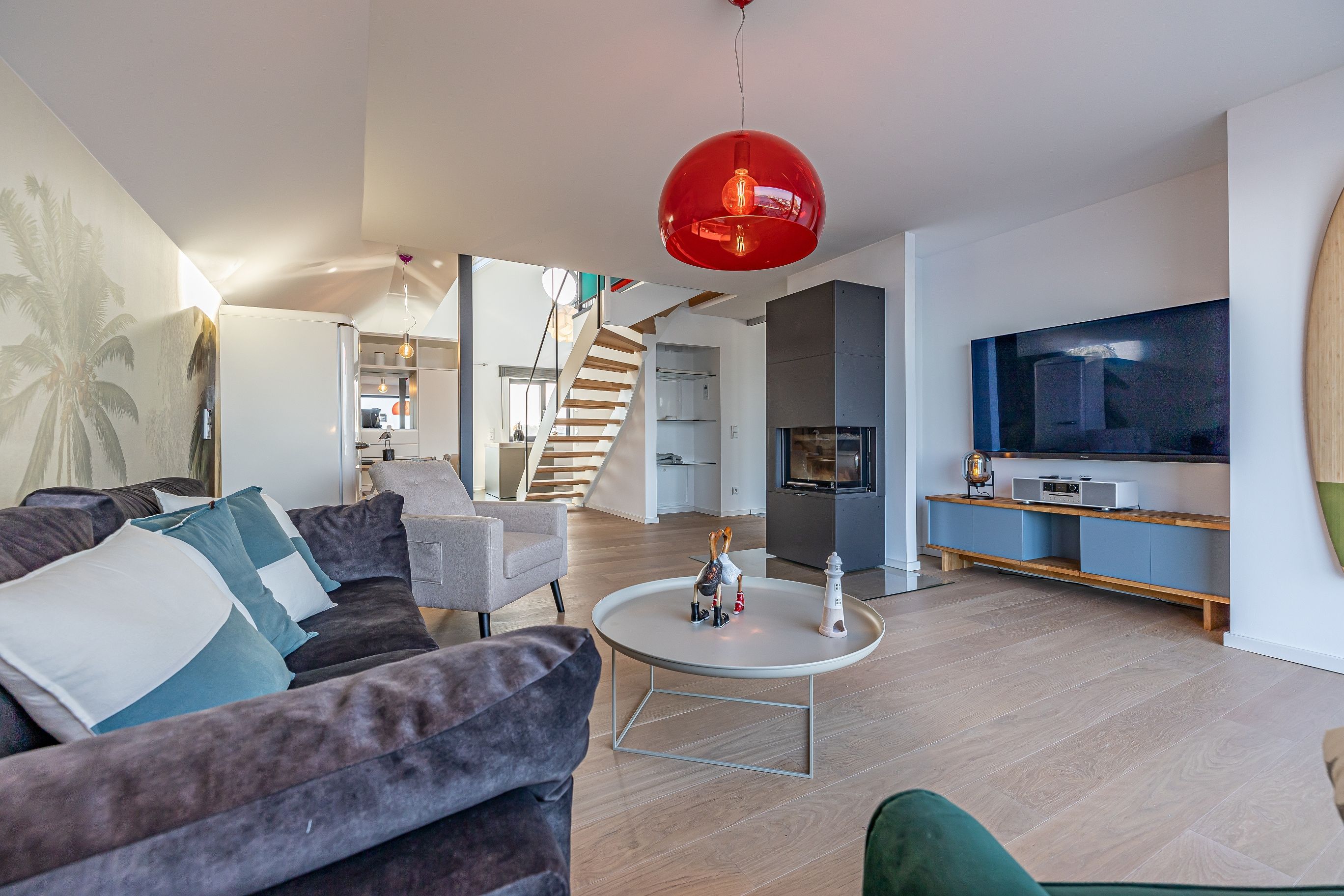 Tauchen Sie ein in ein besonderes Wohnerlebnis: Diese 126 m² große Maisonette-Wohnung, ideal für 2 bis 4 Personen, verbindet großzügige Raumgestaltung mit exklusiver Ausstattung und einer einzigartigen Mischung aus Gemütlichkeit und maritimem Flair.