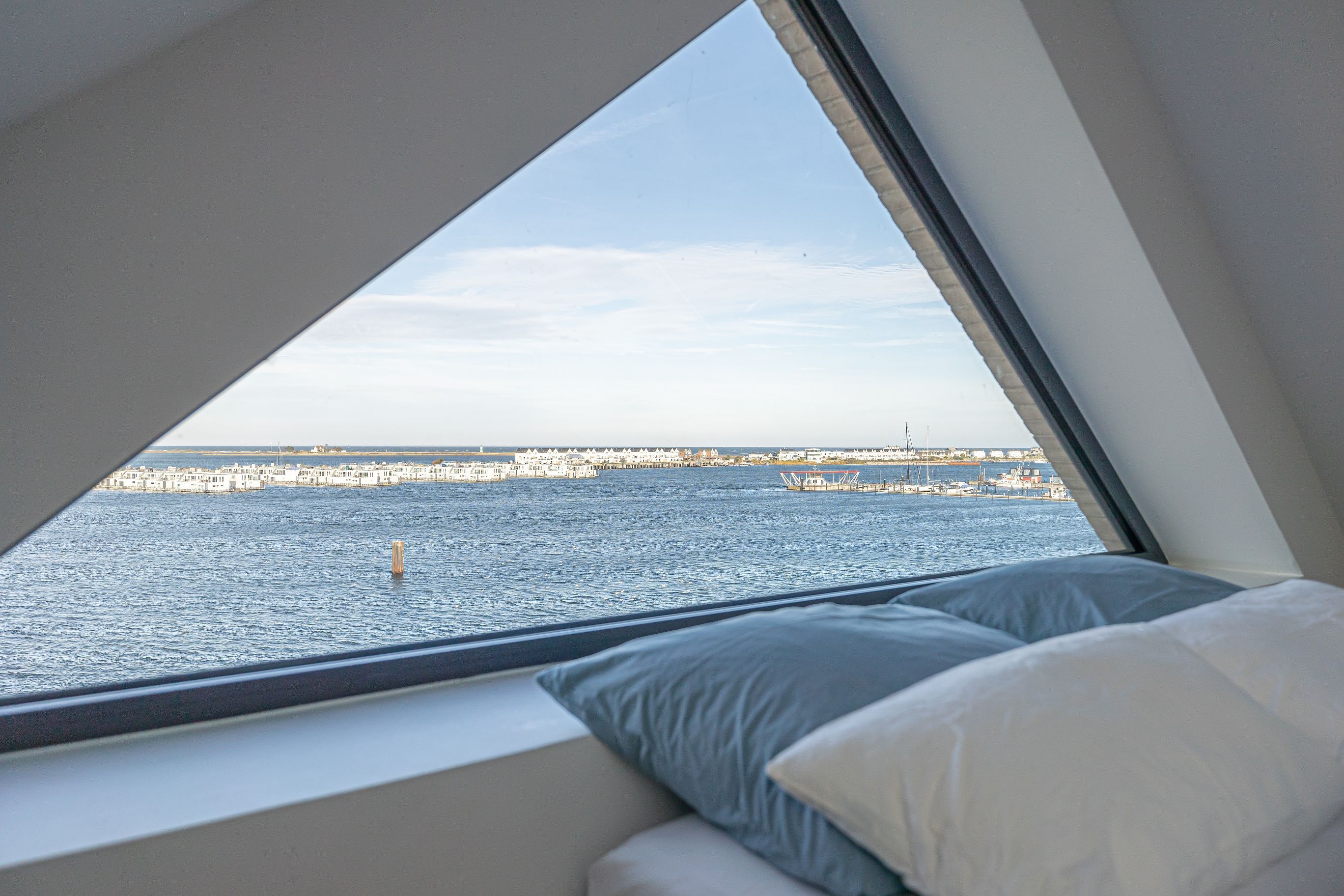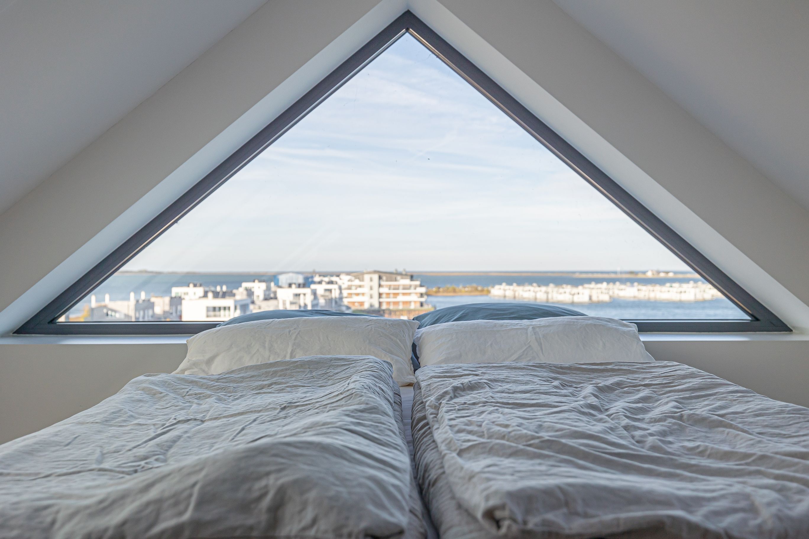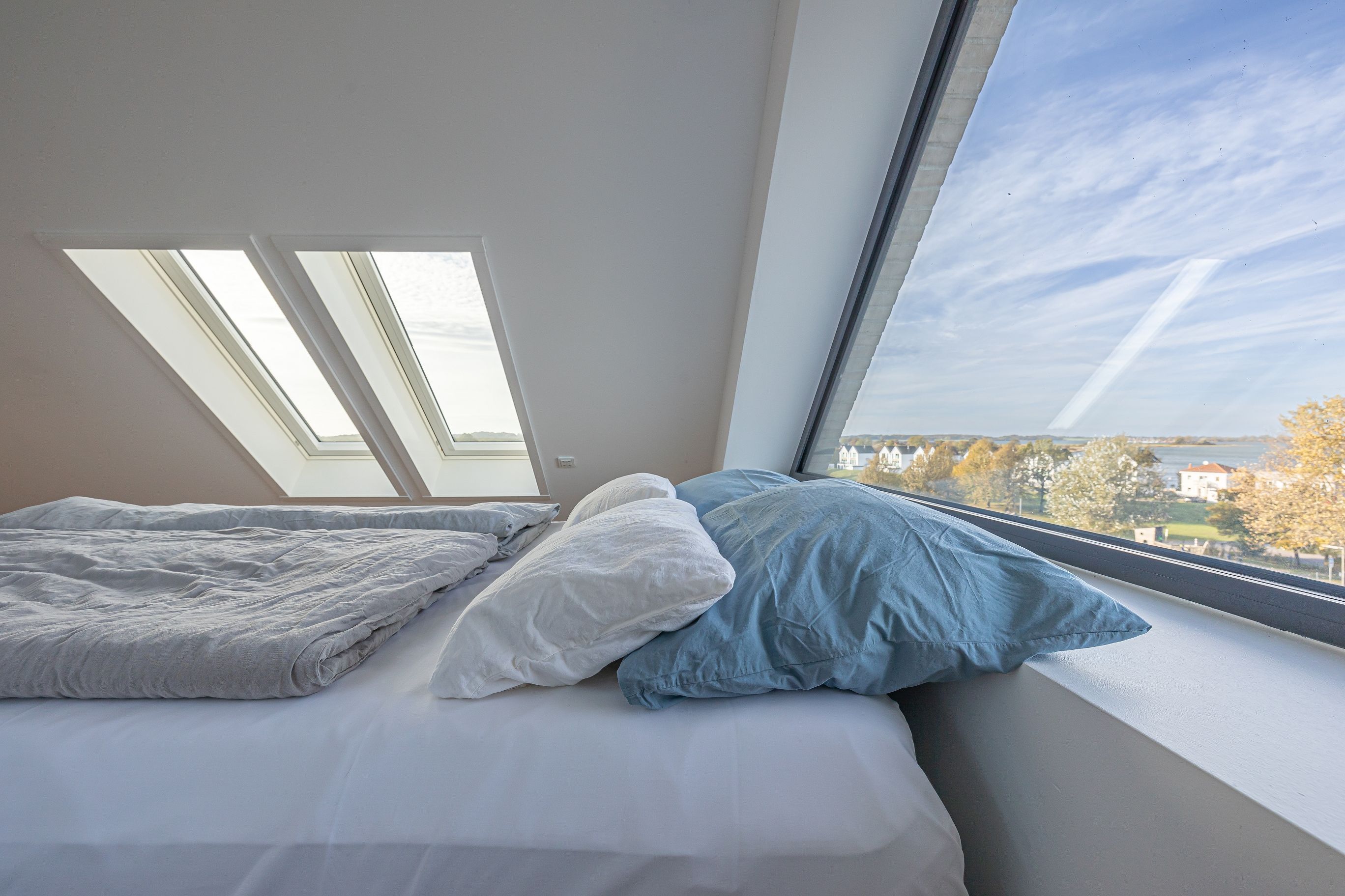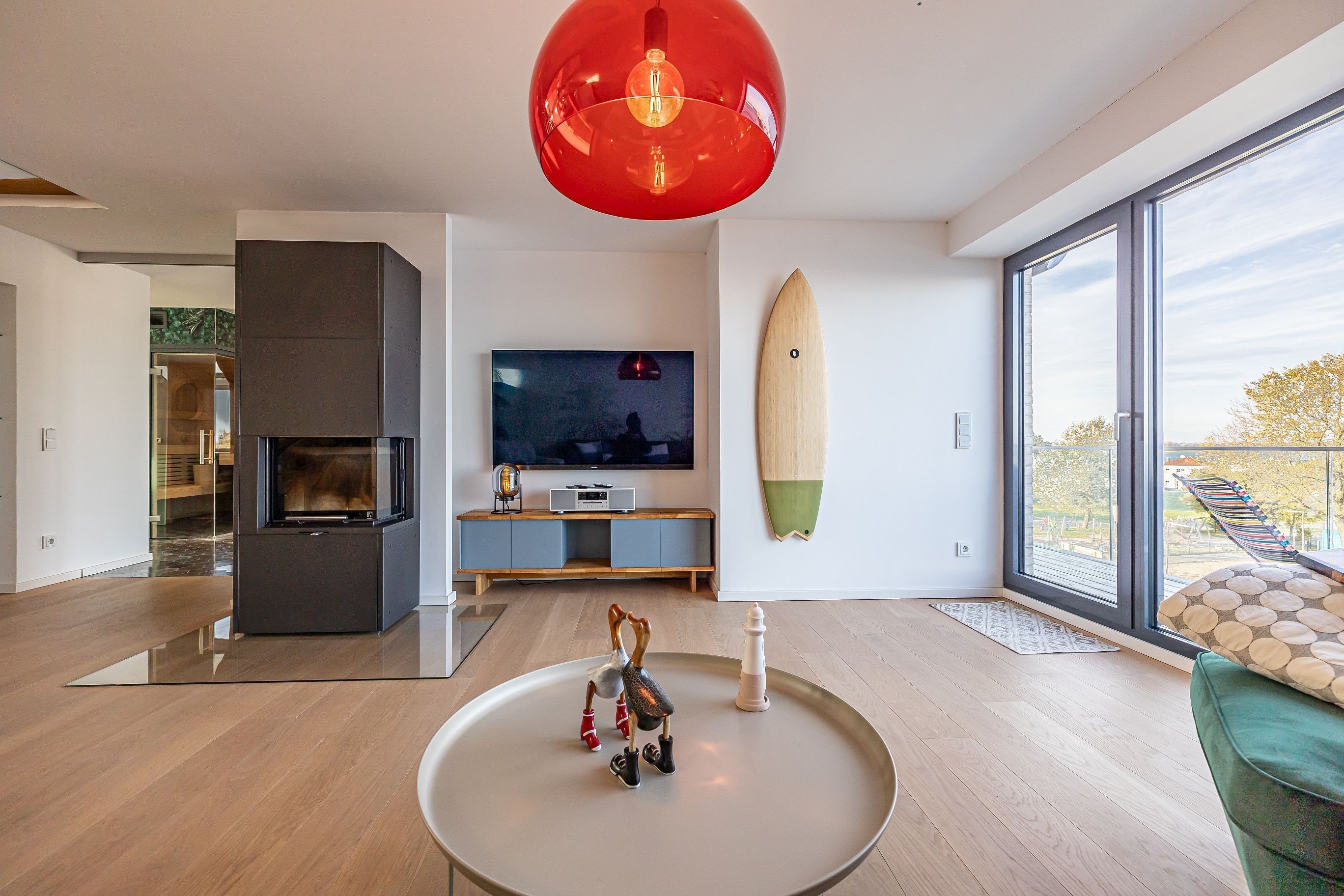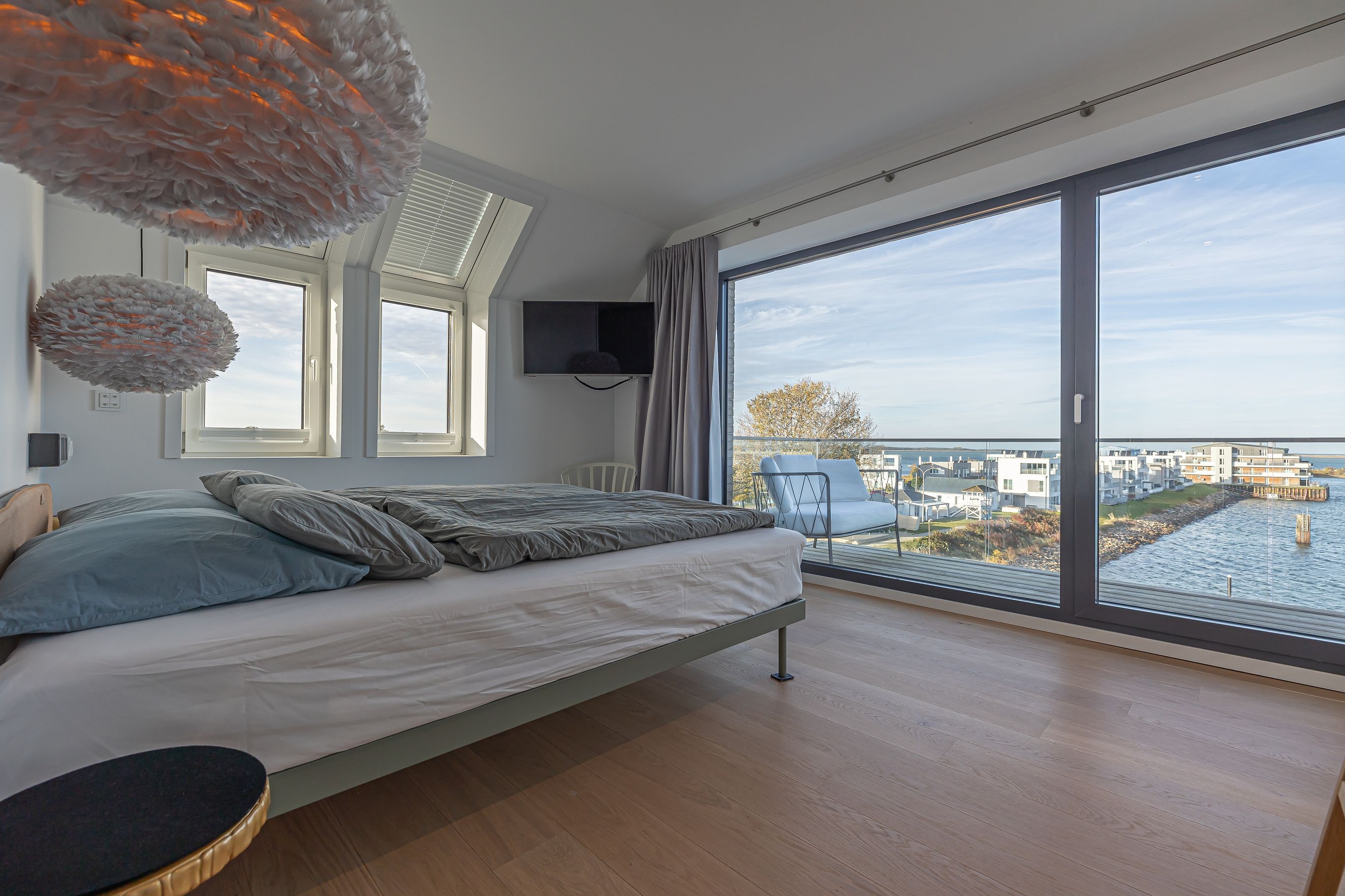 Der lichtdurchflutete Wohnbereich lädt mit einem knisternden Kamin und einem beeindruckenden Panoramablick auf den Hafen, den Leuchtturm von Schleimünde und die Ostsee zum Verweilen ein. Die moderne, voll ausgestattete Küche mit originellem Wandbild schafft die perfekte Atmosphäre für gemeinsame Kochabende. Das elegante Schlafzimmer mit komfortablem Doppelbett und eigenem TV garantiert erholsame Nächte.