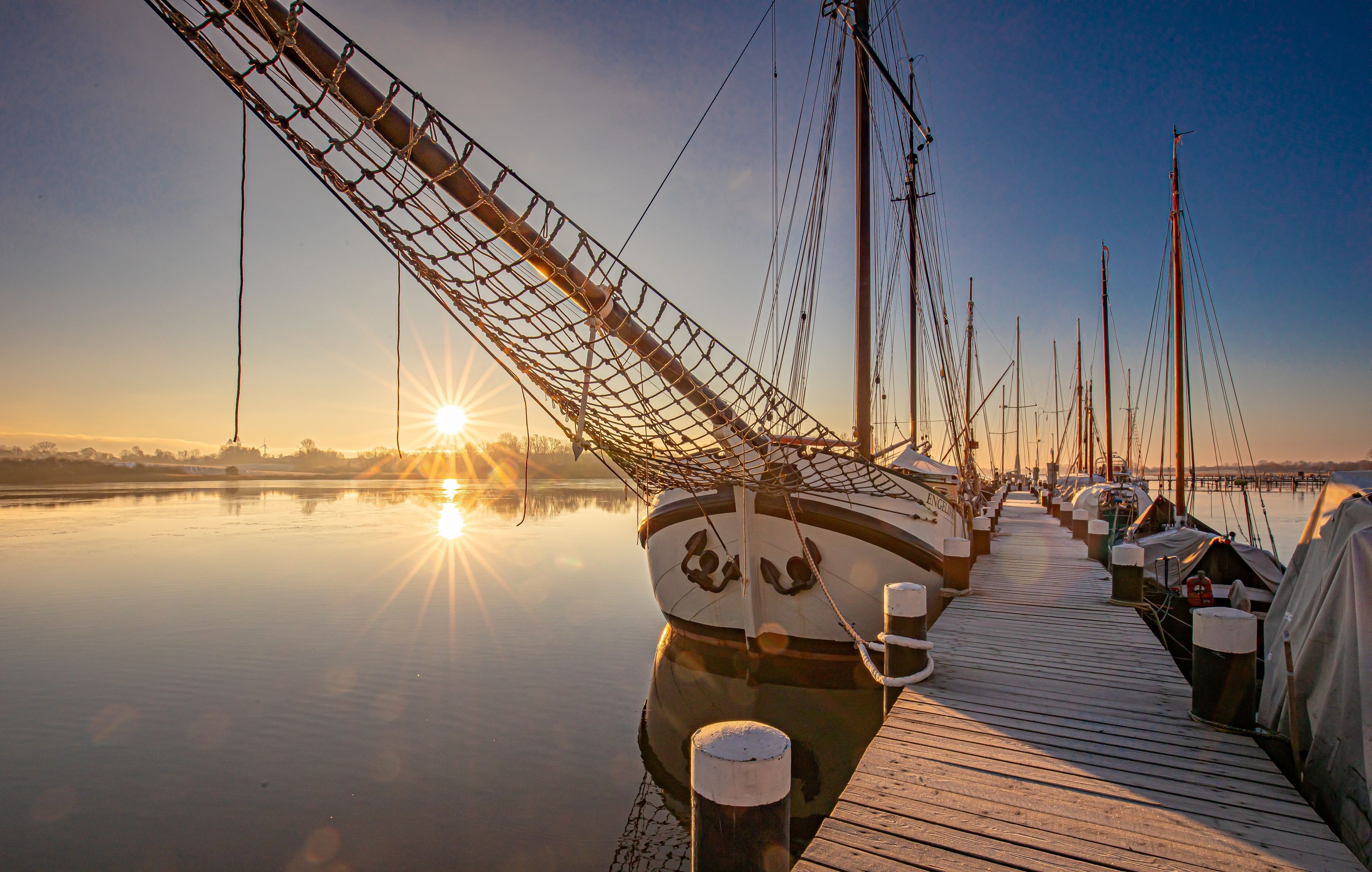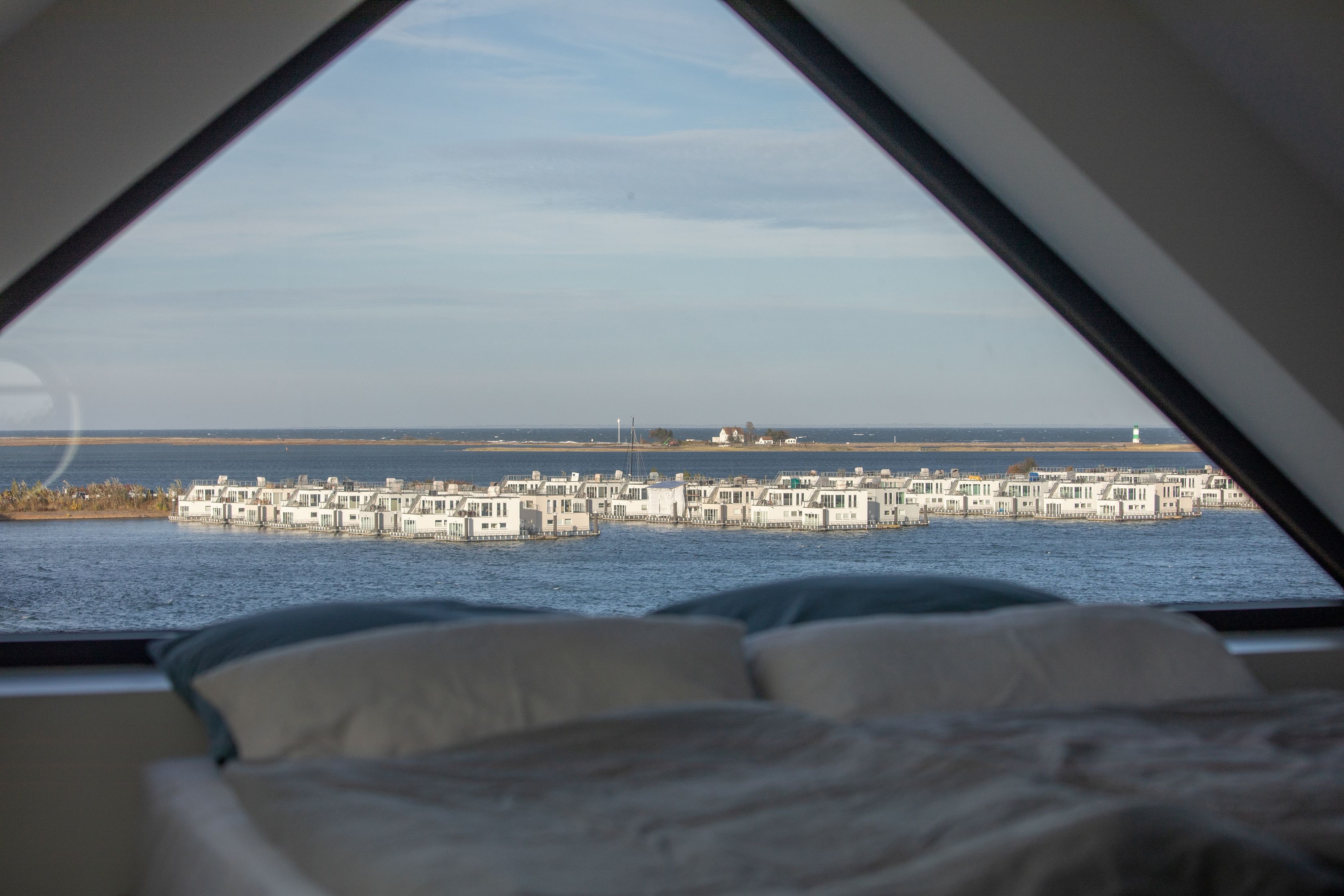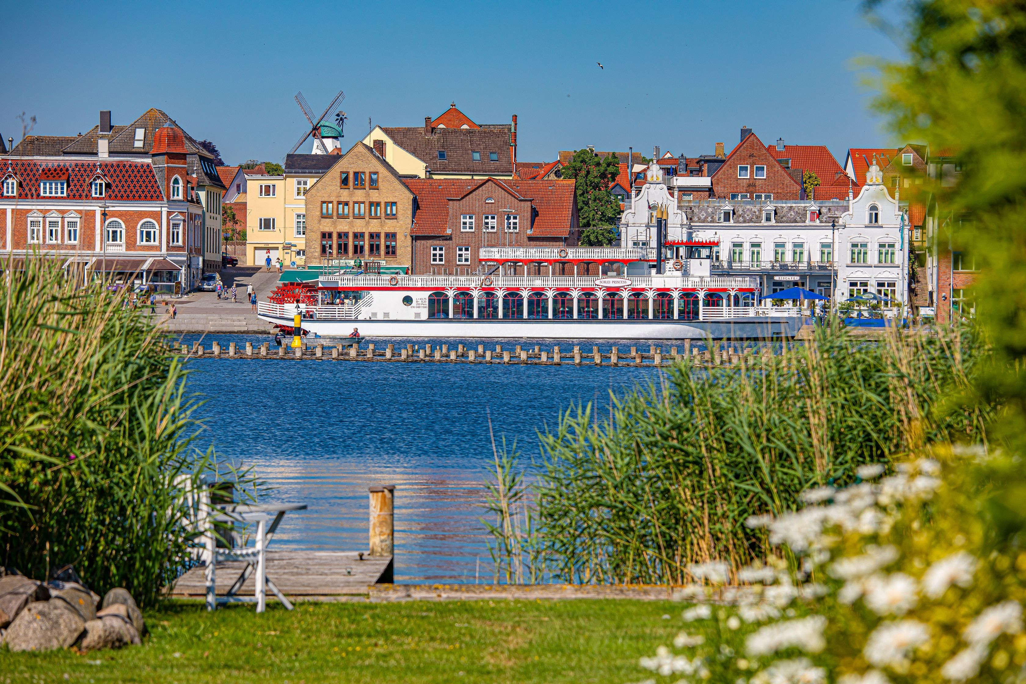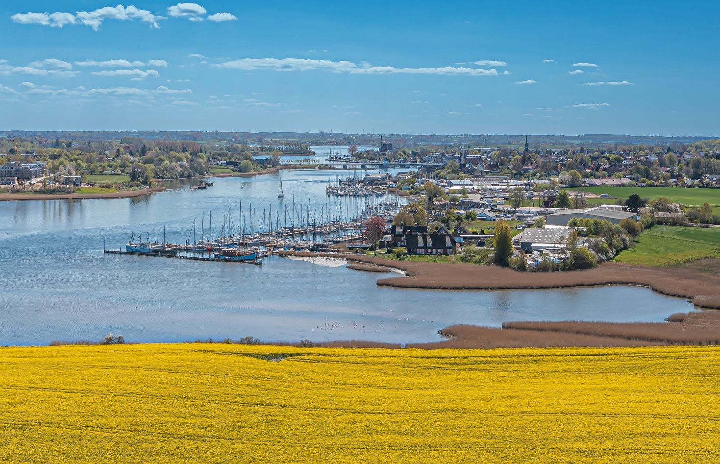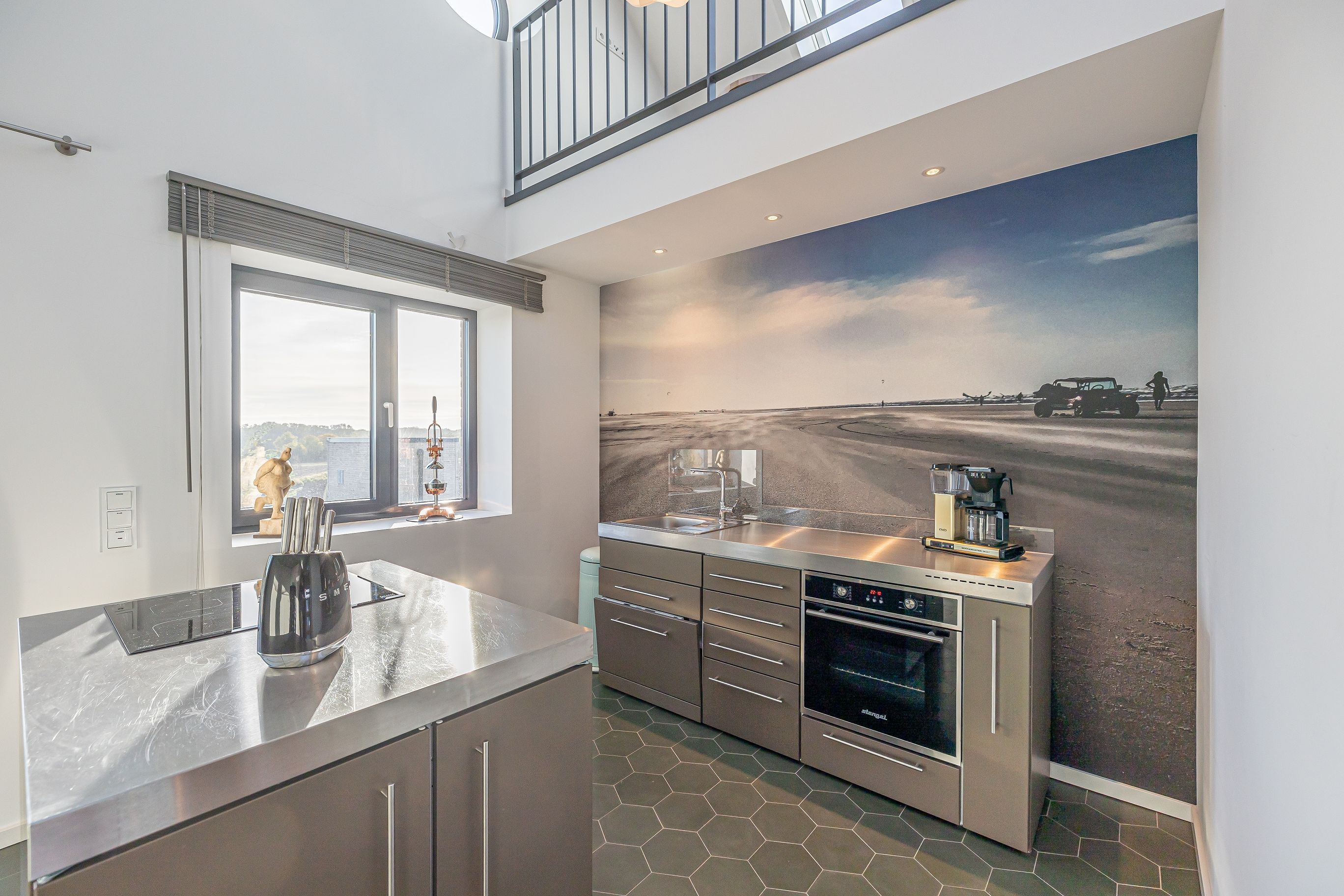 Der lichtdurchflutete Wohnbereich lädt mit einem knisternden Kamin und einem beeindruckenden Panoramablick auf den Hafen, den Leuchtturm von Schleimünde und die Ostsee zum Verweilen ein. Die moderne, voll ausgestattete Küche mit originellem Wandbild schafft die perfekte Atmosphäre für gemeinsame Kochabende. Das elegante Schlafzimmer mit komfortablem Doppelbett und eigenem TV garantiert erholsame Nächte.