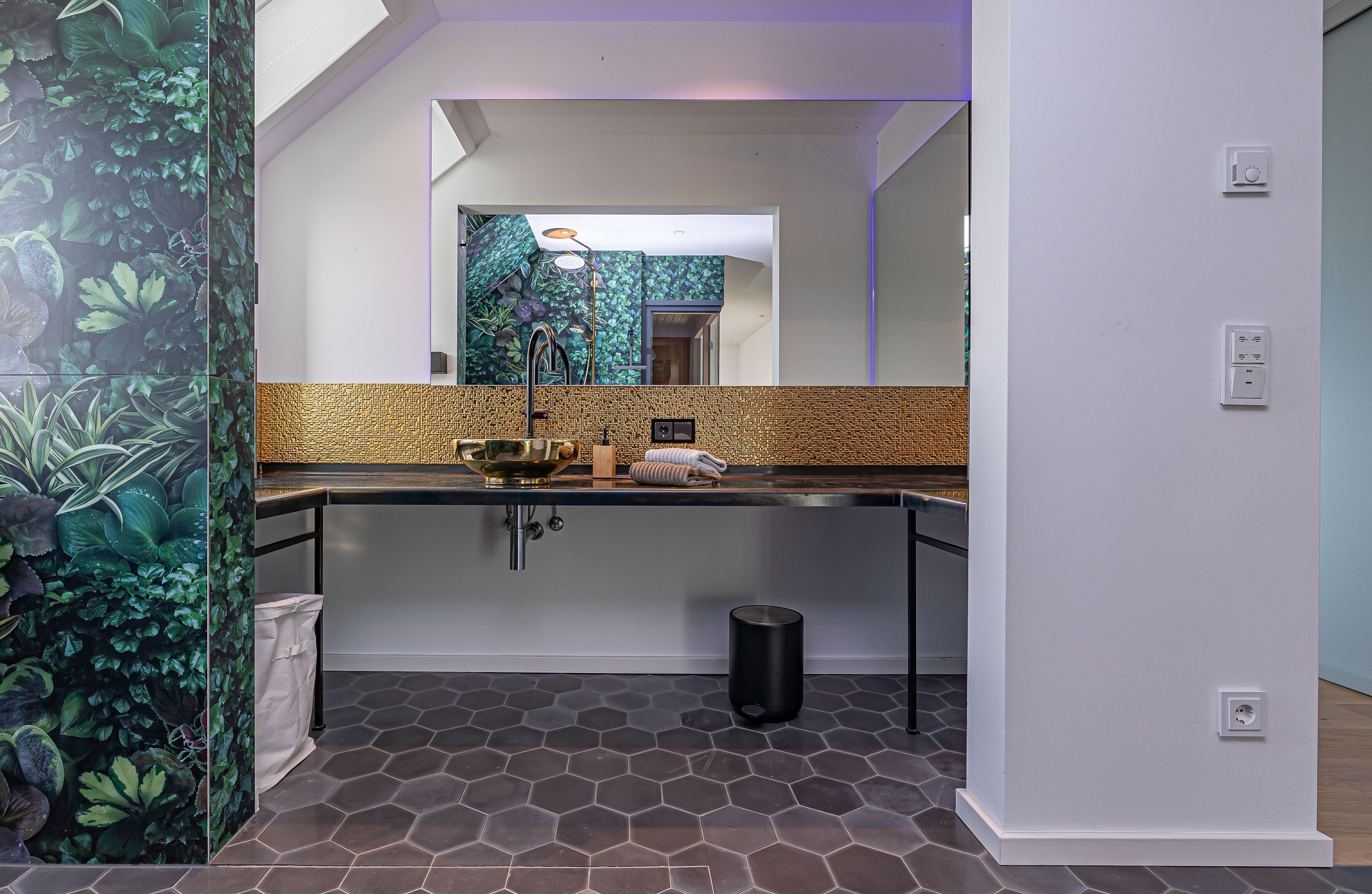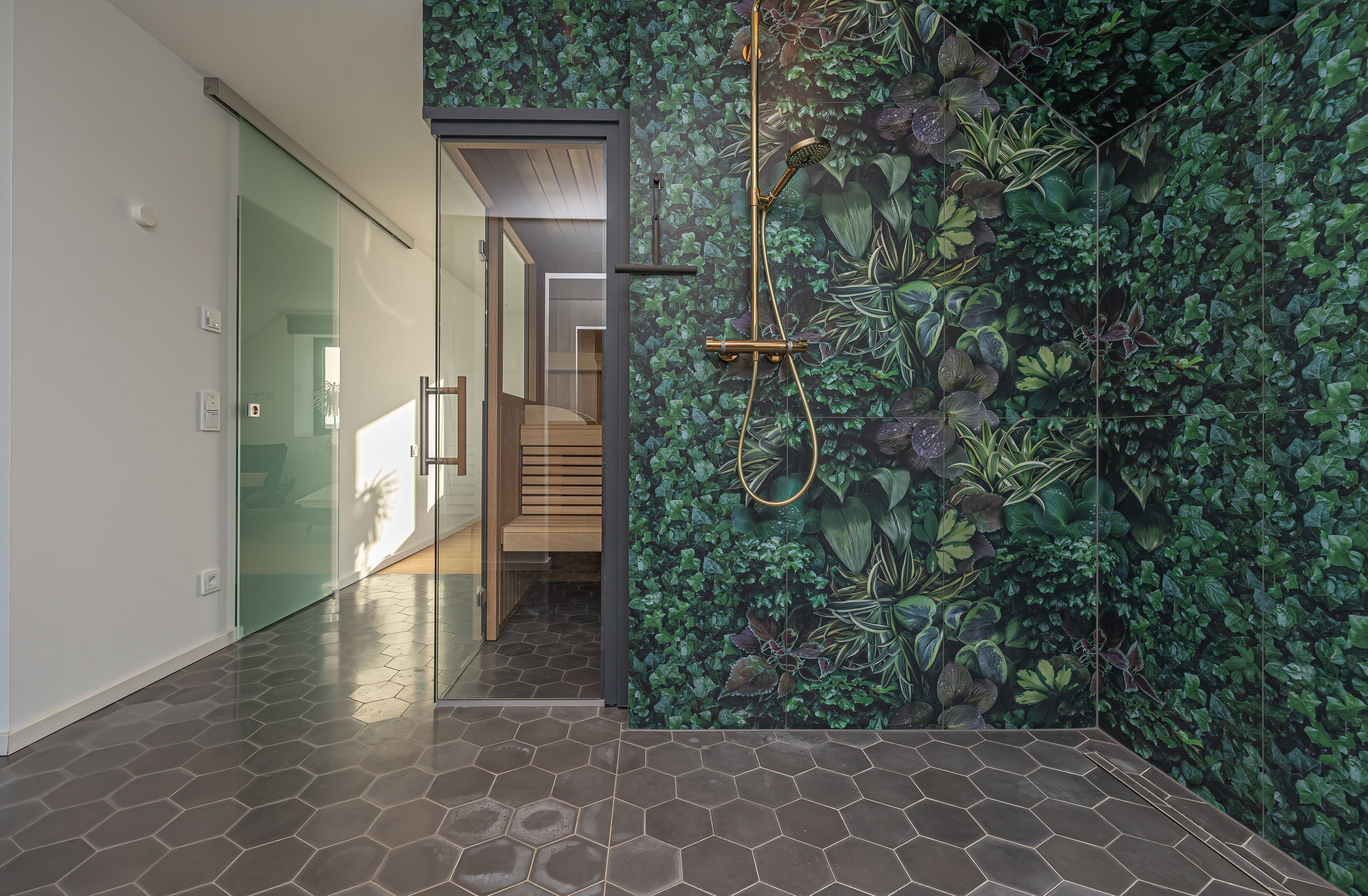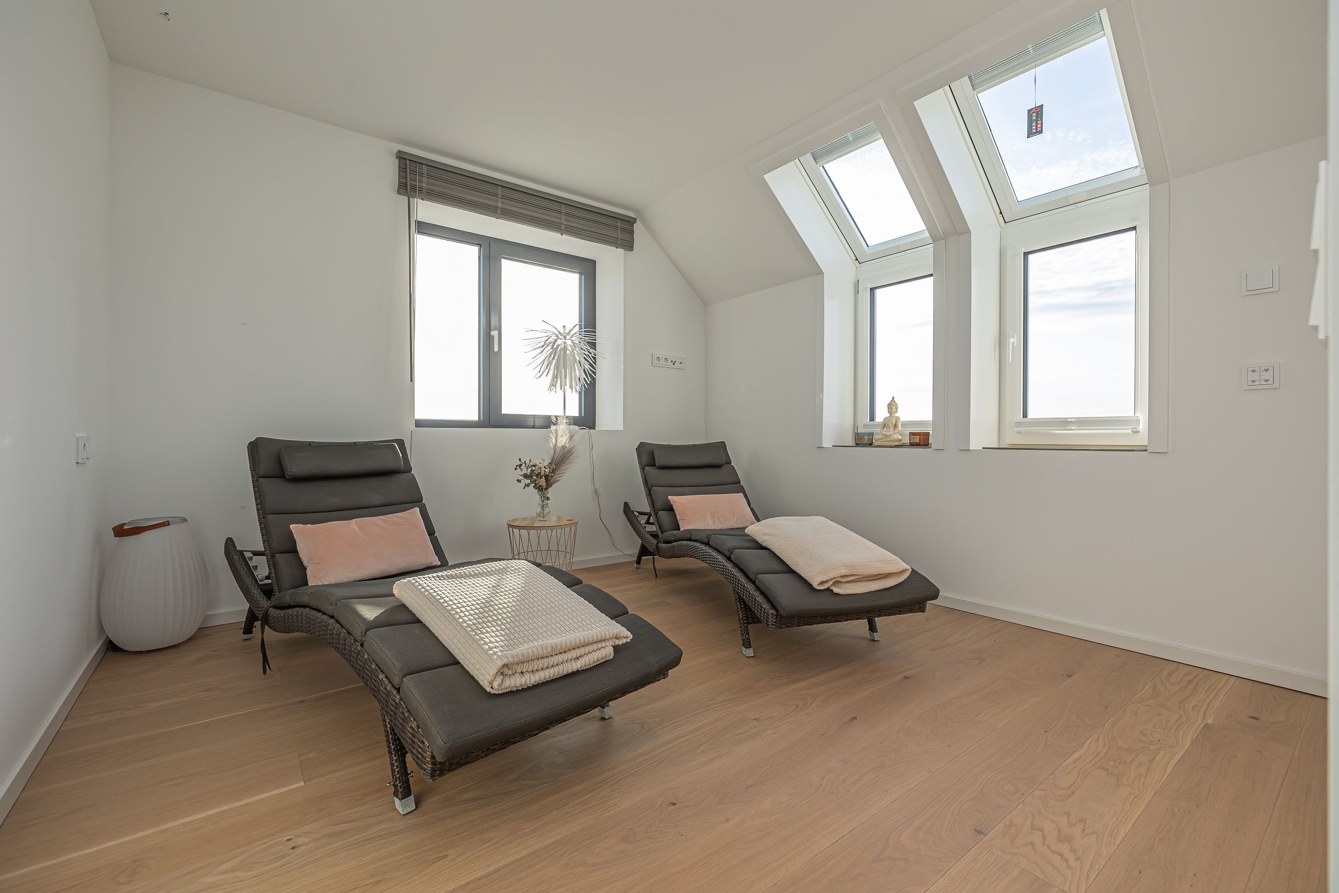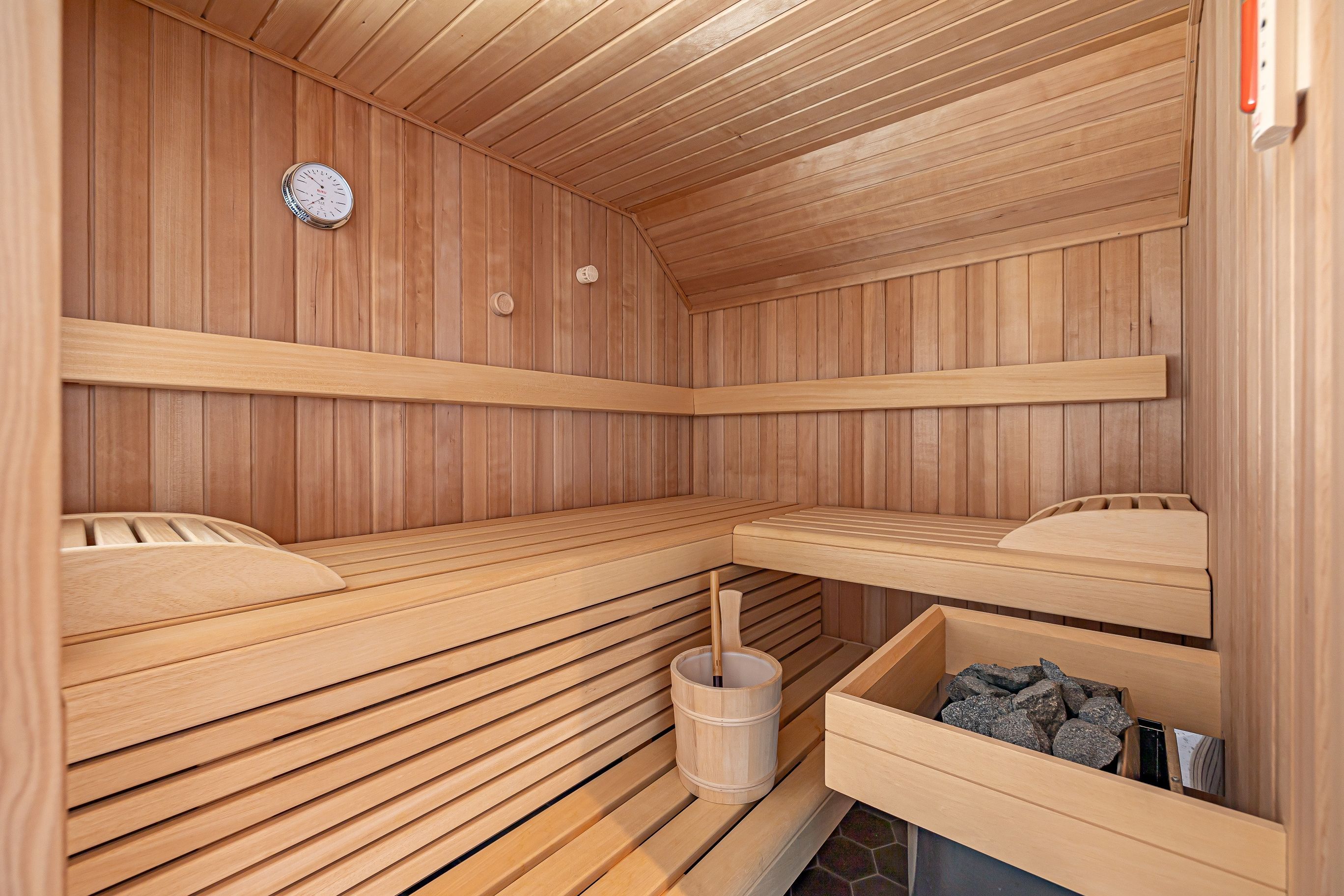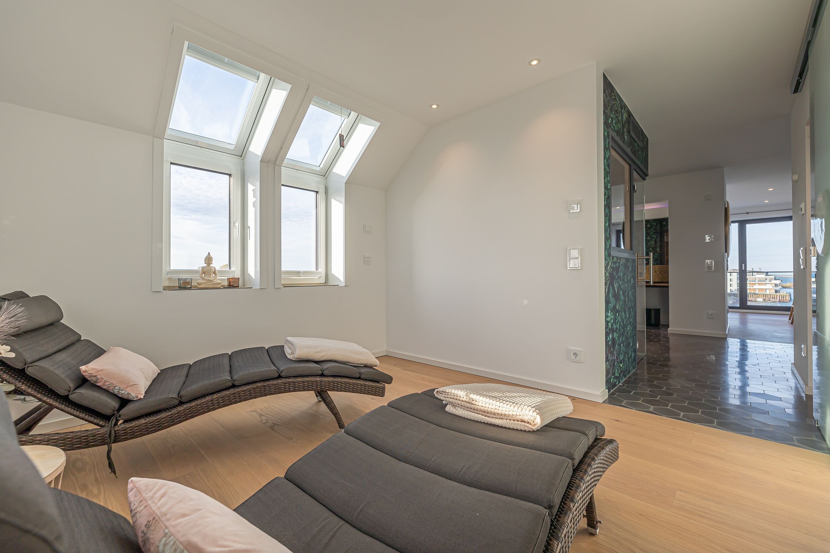 Im unteren Bereich erwartet Sie ein luxuriöser Wellnessbereich: eine finnische Sauna, ein angrenzender Ruheraum und eine großzügige Rain-Shower-Dusche bieten ideale Voraussetzungen, um Körper und Geist zu entspannen.