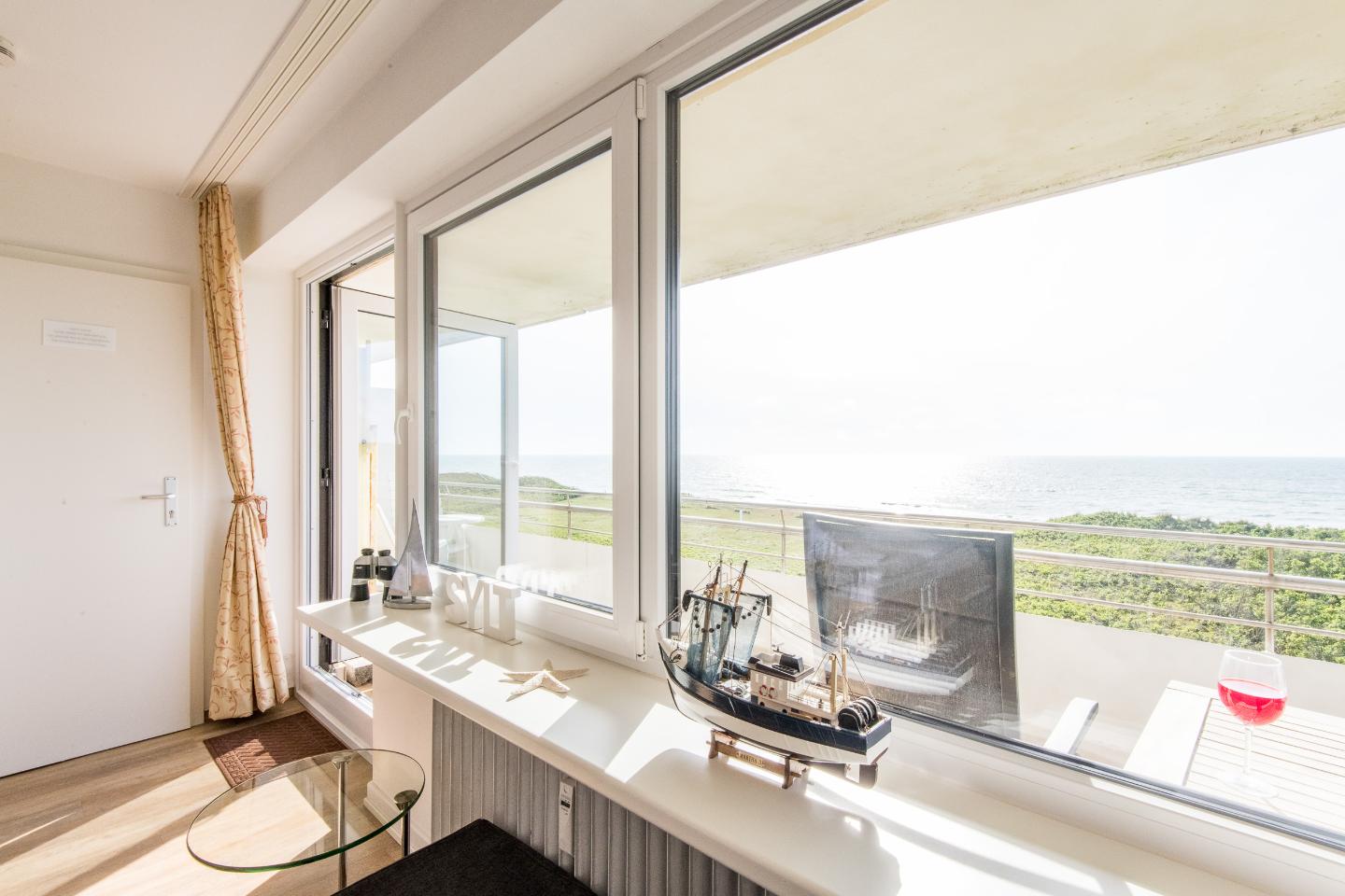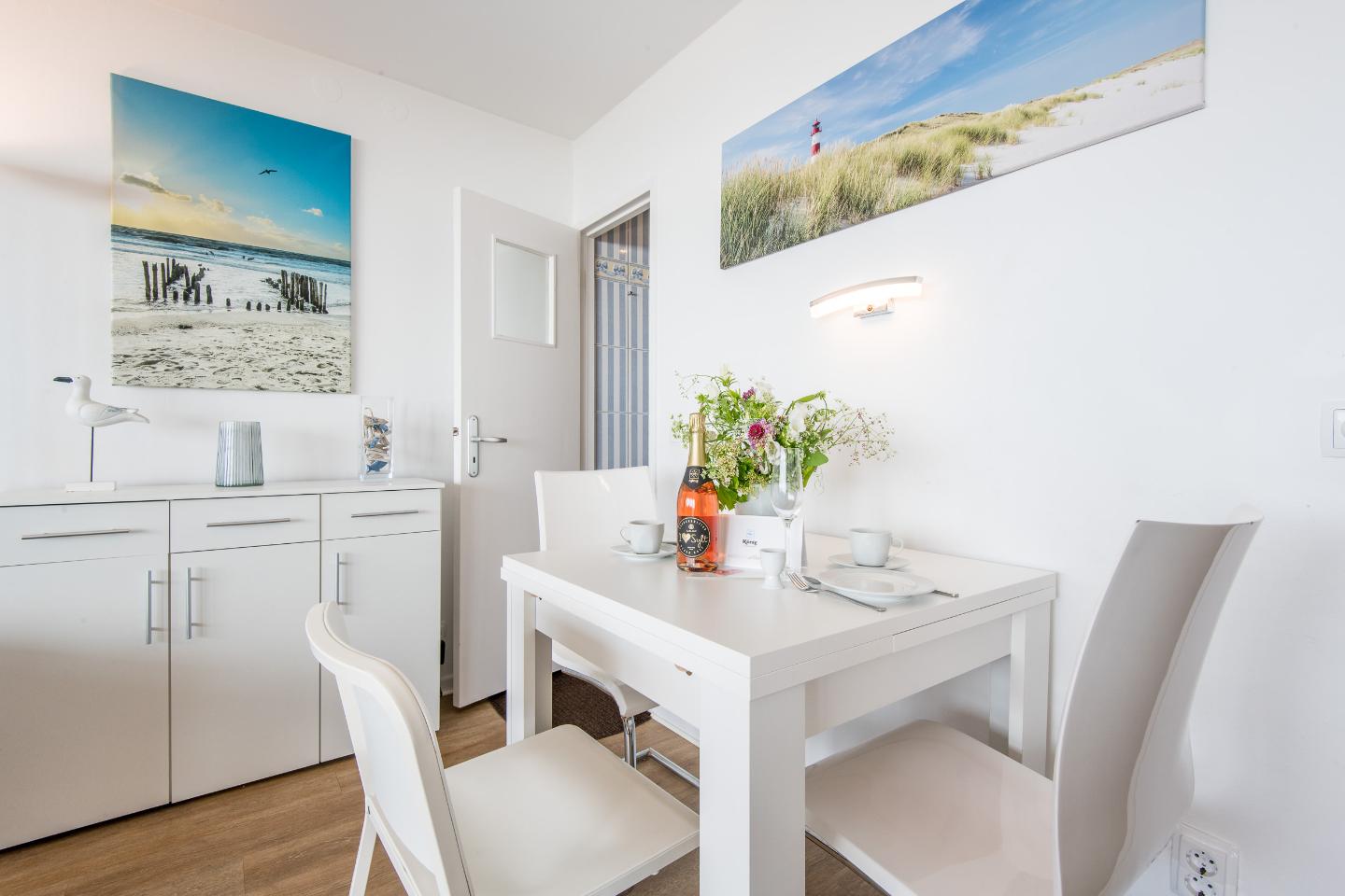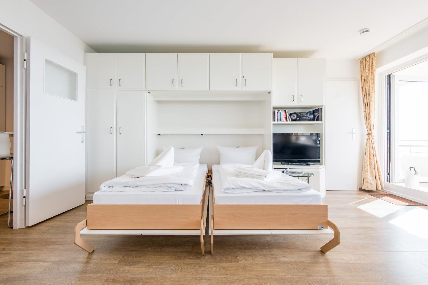 Der Wohn- und Schlafraum ist mit einem praktischen Schrankbett (160x200 cm) ausgestattet, das tagsüber mühelos verstaut werden kann, um den Raum optimal zu nutzen. Eine hochwertige Sitzgruppe und ein TV sorgen für gemütliche Abende. Der Essbereich bietet Platz für zwei Personen, perfekt für gemeinsame Mahlzeiten oder einen Kaffee am Morgen. Vom Wohnbereich aus haben Sie direkten Zugang zum möblierten Westbalkon, wo Sie den atemberaubenden Blick auf das Meer und die Dünen genießen können.