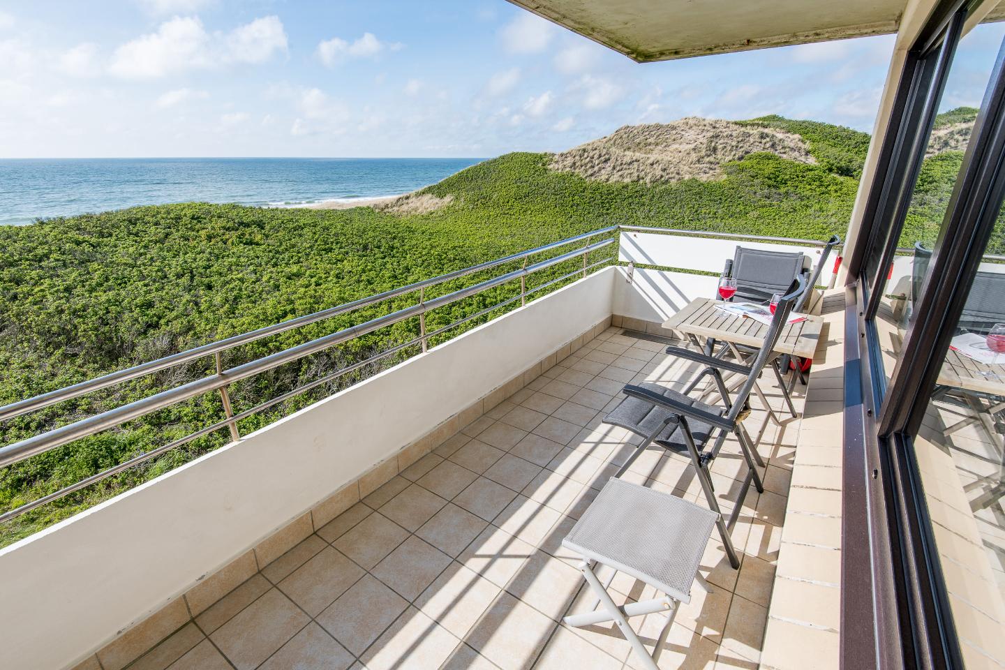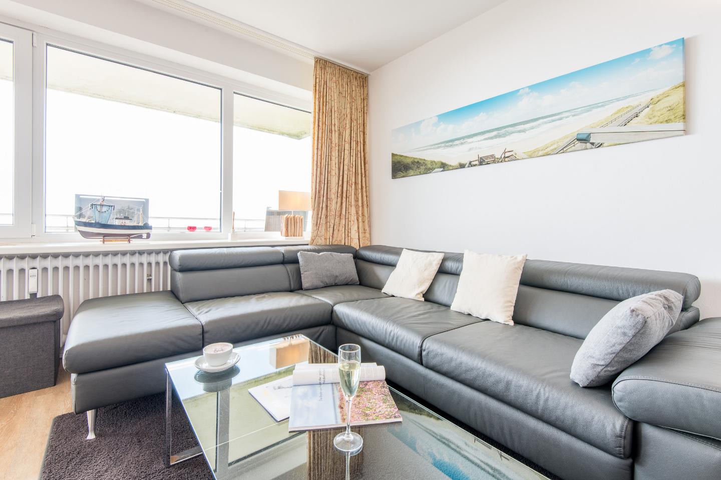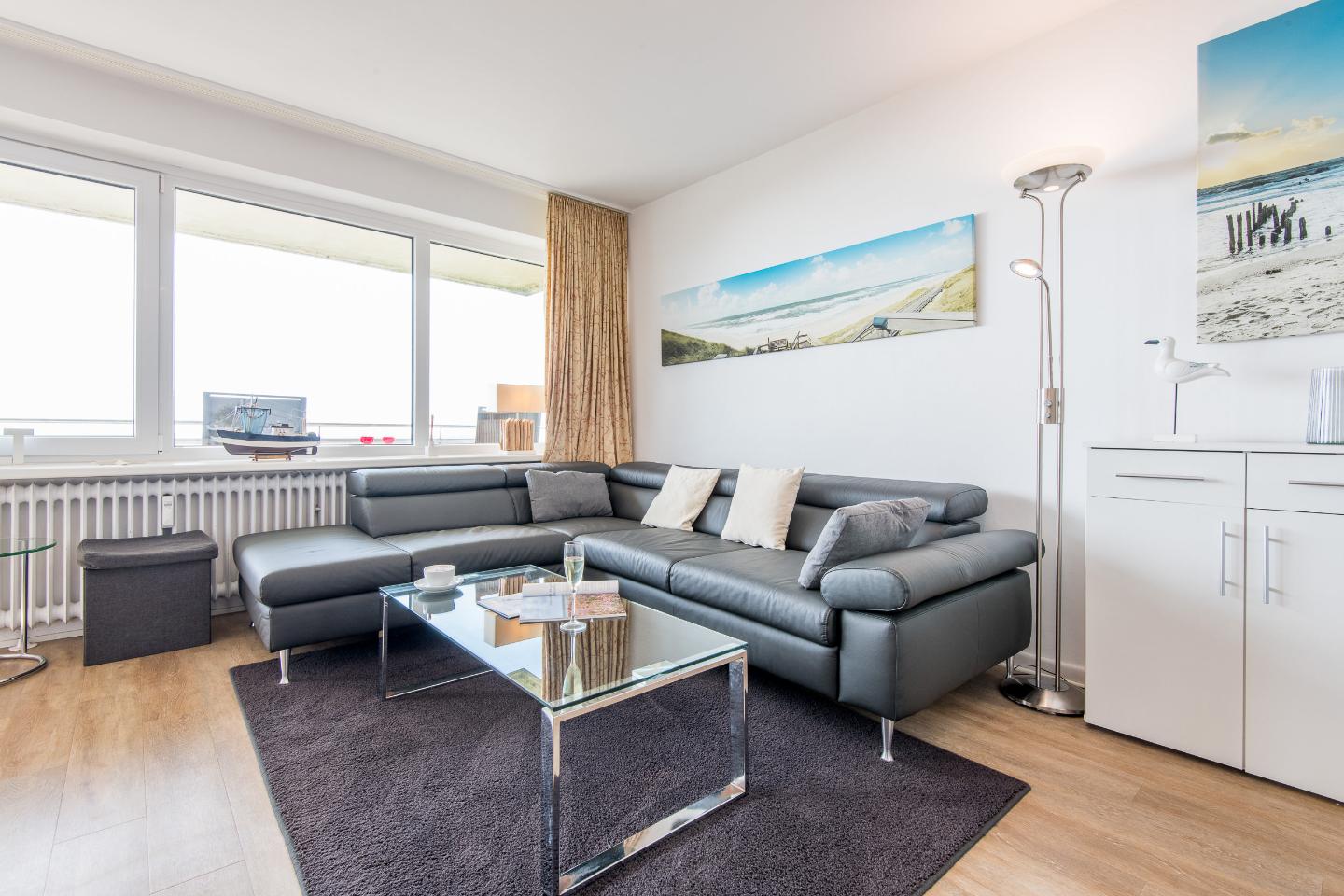 Der Wohn- und Schlafraum ist mit einem praktischen Schrankbett (160x200 cm) ausgestattet, das tagsüber mühelos verstaut werden kann, um den Raum optimal zu nutzen. Eine hochwertige Sitzgruppe und ein TV sorgen für gemütliche Abende. Der Essbereich bietet Platz für zwei Personen, perfekt für gemeinsame Mahlzeiten oder einen Kaffee am Morgen. Vom Wohnbereich aus haben Sie direkten Zugang zum möblierten Westbalkon, wo Sie den atemberaubenden Blick auf das Meer und die Dünen genießen können.