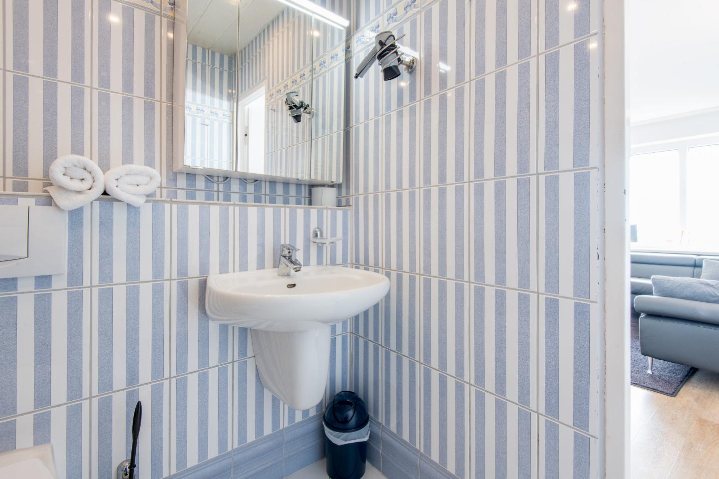 Das Badezimmer ist modern eingerichtet und verfügt über eine Dusche und ein WC – ideal für eine erfrischende Dusche nach einem Tag am Strand.