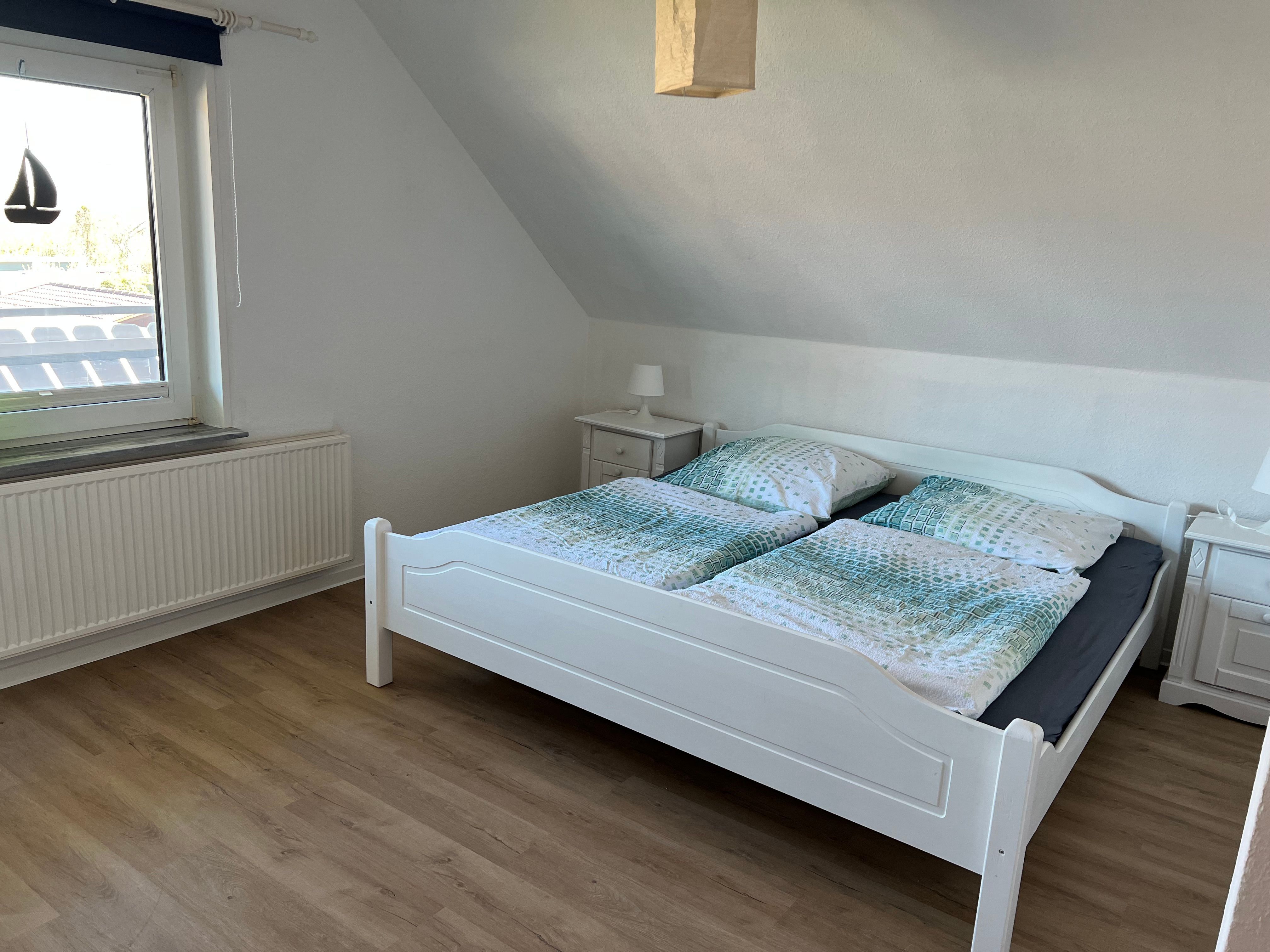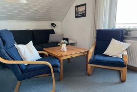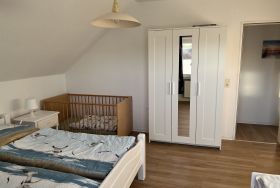 Die gemütliche Ferienwohnung im Obergeschoss erstreckt sich über 40 Quadratmeter und bietet alles, was Sie für einen entspannten Urlaub benötigen. Sie verfügt über ein einladendes Schlafzimmer mit Doppelbett, ein Badezimmer mit Dusche und WC ausgestattet und eine kleine, praktische Küche die zudem über eine gemütliche Essecke verfügt. Im angrenzenden Wohnzimmer können Sie nach einem ereignisreichen Tag entspannen.