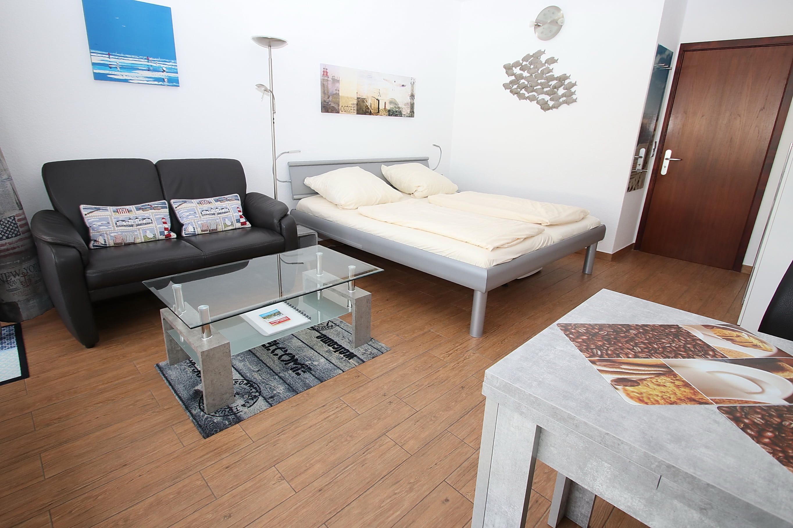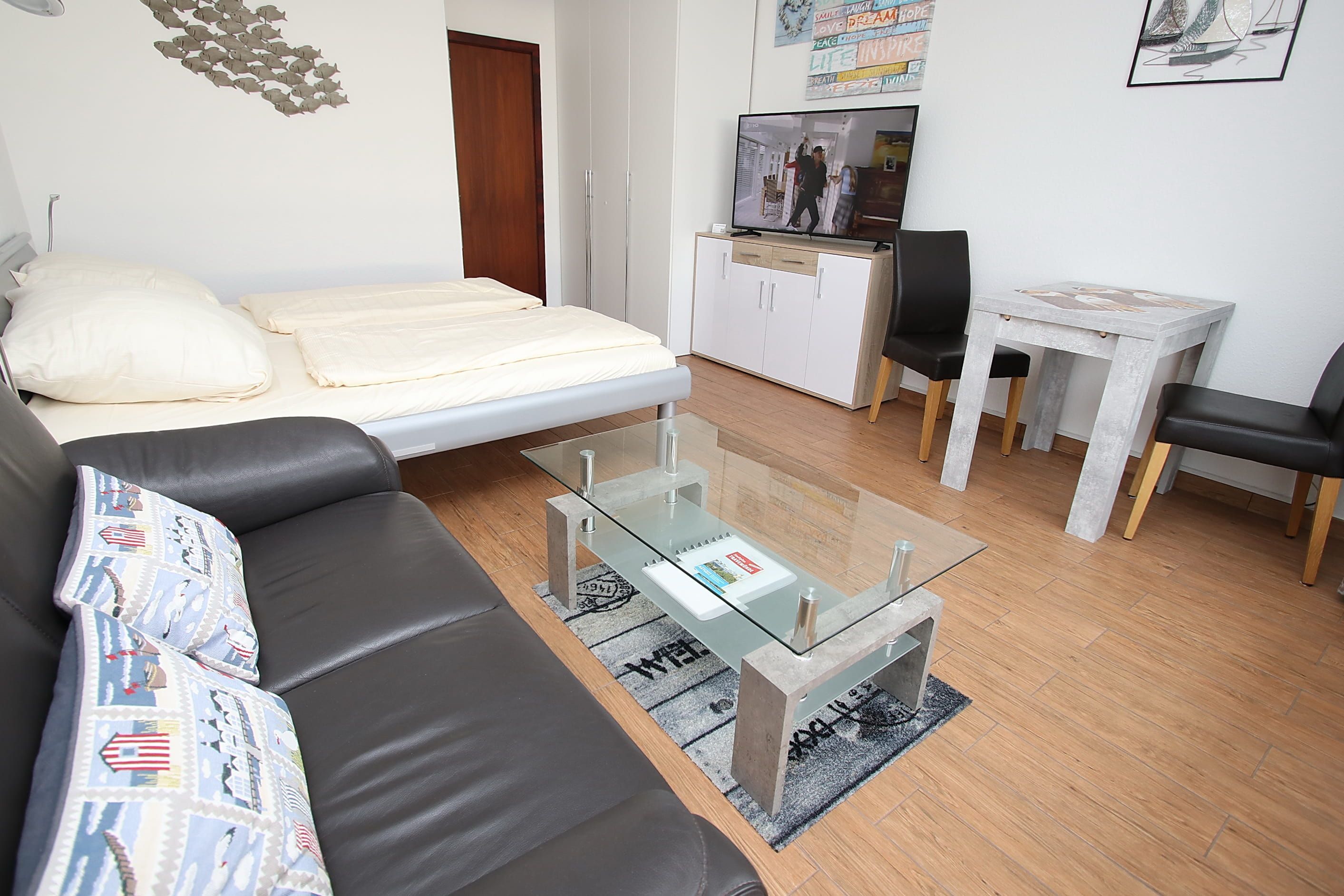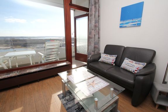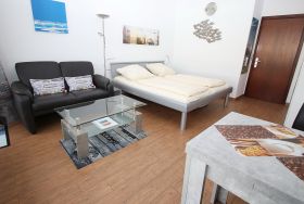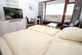 Dieses hochwertige Appartement entspricht allen Ansprüchen und lädt von Anfang an zum Wohlfühlen ein. Der helle Wohnraum besteht aus einem komfortablen Doppelbett (2x 90 cm x 200 cm) und einer bequemen Ledercouch mit Tisch. Des Weiteren gehören zu der geschmackvollen Einrichtung eine Essecke mit Stühlen und ein Kleiderschrank. Der gesamte Wohnbereich ist mit Designerfliesen in Holzoptik ausgestattet. Die moderne Küche ist im Eingangsbereich integriert. Das neue, luxuriöse Duschbad erreichen Sie vom Flur. Diese fantastische Wohnung hat die besten Voraussetzungen für einen erholsamen Urlaub. Vom Balkon genießen Sie einen traumhaften Blick auf die Mecklenburger Bucht und zur Trave mit ein- und ausfahrendem Schiffsverkehr.