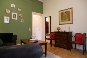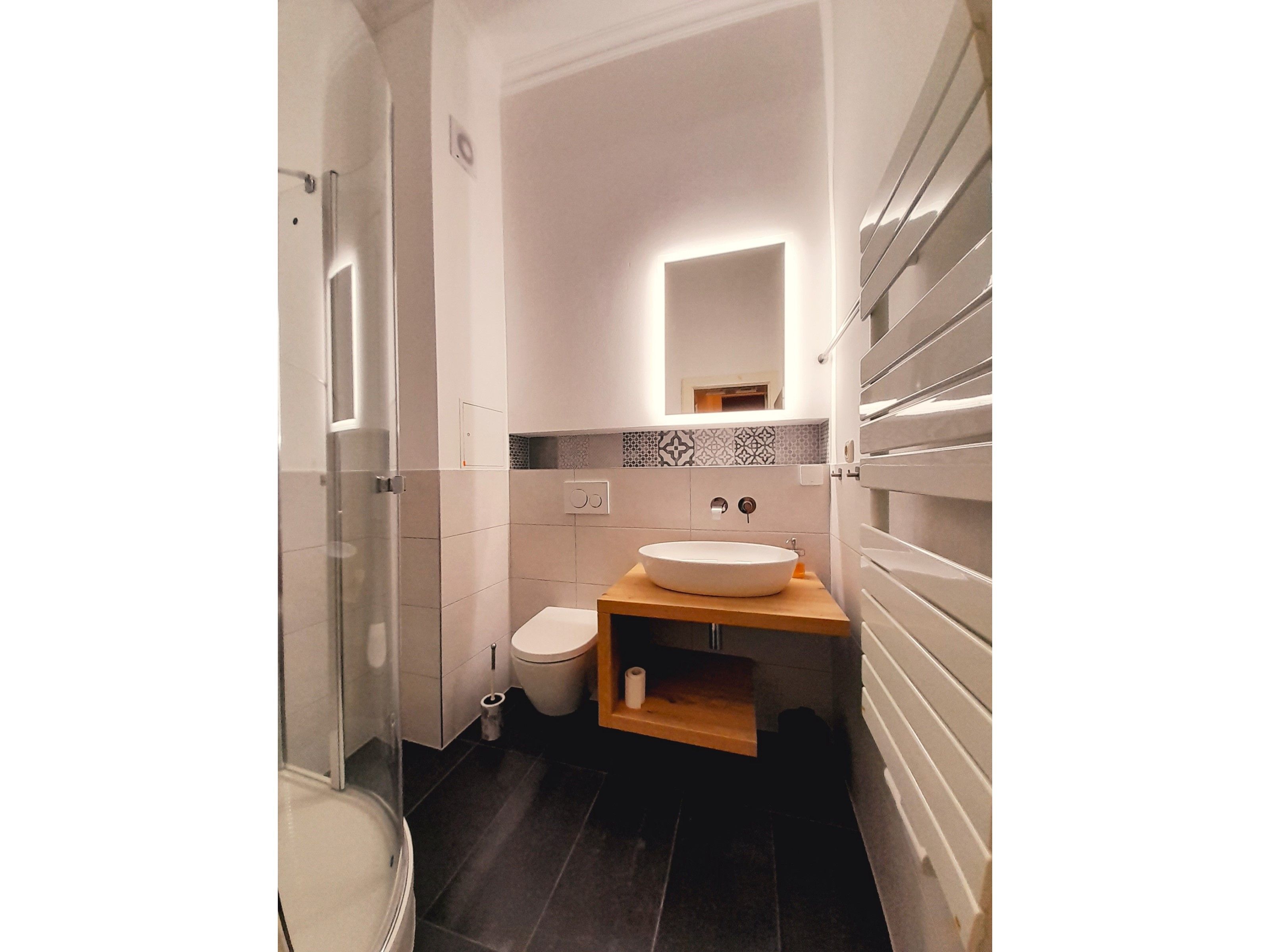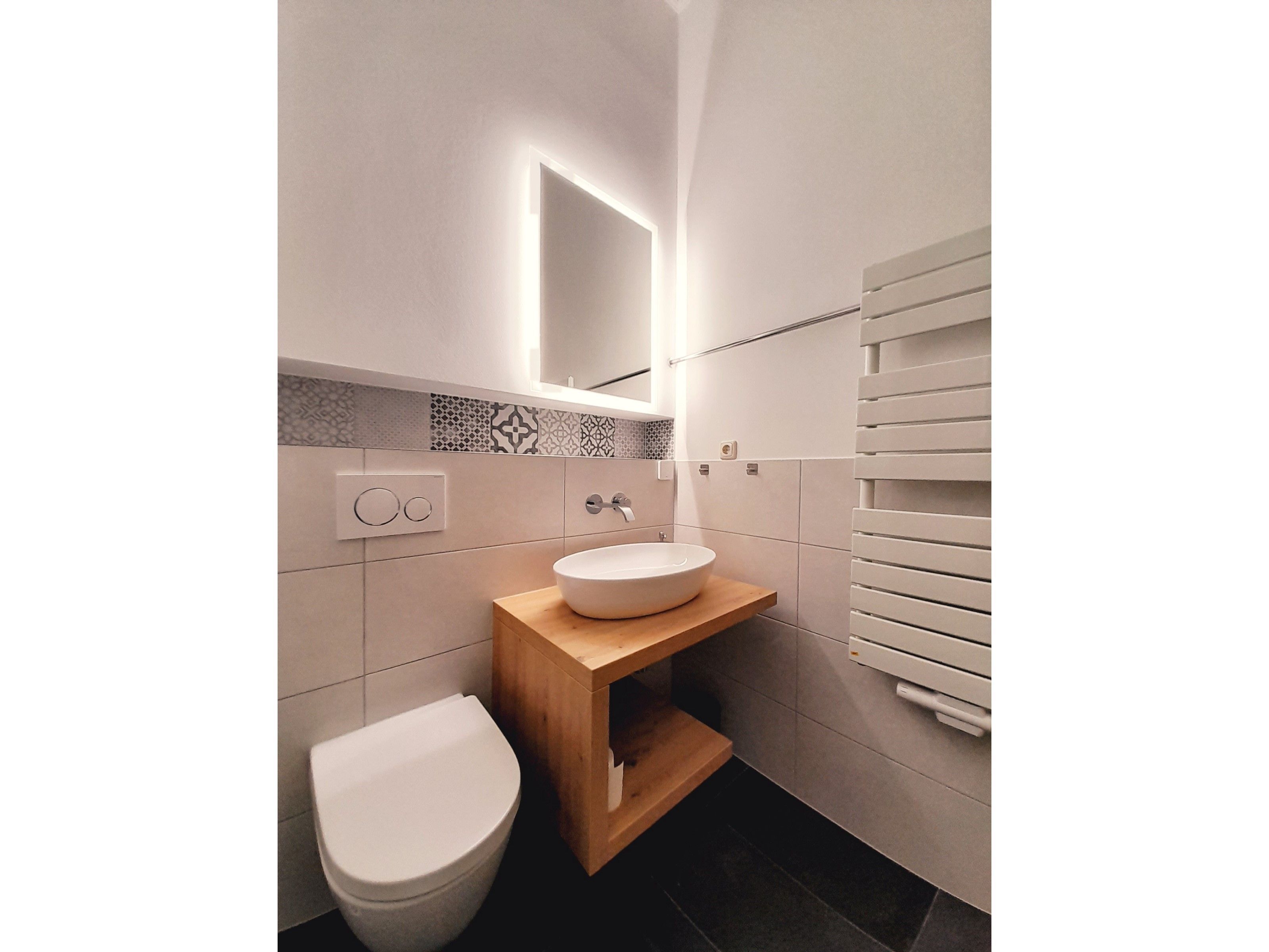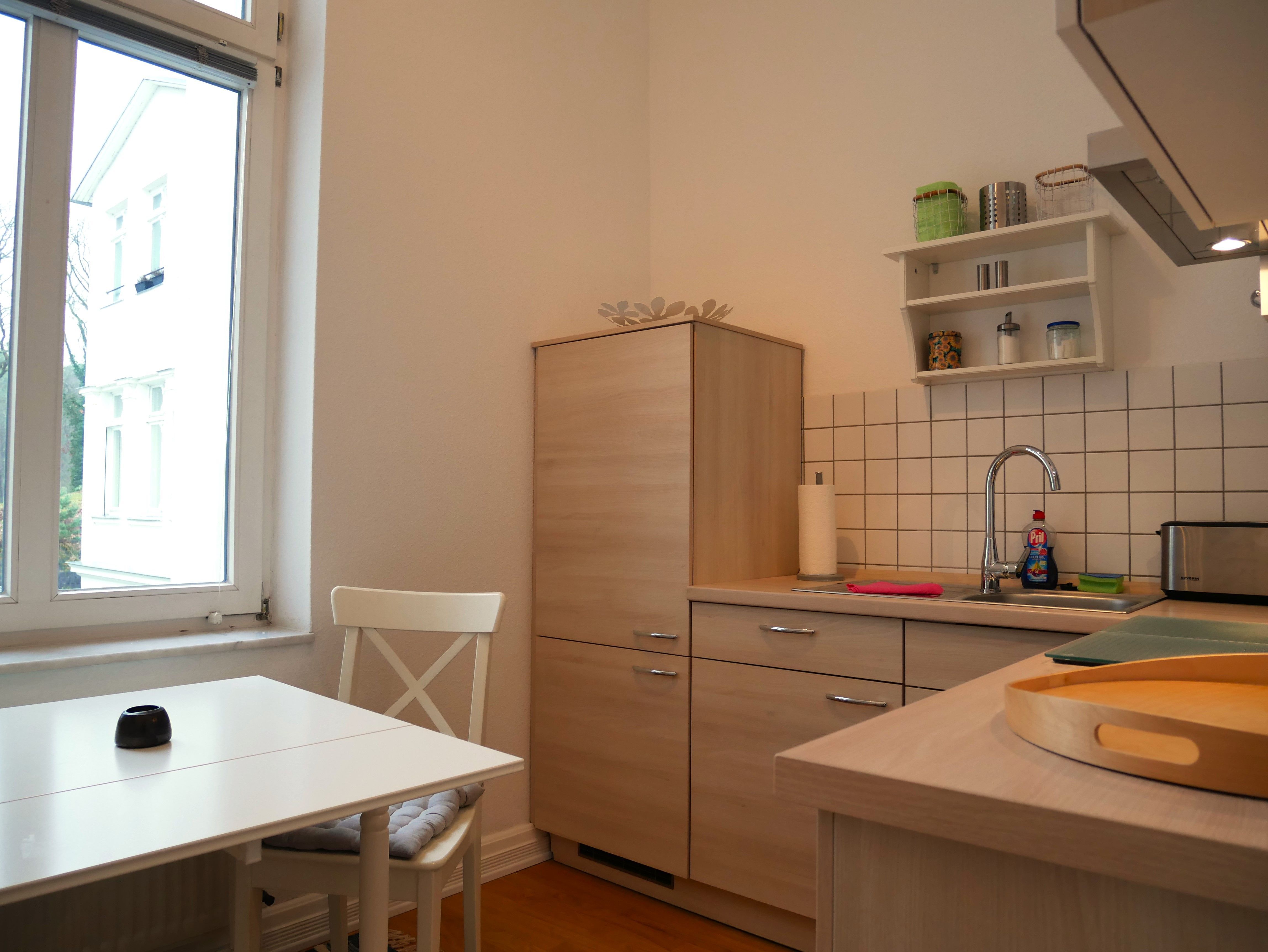 Das gemütliche 45 qm große 2- Raum Appartement liegt im 1 Obergeschoß und eignet sich für 2 Personen. Der Wohnraum ist mit einem gemütlichen Sofa und Flachbild Fernseher ausgestattet. Die Einbauküche verfügt über ein Cerankochfeld, Backofen, Kühlschrank mit Gefriermöglichkeit, Kaffeemaschine, Wasserkocher, Toaster sowie einen Esstisch.