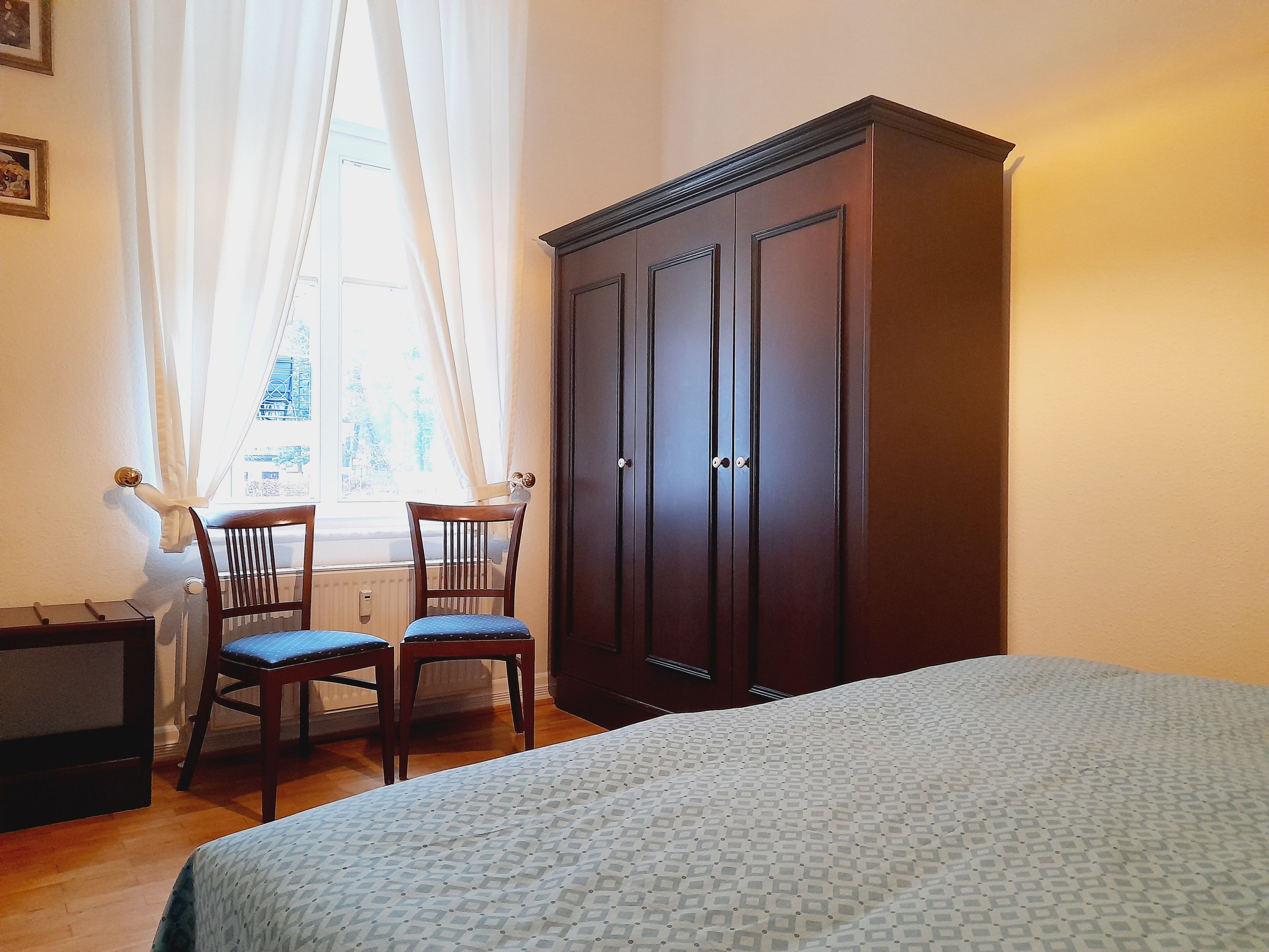 Im Schafzimmer befindet sich ein Doppelbett (1,80 x 2,00 m) und geräumigen Kleiderschrank. Das geflieste Badezimmer verfügt über Dusche, Waschtisch und Toilette. Die Münzwaschmaschine befindet sich im Haus.