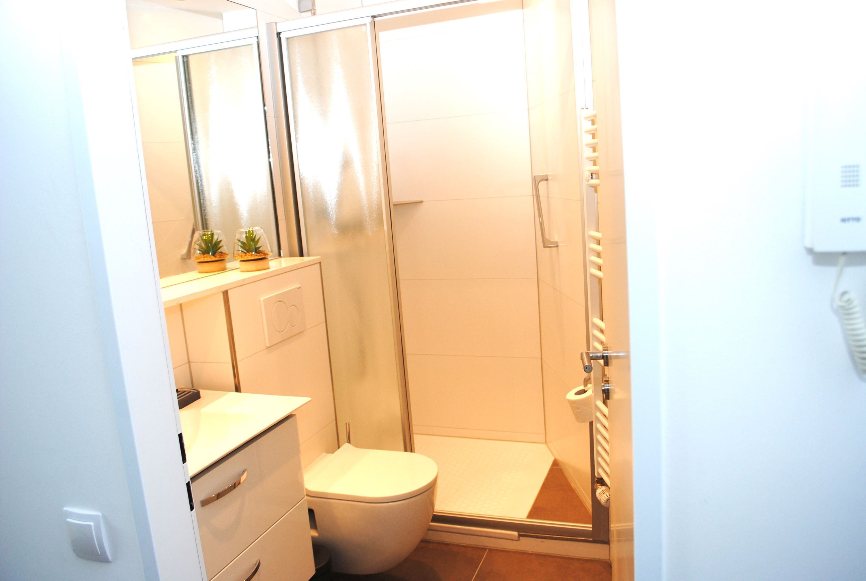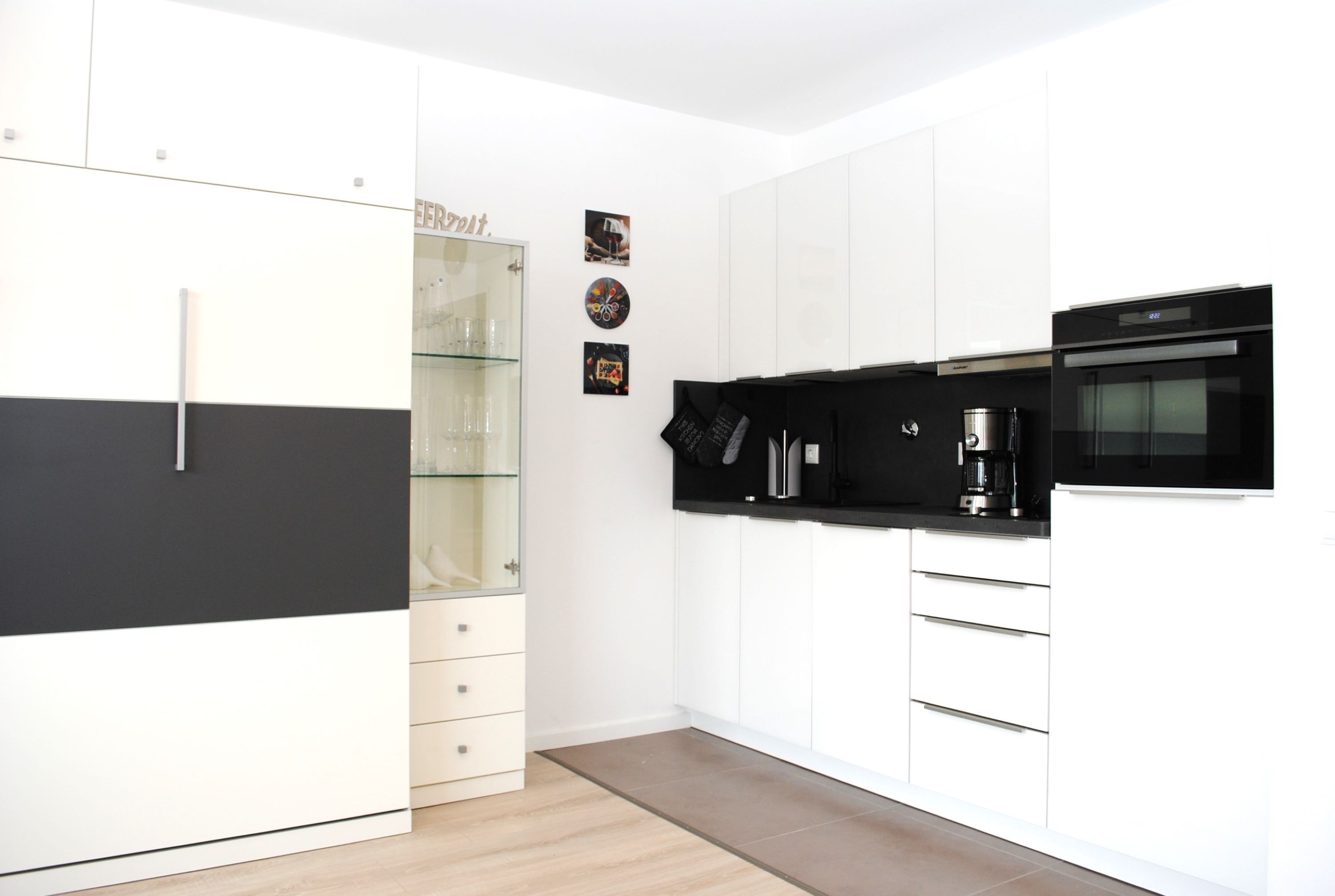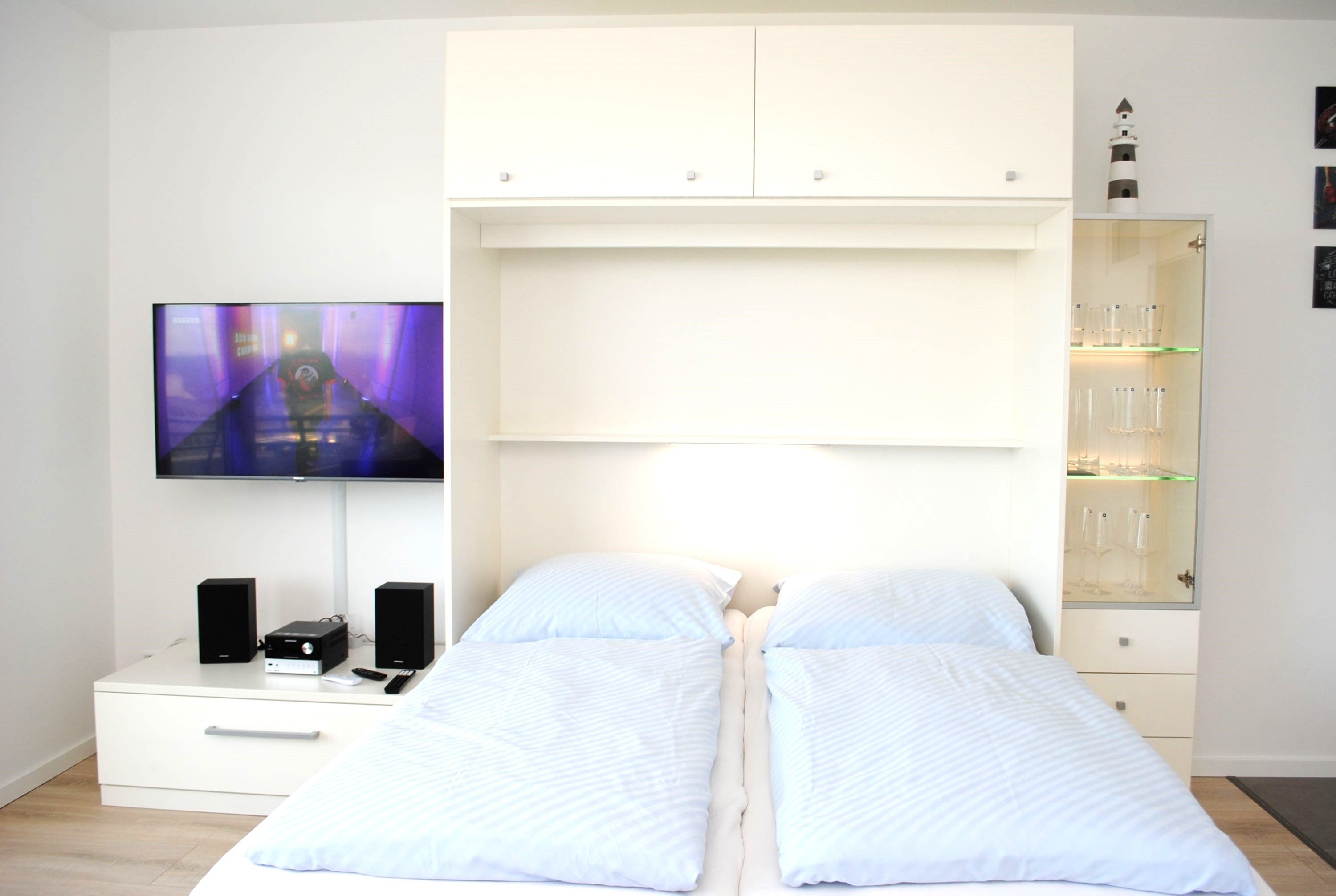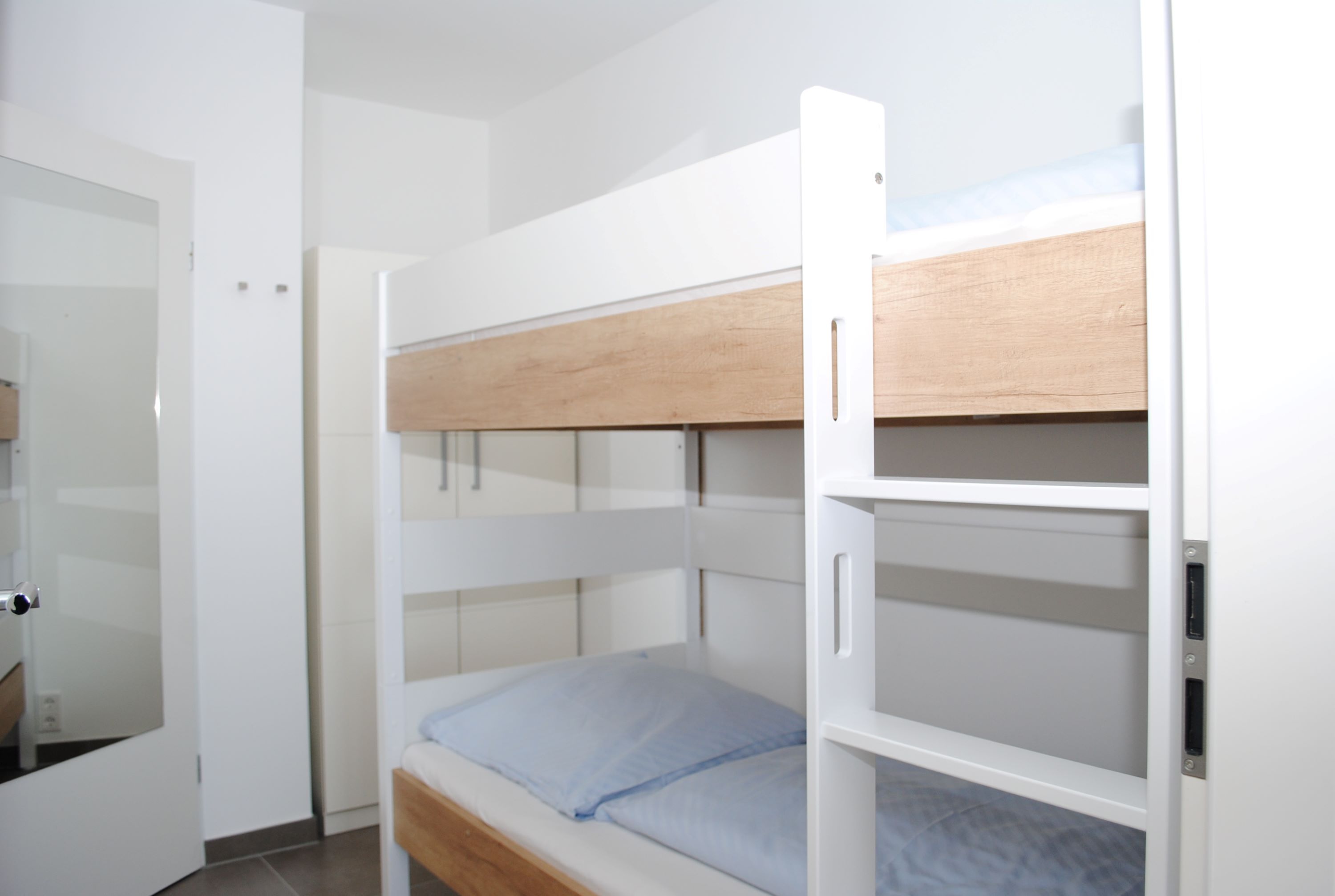 Das Apartment besteht aus einem Wohnbereich mit Schrankbett für 2 Personen, aus einem zusätzlichem Etagenbett in einer Nische im Flur und einem Badezimmer mit Dusche sowie WC. Die Ferienwohnung beinhaltet eine voll ausgestattete offene Küche.