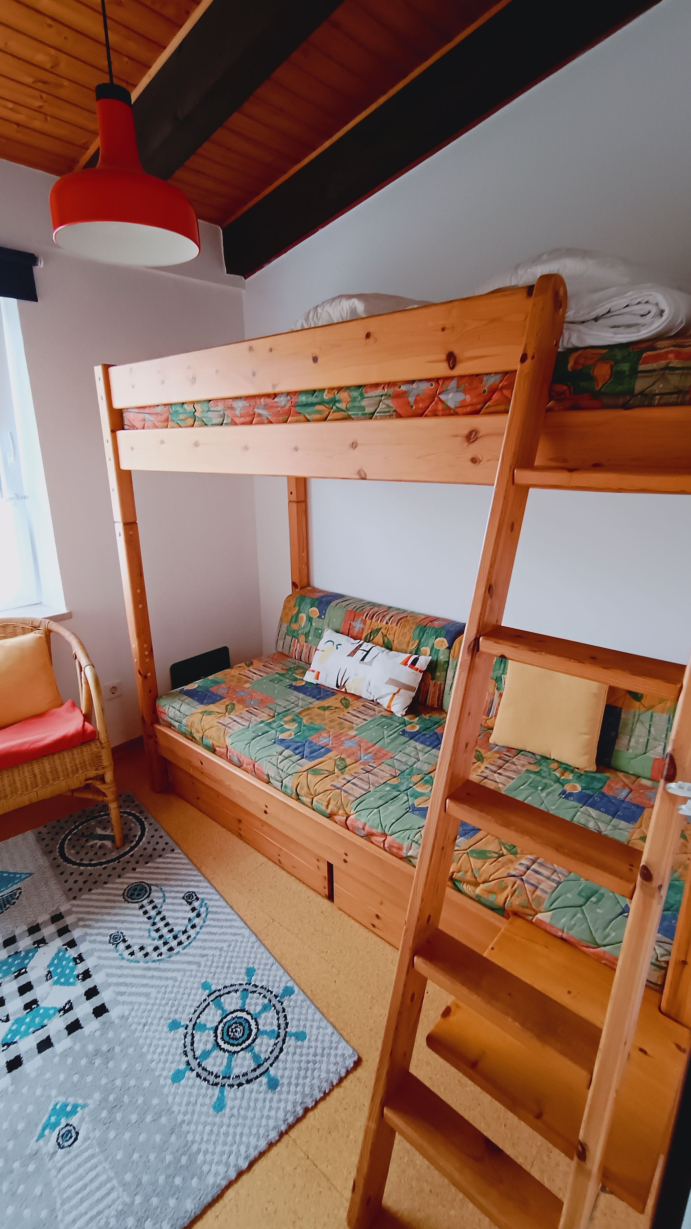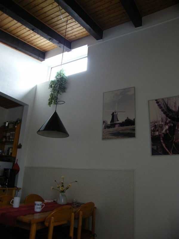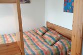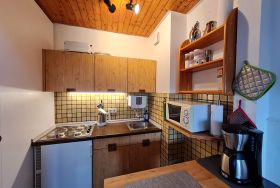 Die Wohnung ist 41 m² groß und besteht aus einem Wohnzimmer mit Küchenzeile und Essecke, einem Schlafraum mit Doppelbett und Balkon sowie einem weiteren Schlafraum mit Etagenbett. Das kleine Bad hat eine Duschkabine. Die Balken der Dachkonstruktion sind freigelegt und steigen auf eine Deckenhöhe von 4 m an. Ein zusätzliches Fenster oben lässt den Wohnbereich hell und großzügig erscheinen. - Bettwäsche und Handtücher sind bitte selbst mitzubringen. -