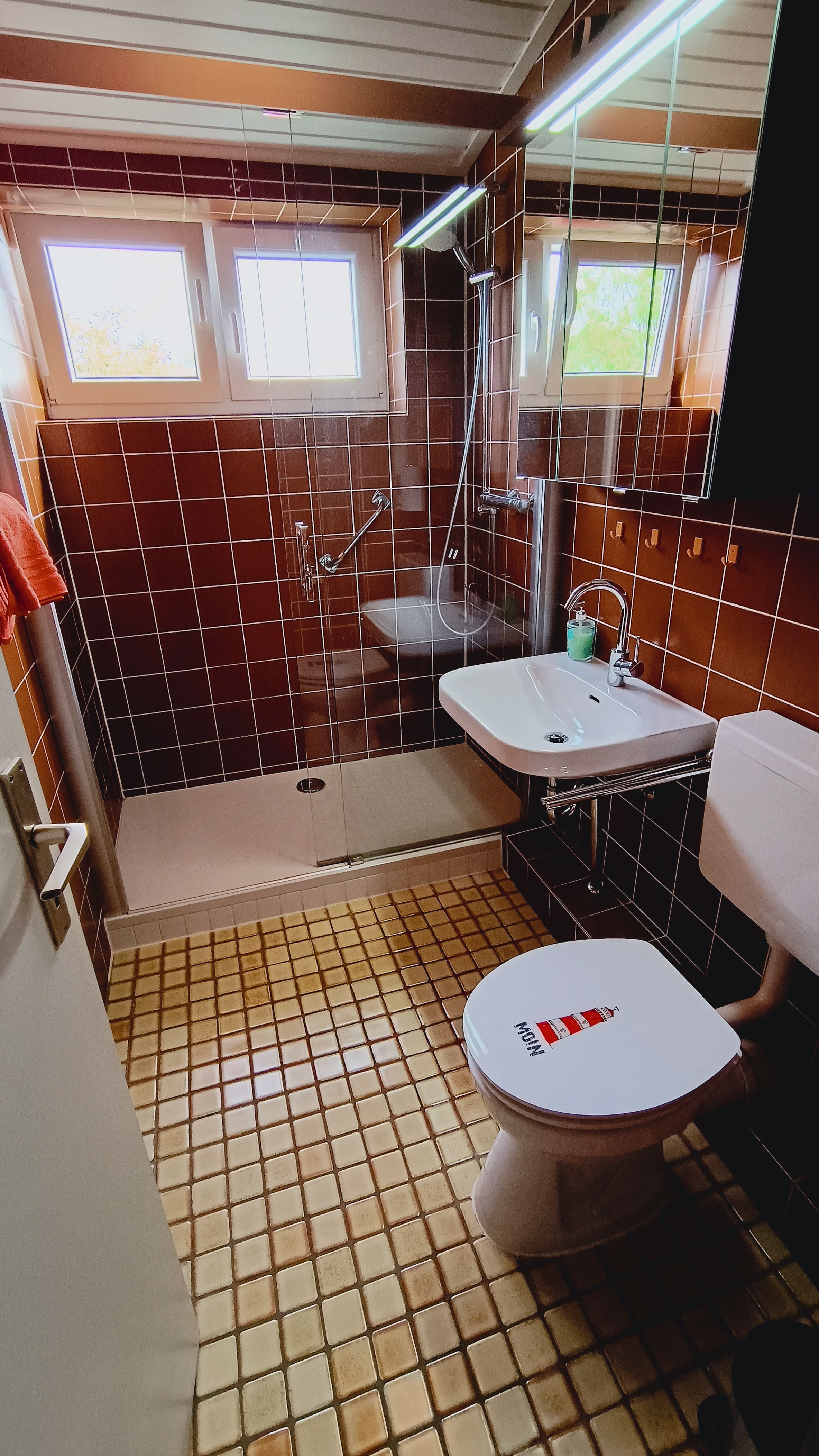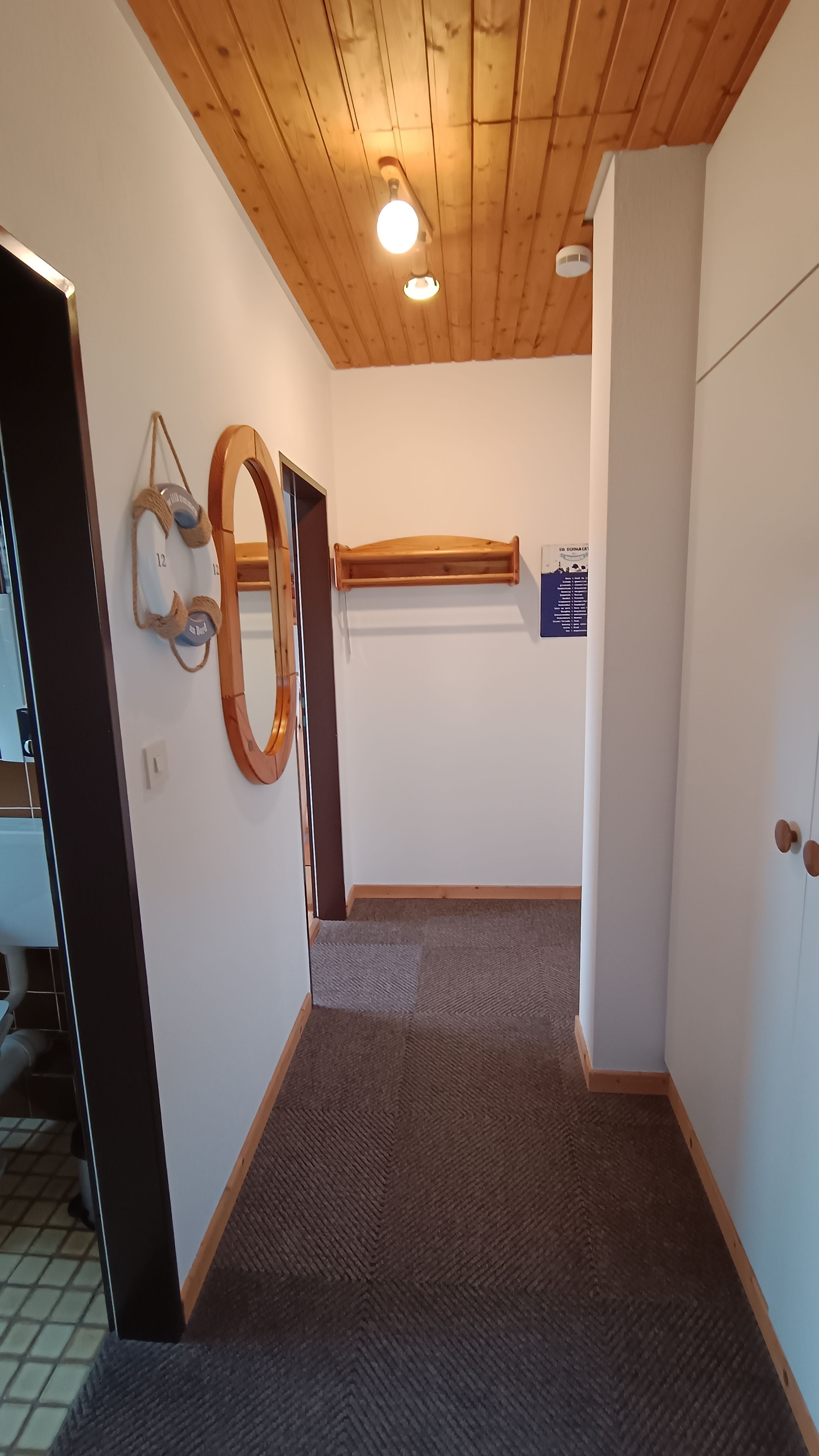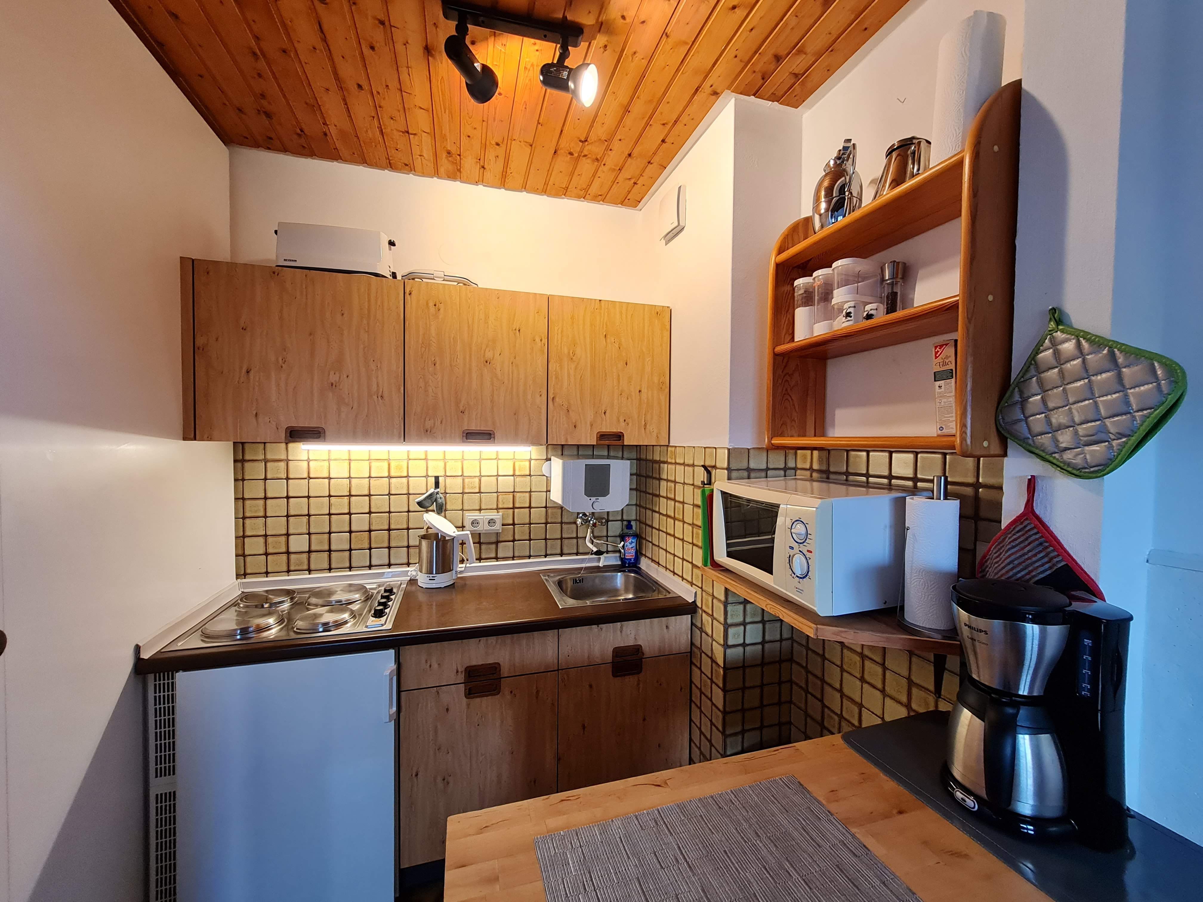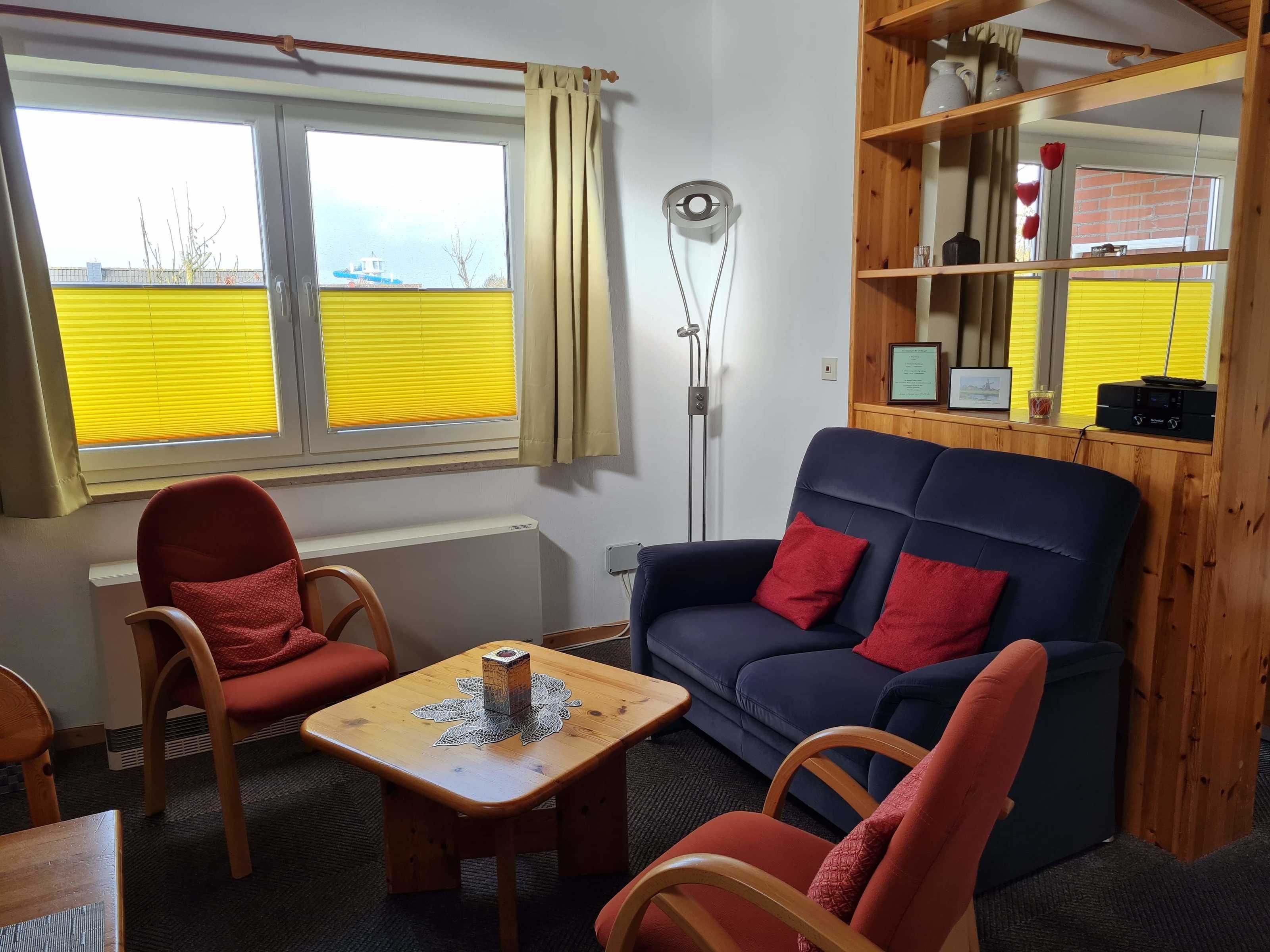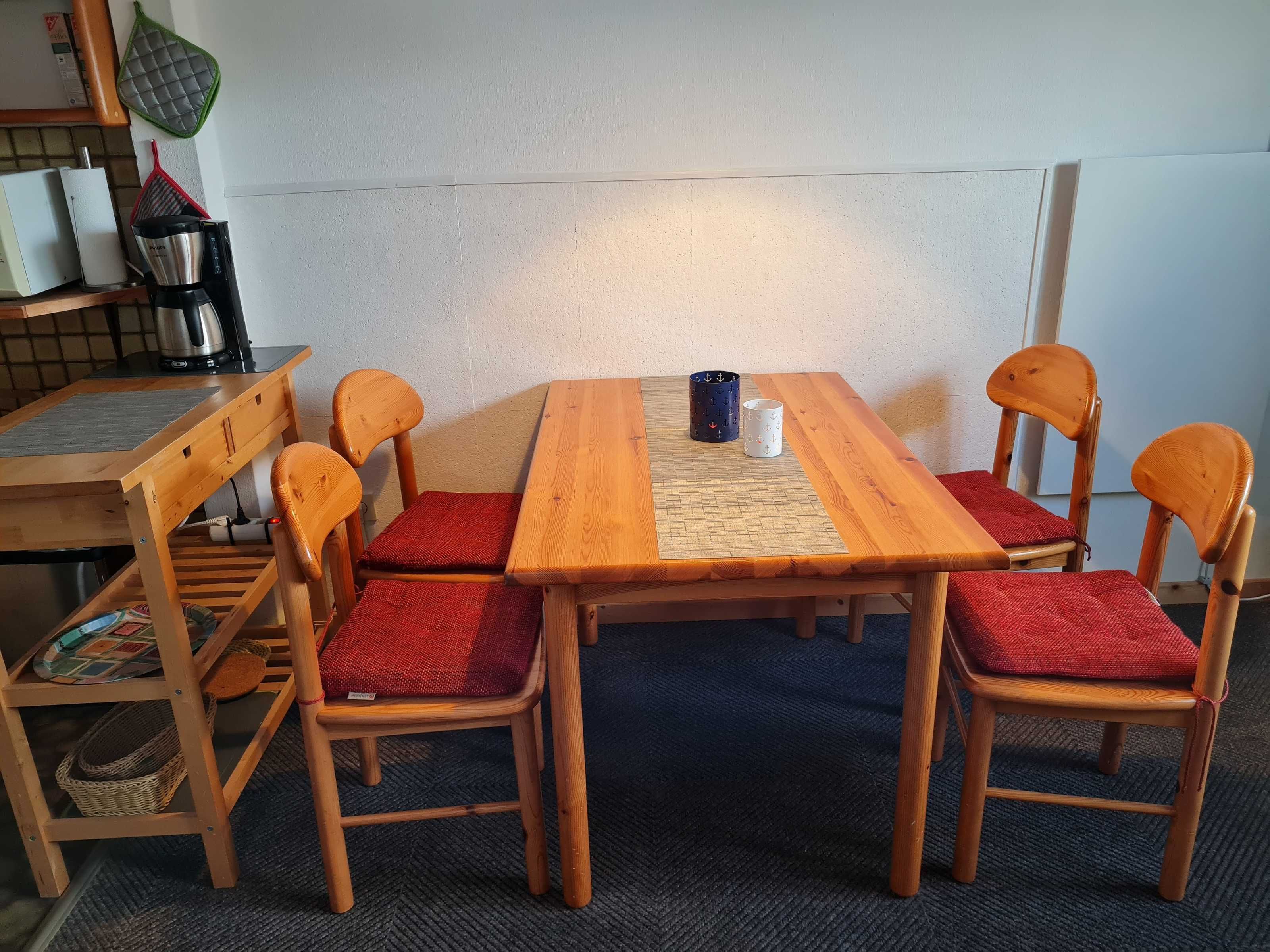 Unsere Wohnung ist ca. 41 m² groß. Sie besteht aus Wohnzimmer mit Essplatz und offener Küche, 1 Schlafraum mit Doppelbett, 1 Kinderzimmer mit Etagenbett, Duschbad, Flur mit Einbauschrank und Balkon mit Gartenmöbeln. Die Holzdecke im Wohnraum steigt von Zimmerhöhe auf über 4 m an, wobei die Balken der Dachkonstruktion freigelassen worden sind. Ein zusätzliches Fenster im oberen Bereich lässt die Räume großzügig und hell erscheinen. Es handelt sich um eine Nichtraucherwohnung, ebenso ist die Mitnahme von Haustieren nicht erlaubt. Für die Kinder gibt es einen Hochstuhl, Bobby Car, Bollerwagen, Sand- und Spielsachen u.v.m., für die Großen SAT-TV, CD- und DVD-/Blu-ray-Player, Bücher und Spiele.