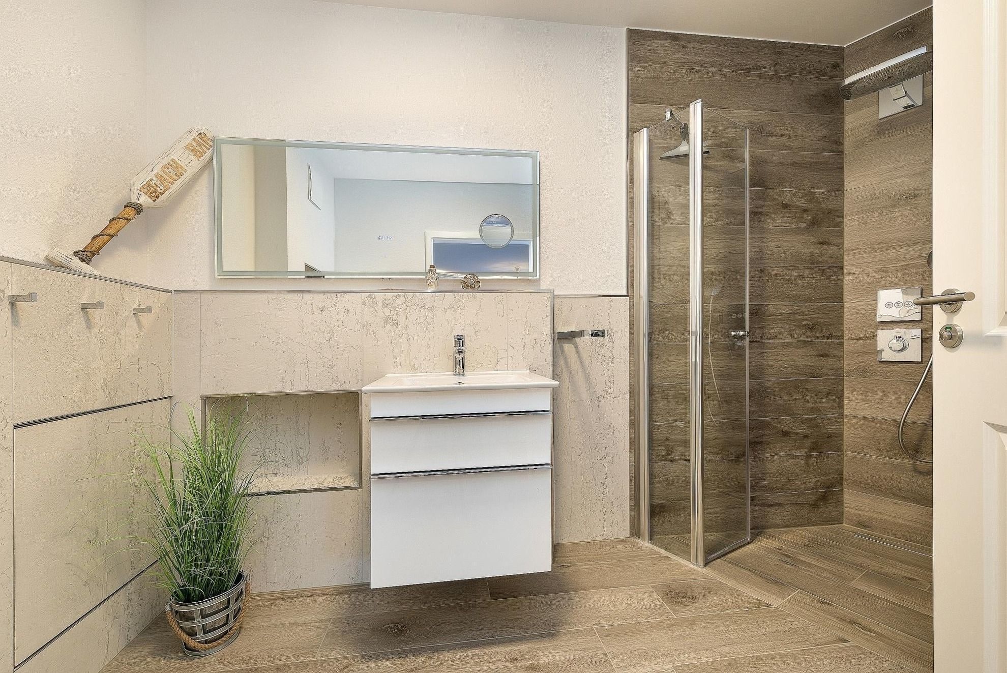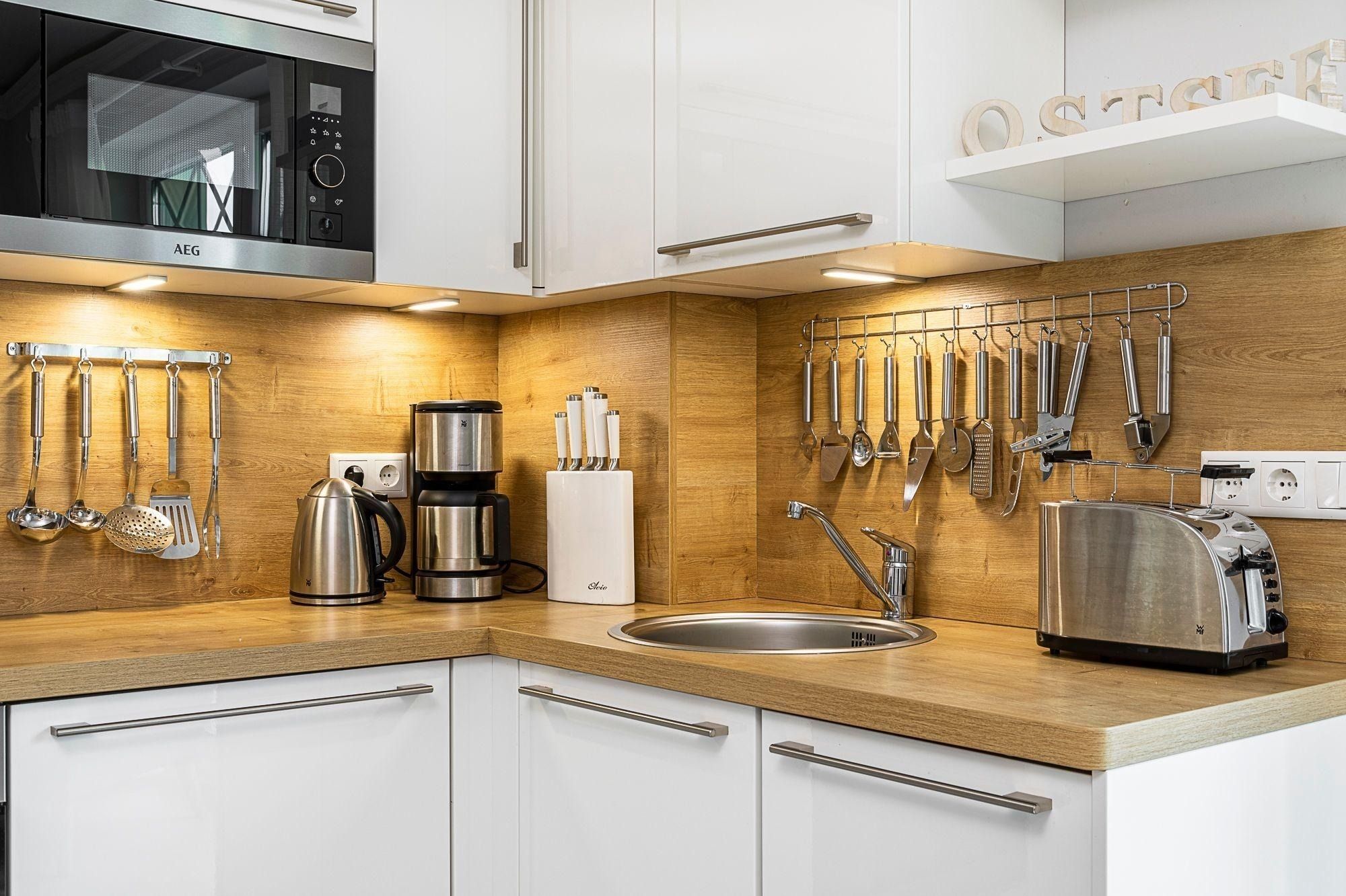 Die Ferienwohnung bietet eine durchdachte Ausstattung, die sowohl Komfort als auch Funktionalität vereint. Sie verfügt über zwei geschmackvoll eingerichtete Schlafzimmer, eines mit einem Doppelbett und eines mit einem Einzelbett, ideal für Familien oder Gruppen. Die offene Küche ist mit modernen Geräten wie Geschirrspüler, Backofen, Mikrowelle und einer Kaffeemaschine ausgestattet, um kulinarische Wünsche zu erfüllen. Das Badezimmer bietet eine bodengleiche Dusche sowie einen Kosmetikspiegel und ist durch ein Fenster gut belüftet.