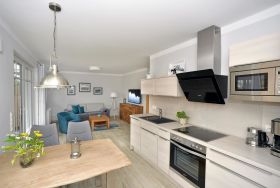 Diese neu gebaute Ferienwohnung im Zentrum von Zingst bietet auf 2 Zimmern modernen Komfort und eine hochwertige Ausstattung. Das Schlafzimmer ist mit einem bequemen Doppelbett und einem großen Kleiderschrank ausgestattet, ergänzt durch einen Flat-TV. Das Wohnschlafzimmer besticht durch eine gemütliche Couch, die sich in ein zusätzliches Bett (170x200 cm) verwandelt.