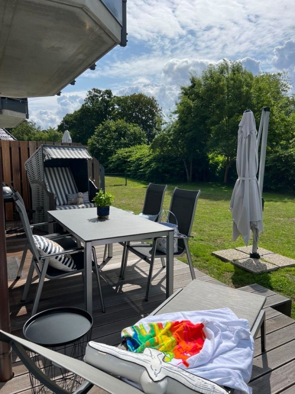 Die Ferienwohnung bietet einen idyllischen Außenbereich mit einem eigenen Garten, der zum Entspannen einlädt. Sonnenliegestühle und Gartenliegen stehen bereit, um die Natur in vollen Zügen zu genießen. Ein Elektrogrill ermöglicht gesellige Grillabende im Freien. Zudem sorgt eine E-Ladestation für Autos für zusätzlichen Komfort während des Aufenthalts.