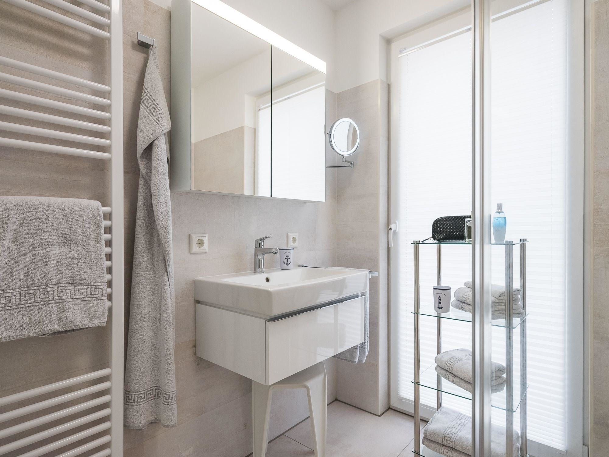 Das stilvolle Badezimmer mit Fenster und bodengleicher Dusche bietet zusätzlichen Komfort. Zur Ausstattung gehören zudem WLAN, TV, Kamin/Kachelofen sowie zahlreiche Küchenhelfer wie Mixer und Espressomaschine.