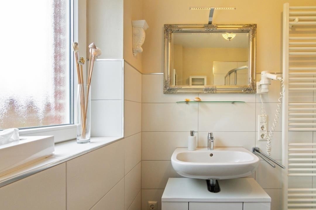 Das Badezimmer verfügt über Tageslicht und ist eine kleine Wohlfühloase, mit einer Dusche, einem WC, Spiegel und einer heizbaren Handtuchhalterung.