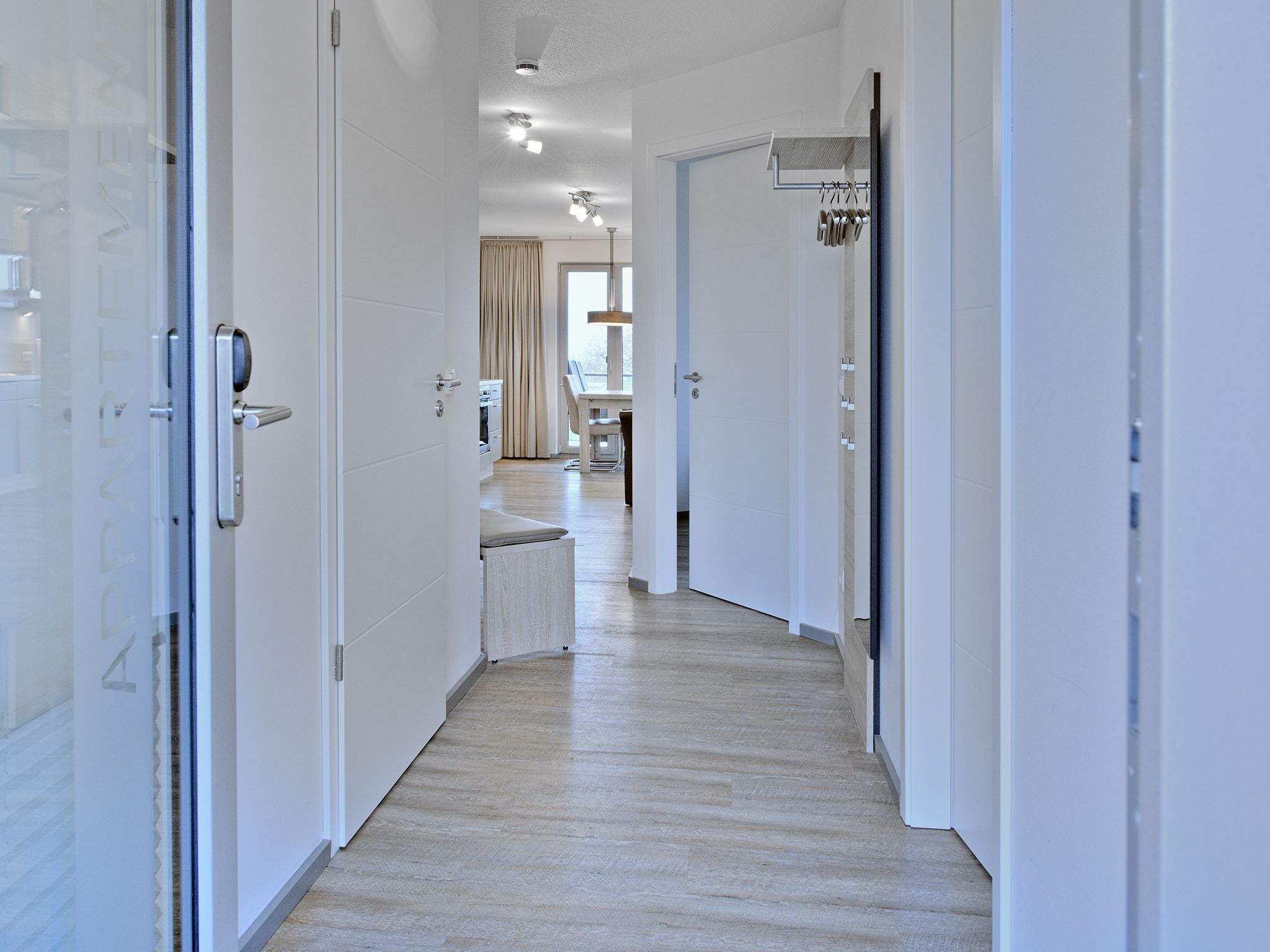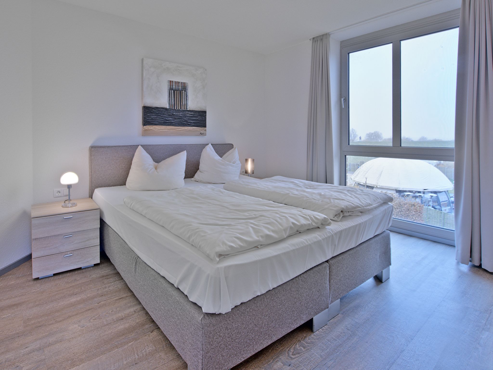 Die Appartements der Kategorie D3 R3 im Haus Lee verfügen über zwei separate Schlafzimmer, Wohn-, Koch- und Essbereich sowie einem Balkon mit direktem Blick auf die Elbe.