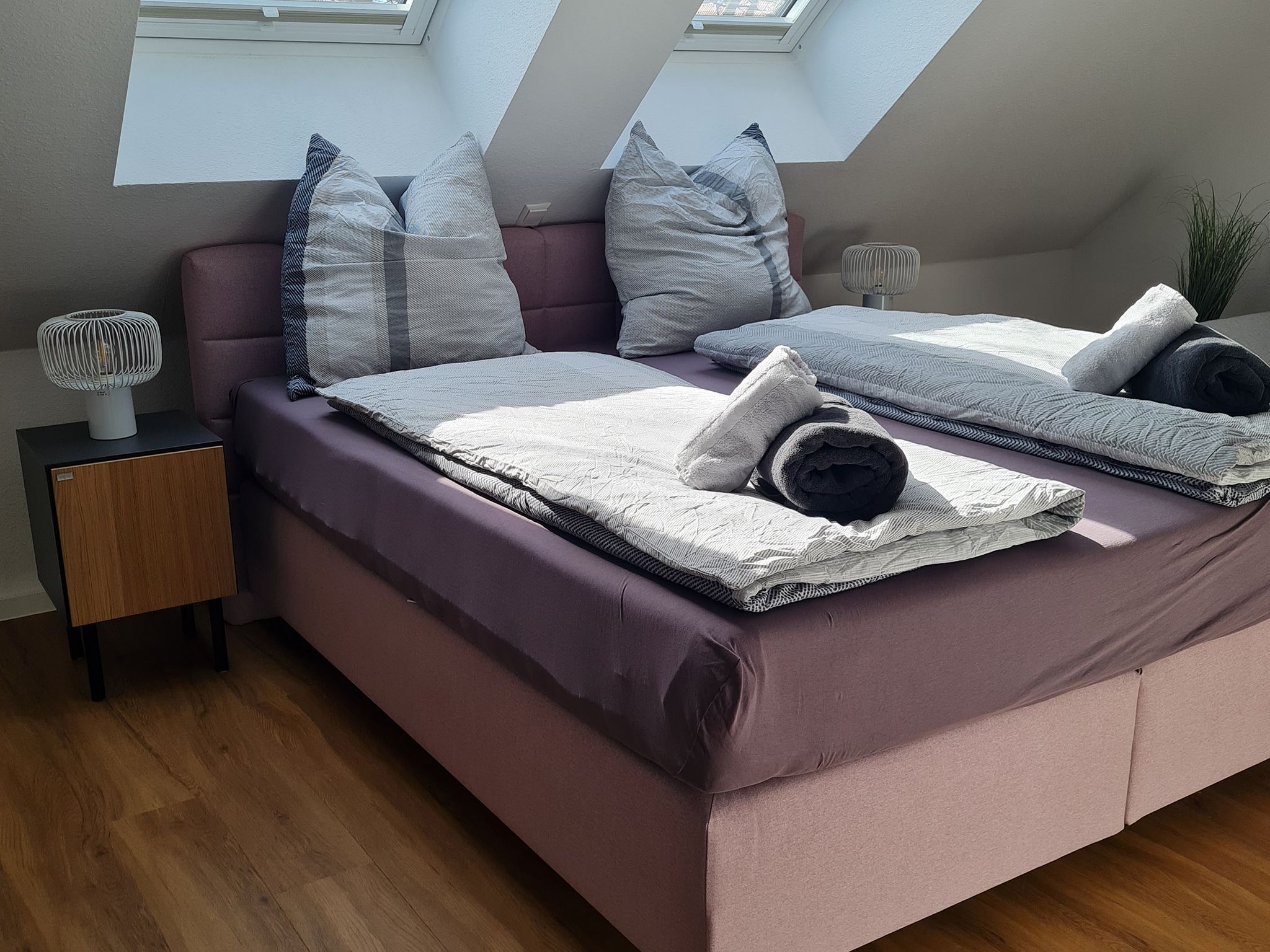 • Schlafzimmer 2 im Obergeschoss: Doppelbett 180x200 cm (Boxspring) plus Schlafsofa
