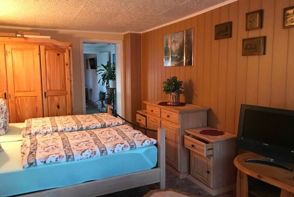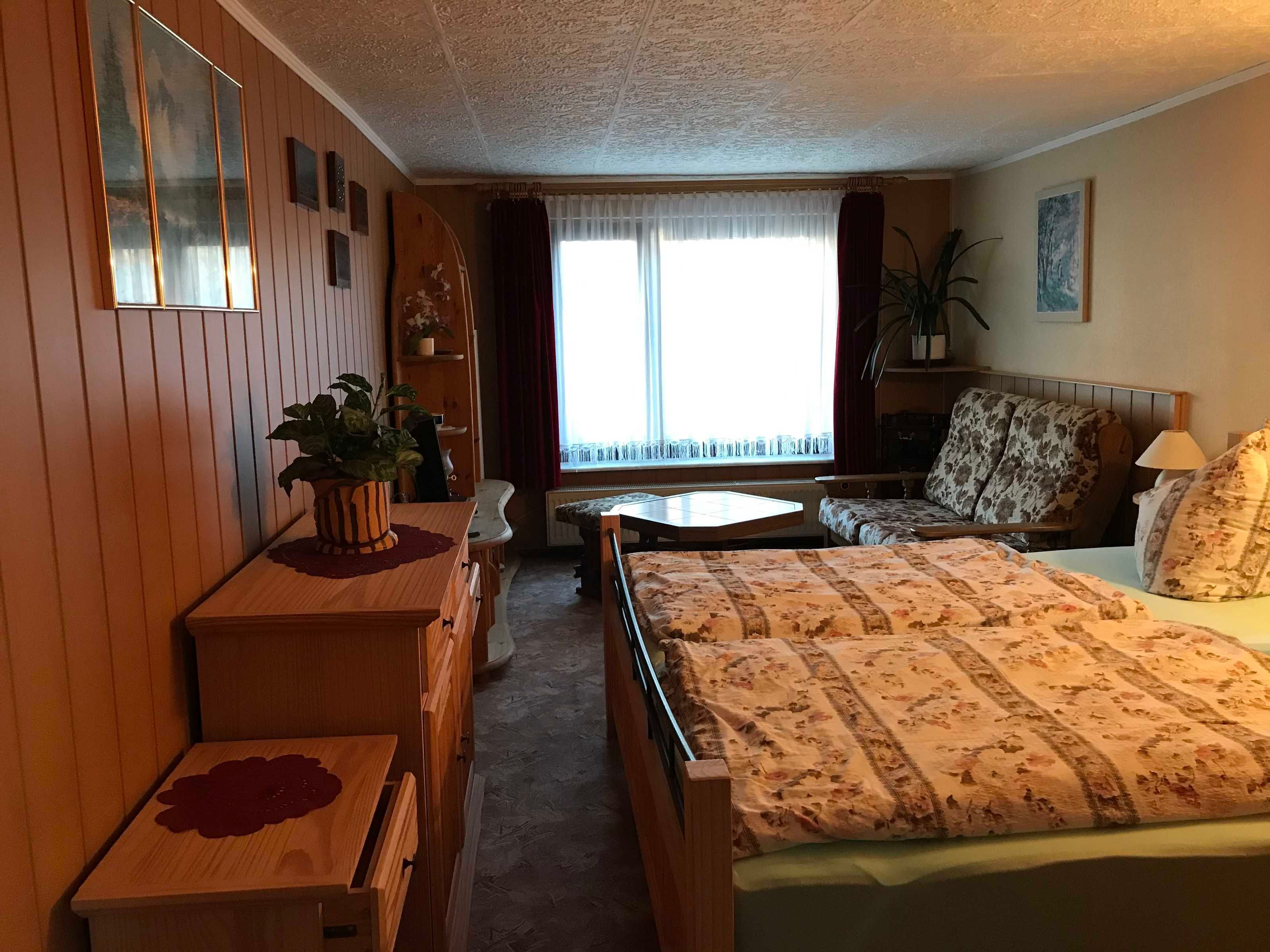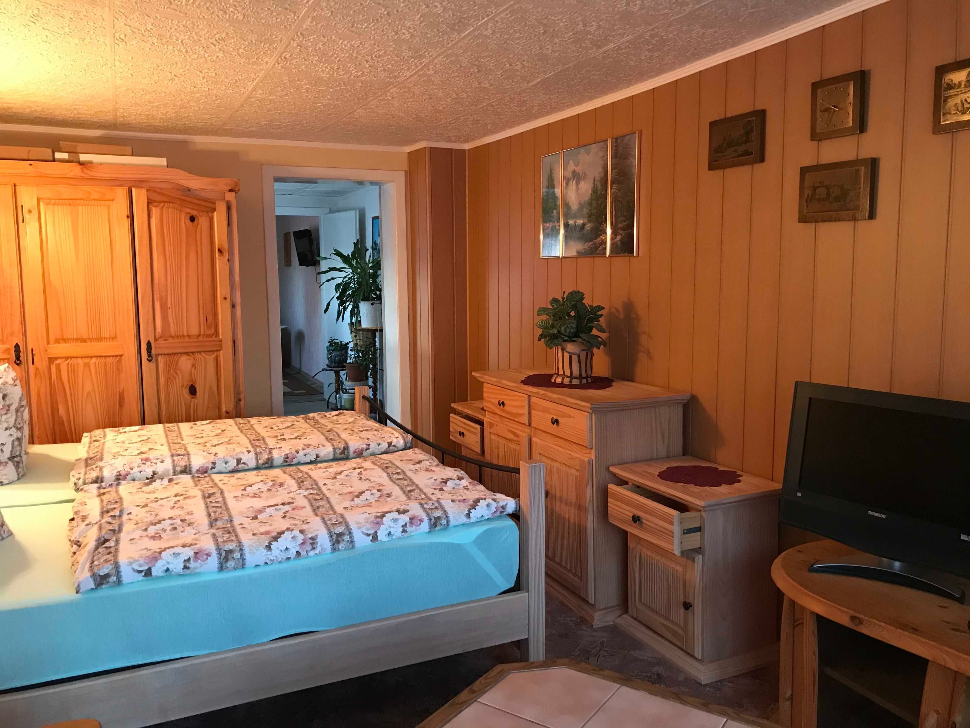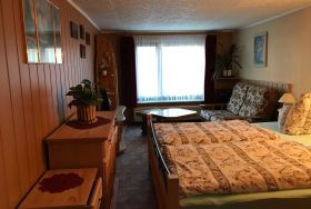 • Im Obergeschoss: kombinierter  Wohn-Schlafraum (Ehebetten, zwei Beistellschränkchen, Kleiderschrank, Schrankwand, Couch (2-Sitzer), Hocker und Tisch) - durch ein zweites Zimmer mit einer Schlafcouch besteht die Möglichkeit, getrennt zu schlafen.