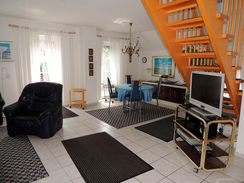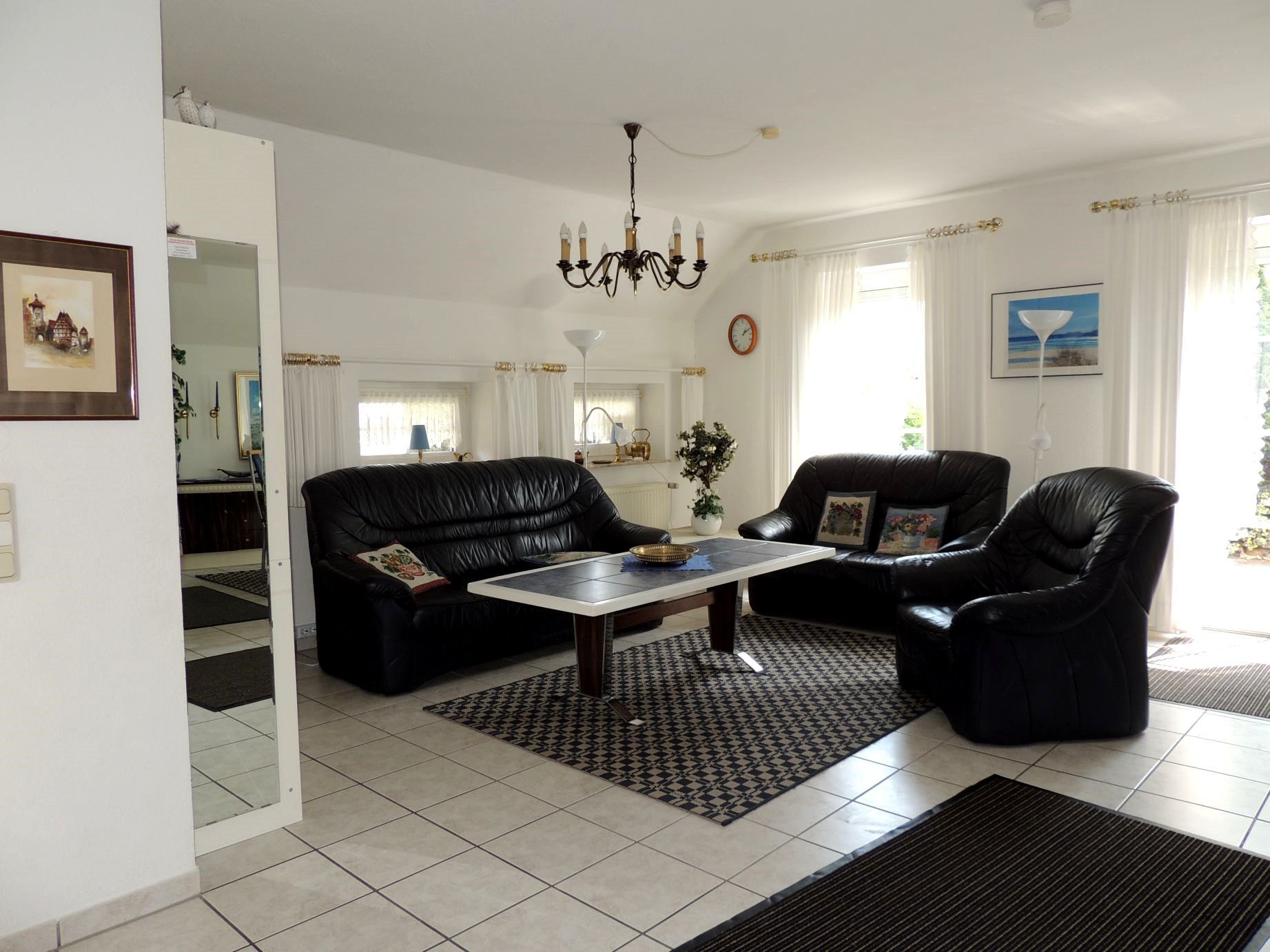 Erdgeschoss: Grosszügiges Wohn- und Esszimmer mit hochwertiger Ledergarnitur und grossem Flachbild-TV mit Satempfang, DVD-Player und Radio mit CD-Player. Esstisch mit Bestuhlung.