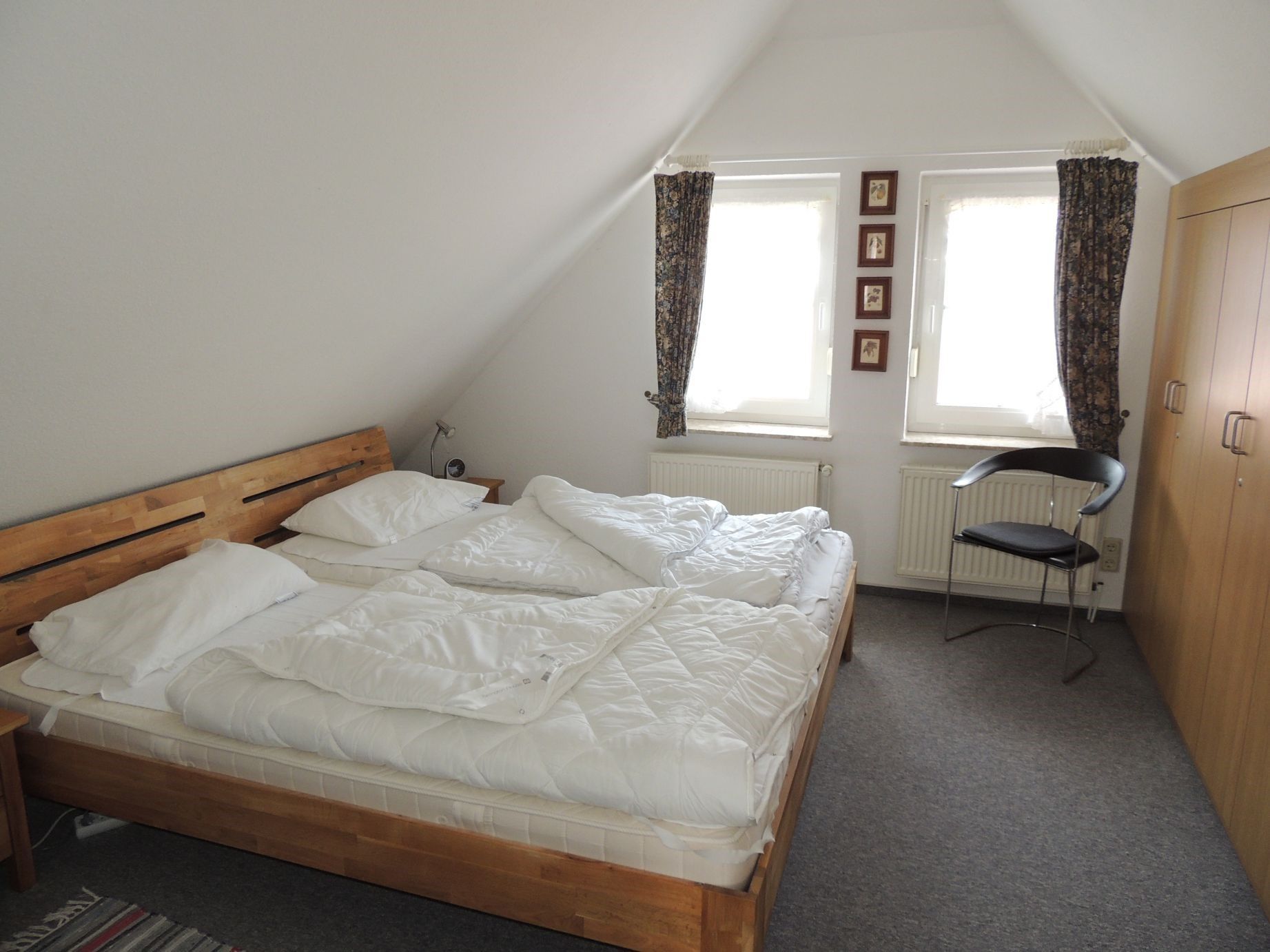 Obergeschoss: 1 Schlafzimmer mit Doppelbett. 1 Schlaf-/Kinderzimmer mit 2 Einzelbetten und einem festen Kleinkinderbett mit Gitter. Zusätzliches Gäste-WC.