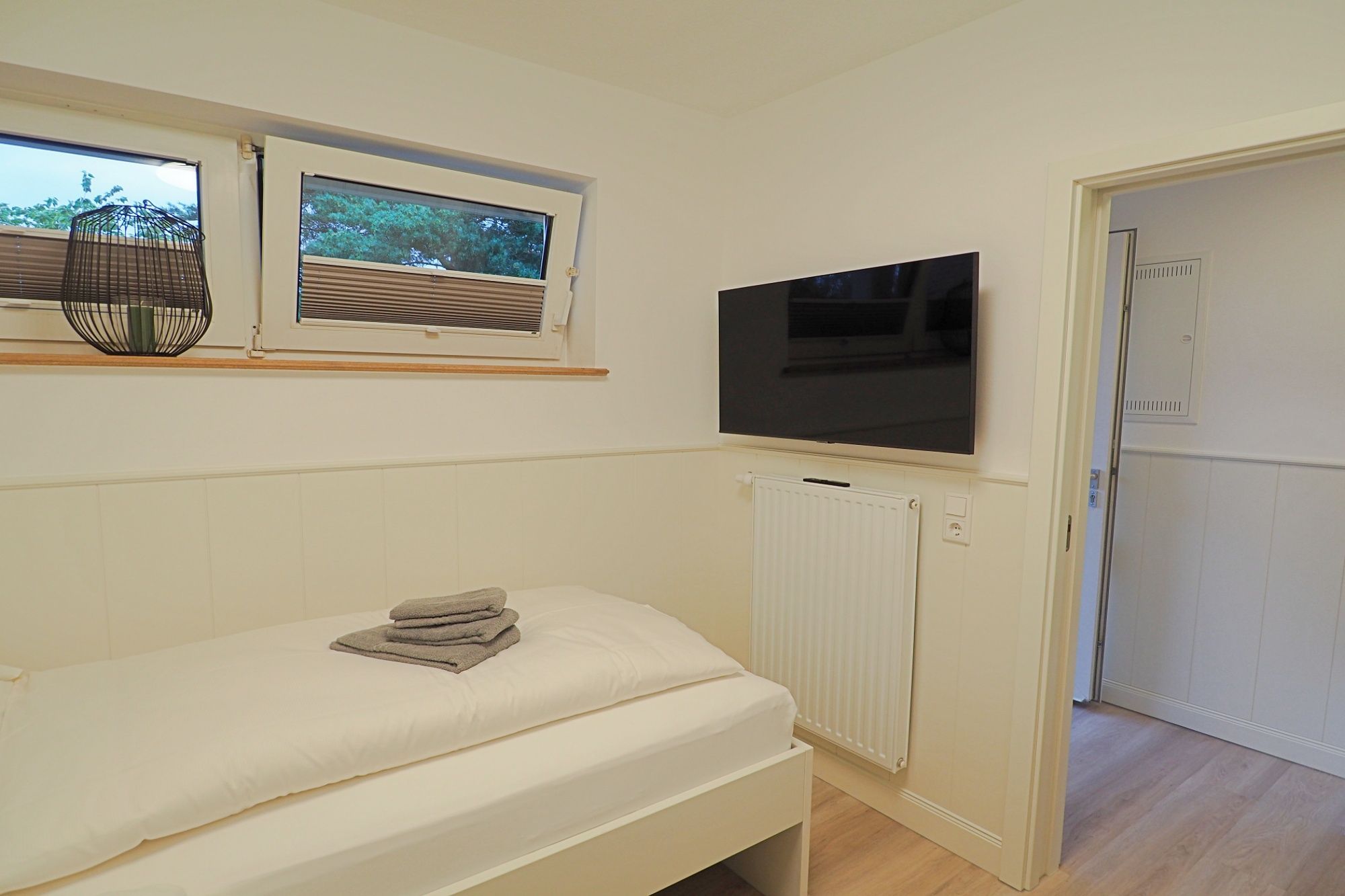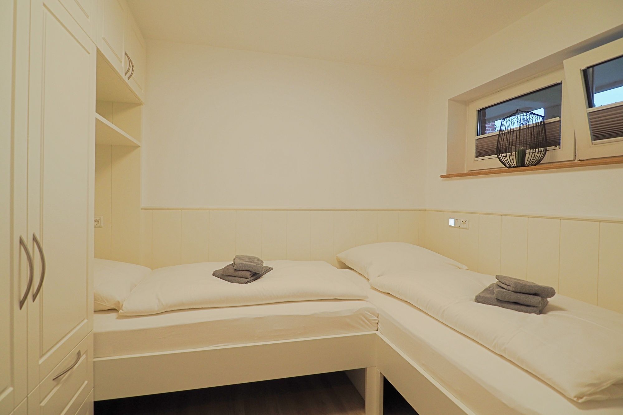 Ihnen steht ein Schlafzimmer mit zwei Einzelbetten (0,90m x 2,00m) über Eck, ein Einbaukleiderschrank mit ausreichend Stauraum und ein 43 Smart-TV zur Verfügung.