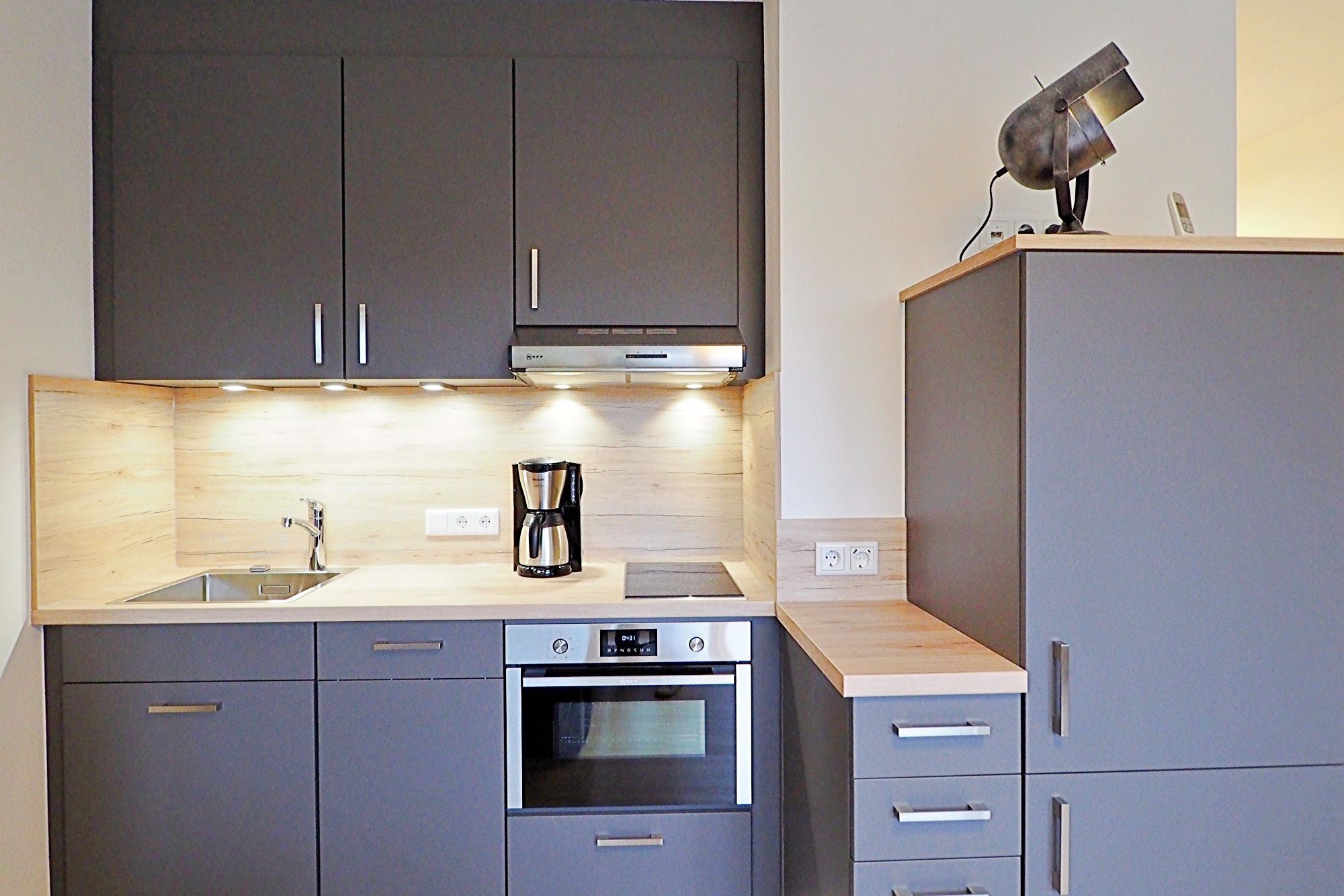 In dem offenen Wohn- und Essbereich befindet sich die neue, voll ausgestattete Küche mit einem Backofen-Mikrowellen Kombigerät, 2 Zonen Ceranfeld, Kühlschrank mit extra Gefrierschrank und Spülmaschine.