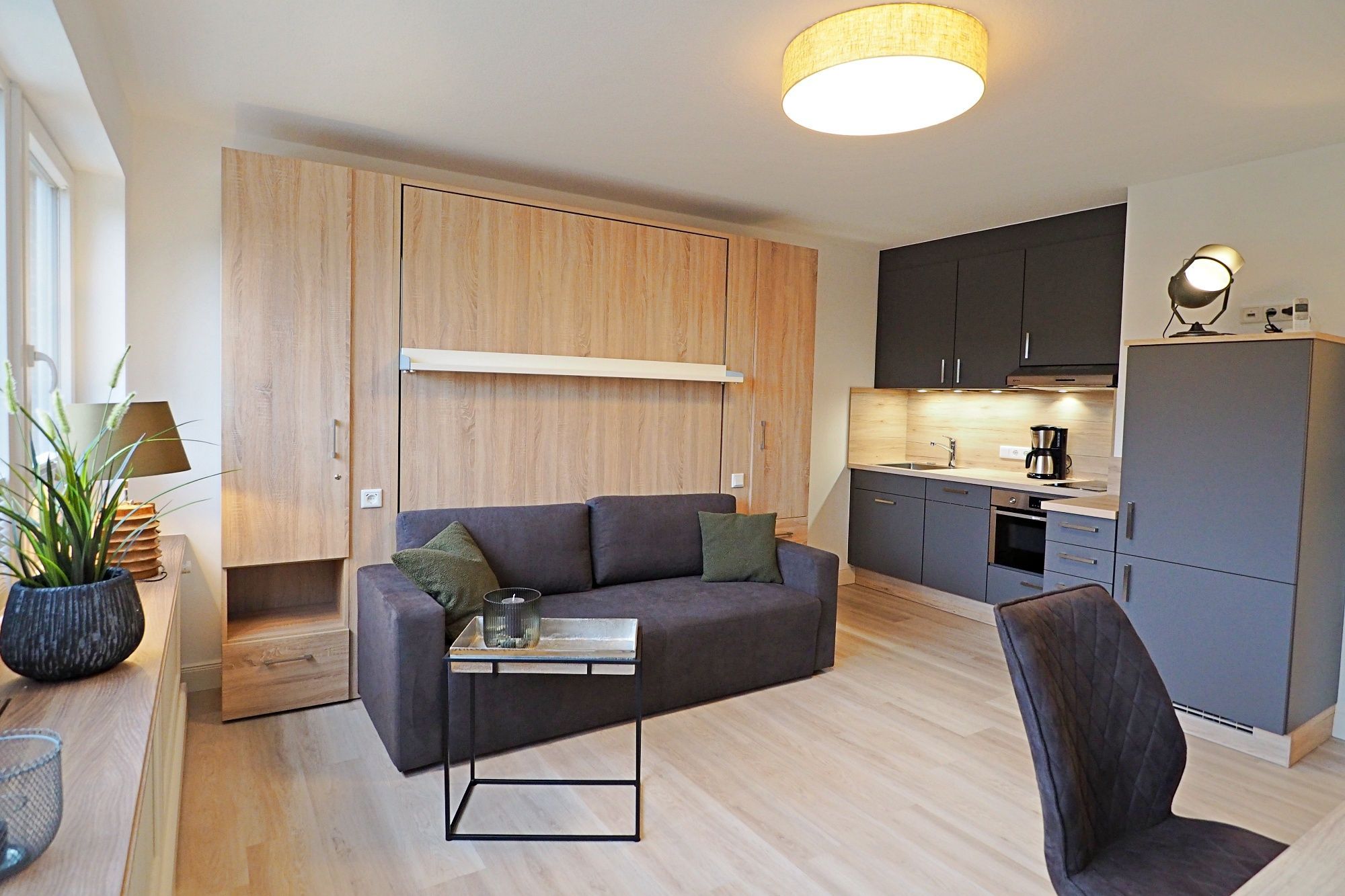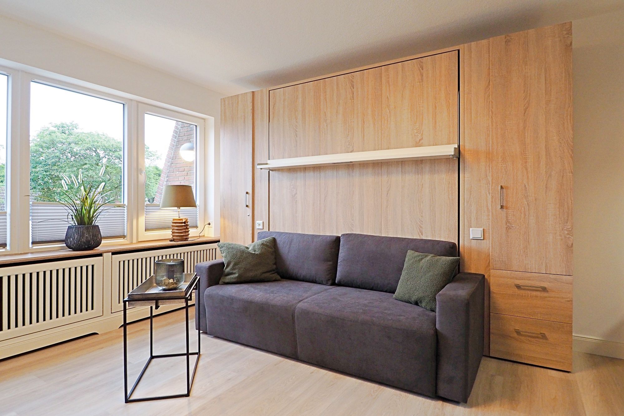 Der Clou im Wohnzimmer ist das versteckte Schrankbett (1,60m x 2,00m) hinter dem Sofa für eine eventuell dritte Person.