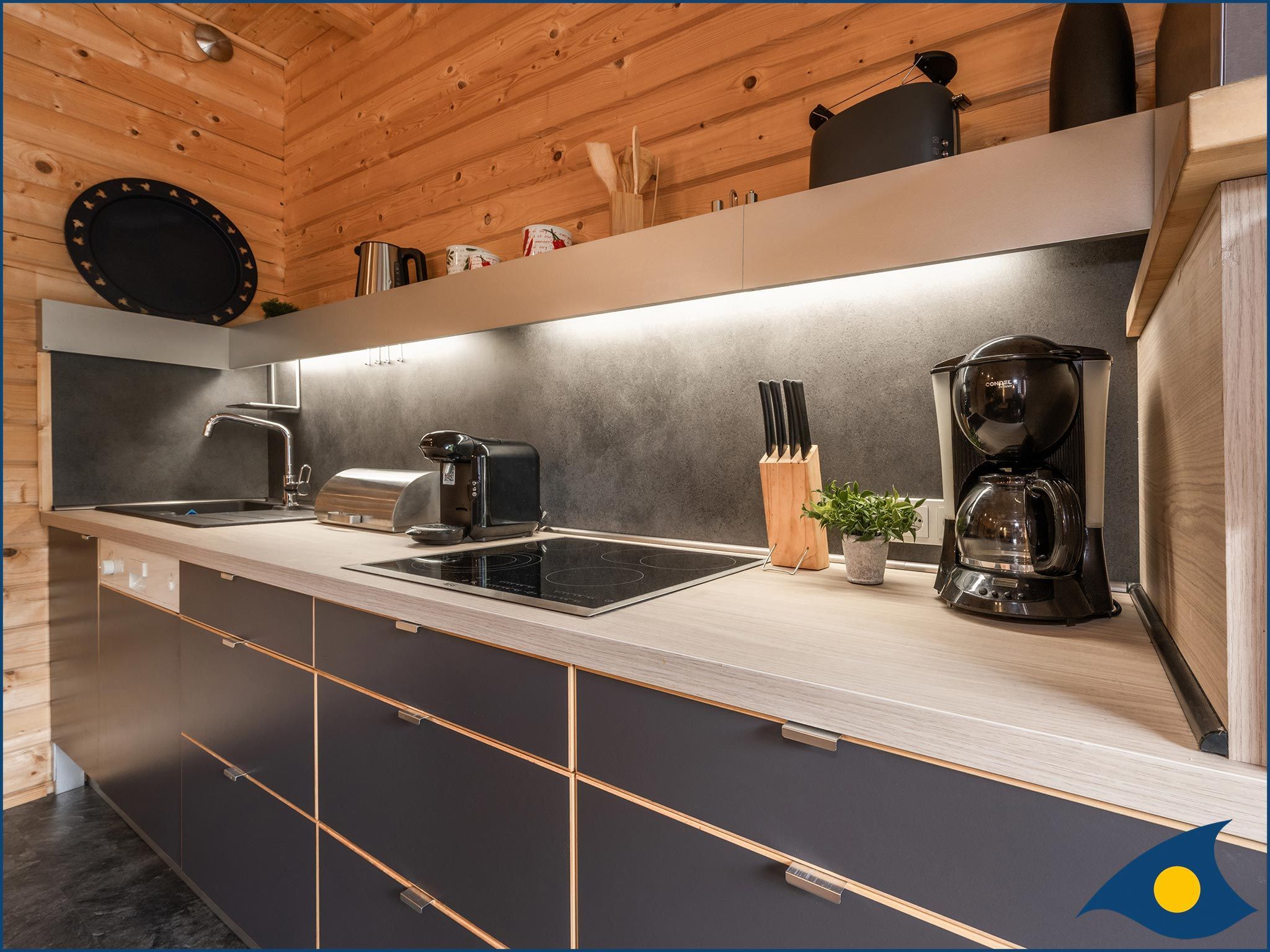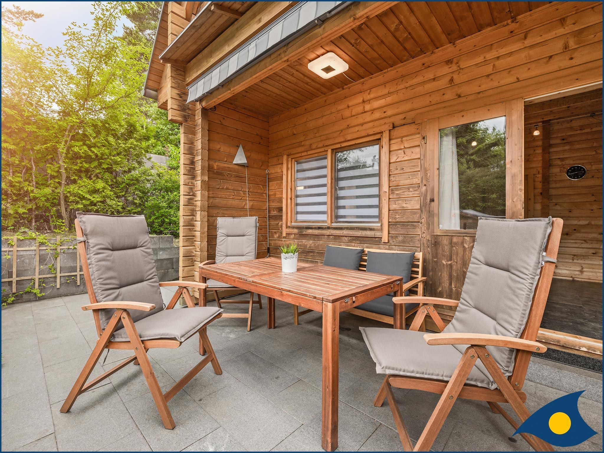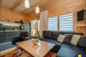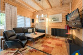 Das helle und modern ausgestattete Holzferienhaus erwartet Sie mit einer gemütlichen Sofalandschaft im Wohnbereich zum Entspannen und für gemeinsame Spiele oder Fernsehabende. Von hier gelangt man auch direkt auf die Terrasse mit großzügigem Platz zum Entspannen. Die gut ausgestattete Küchenzeile mit Cerankochfeld, Spülmaschine, Kühlschrank mit Tiefkühlfach, Mikrowelle mit Grill- und Backofenfunktion lädt zum gemeinsamen Kochen ein. Im Erdgeschoss befindet sich auch das Badezimmer mit Dusche / WC und ein kleiner HWR sowie ein Essplatz in der Diele.