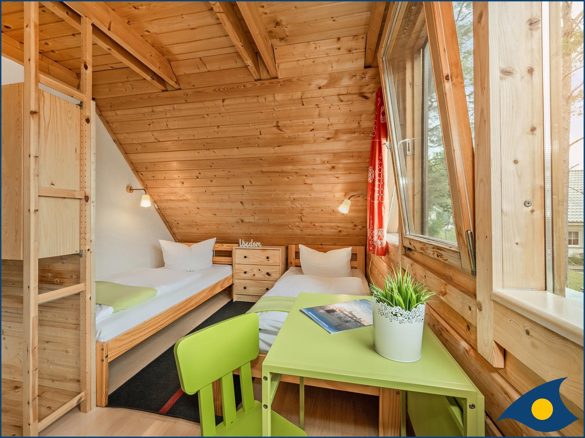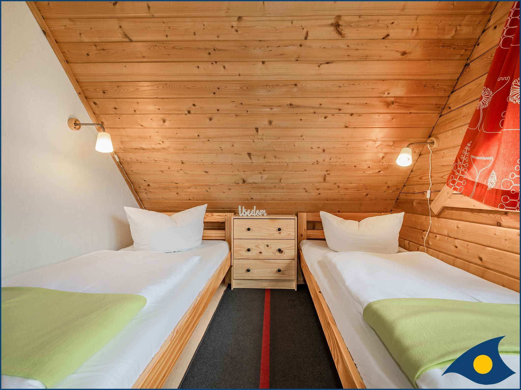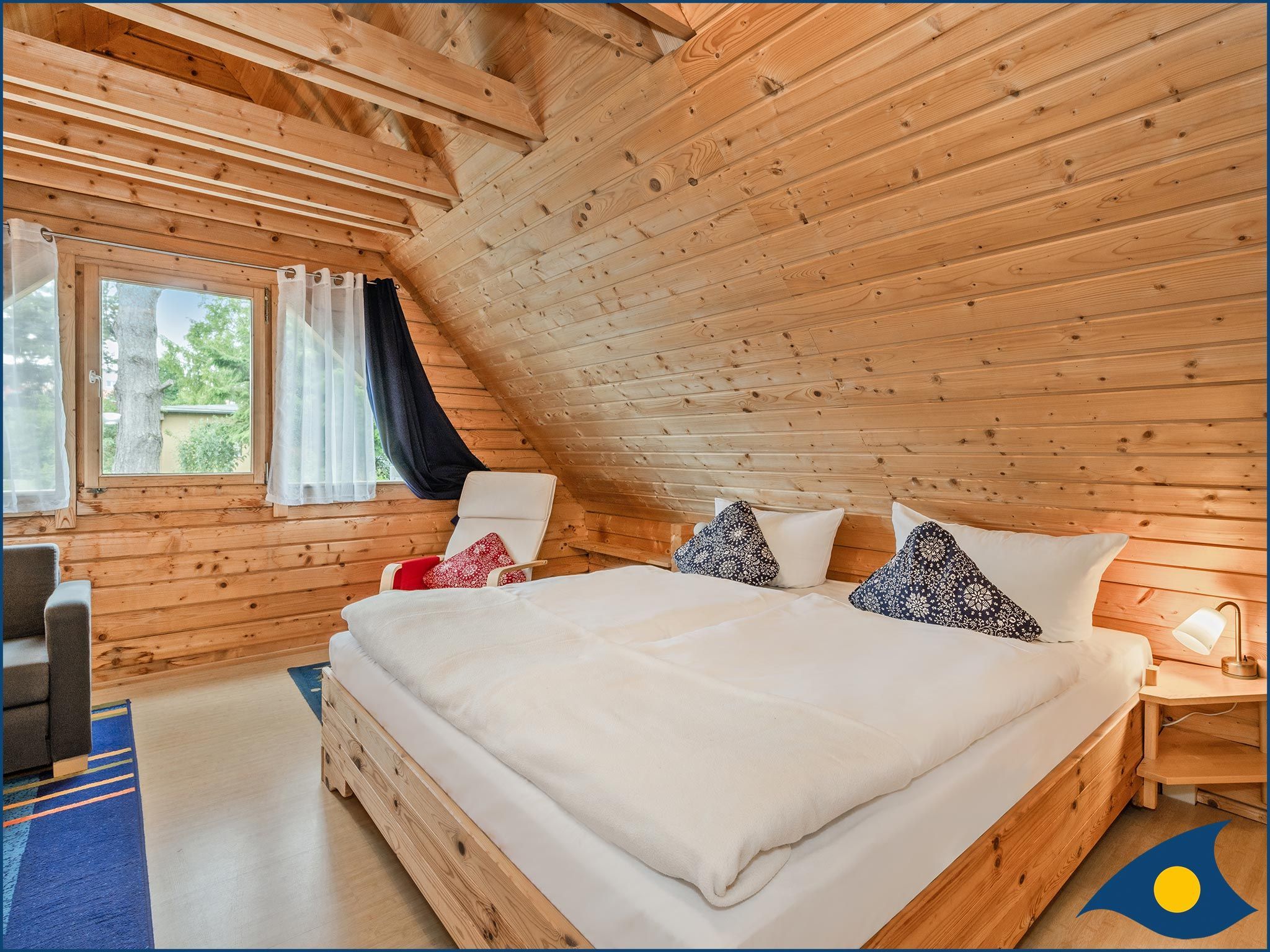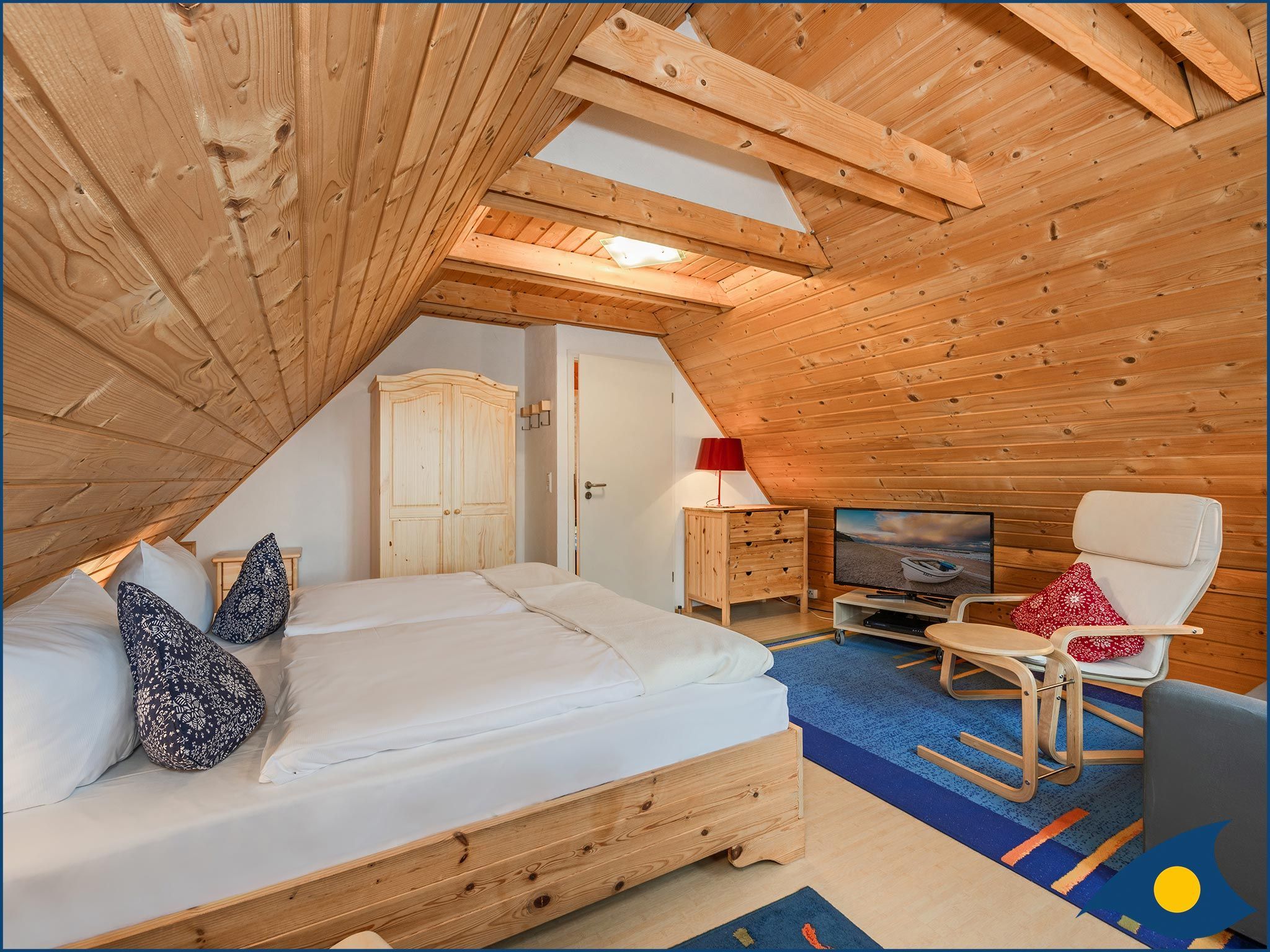 Beide Schlafzimmer liegen im Obergeschoss, eins mit einem bequemen Doppelbett und eins mit zwei Einzelbetten und einer Liege. Das große Schlafzimmer verfügt zusätzlich über eine Sitzecke, die eine Rückzugsmöglichkeit, aber auch einen weiteren Fernsehplatz bietet.