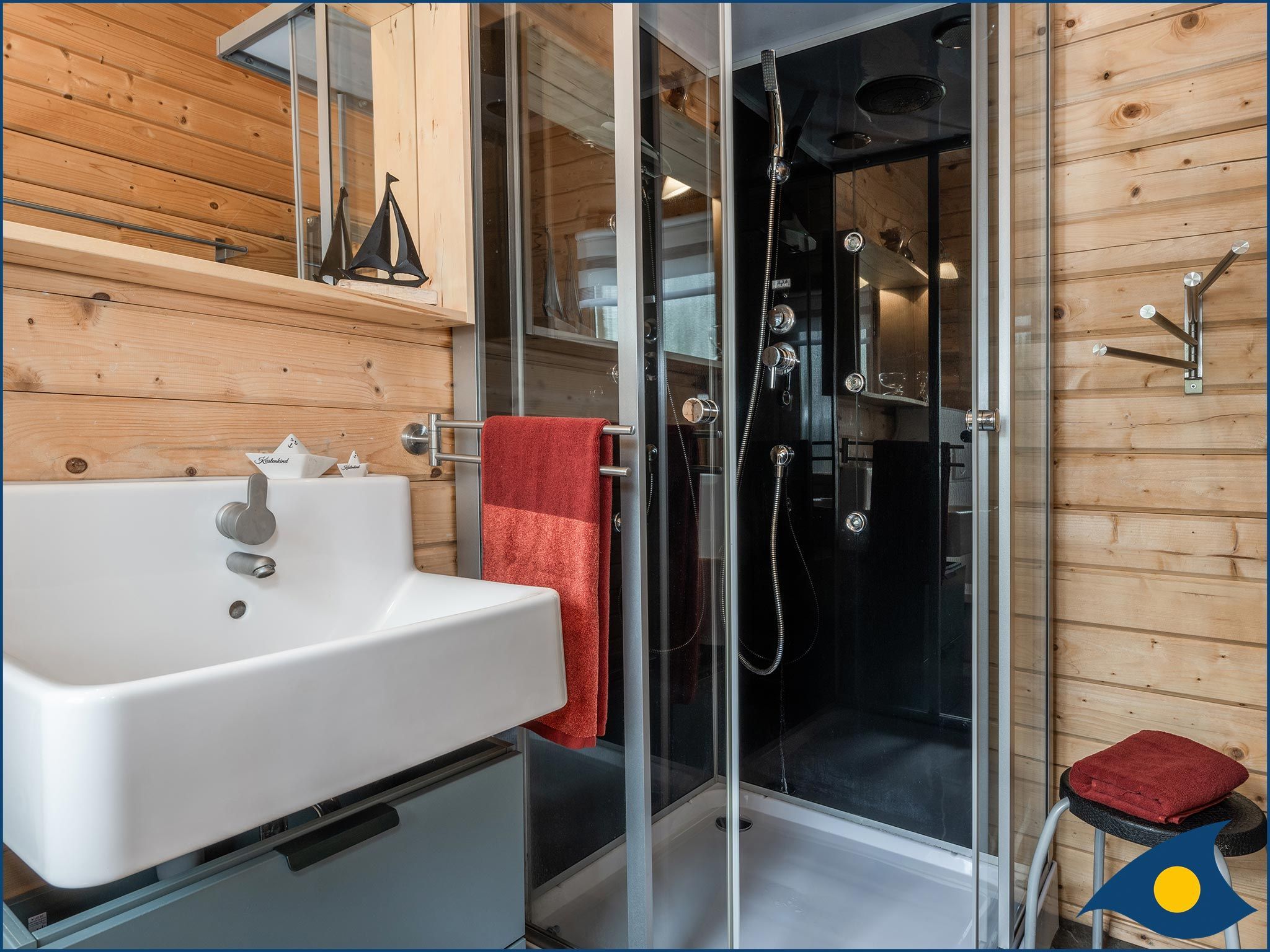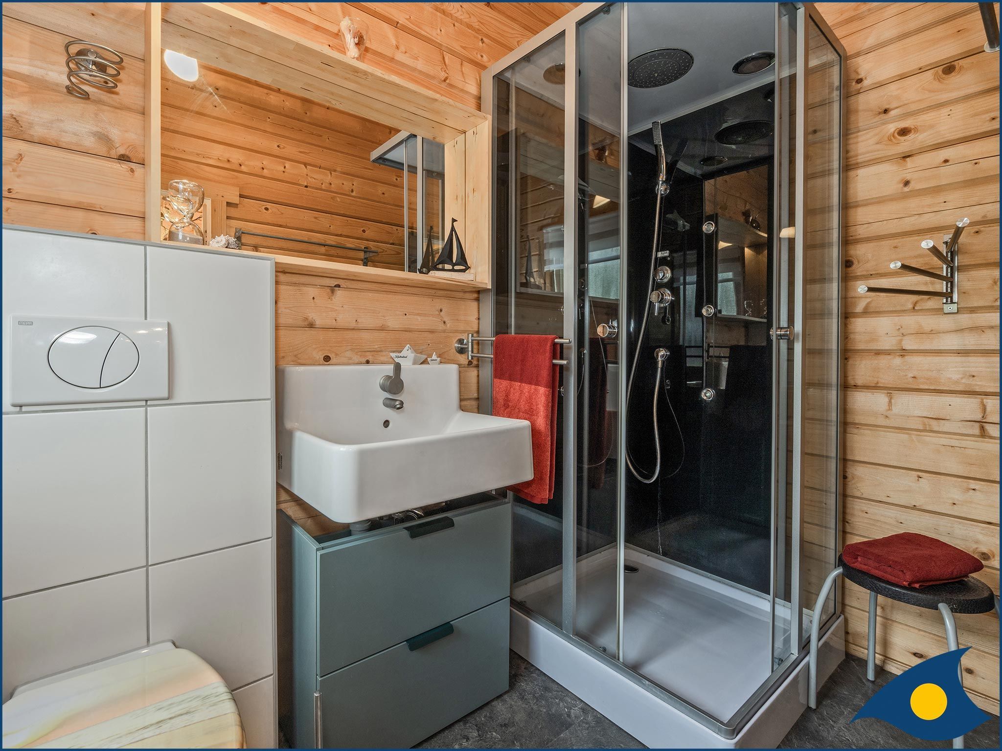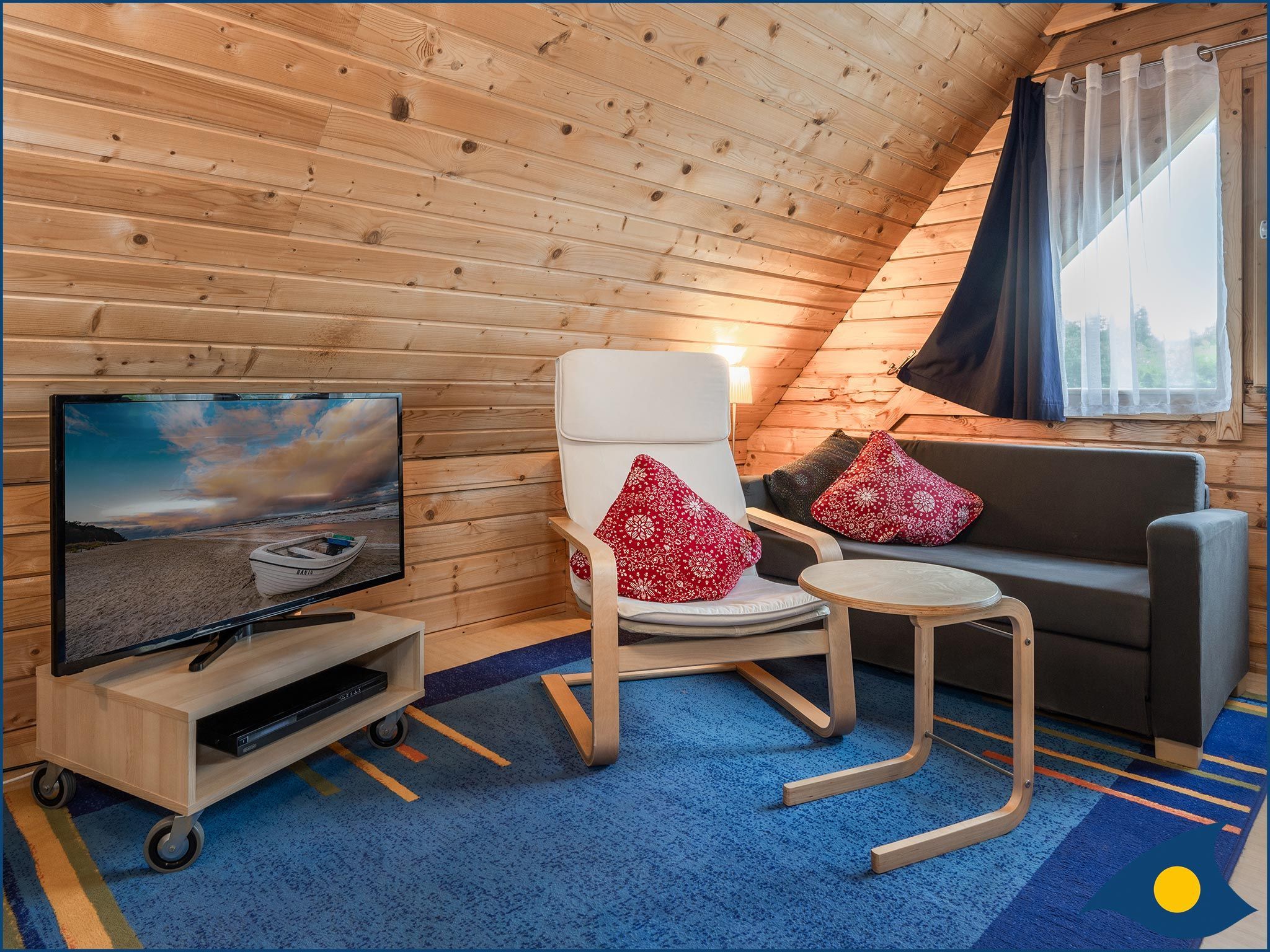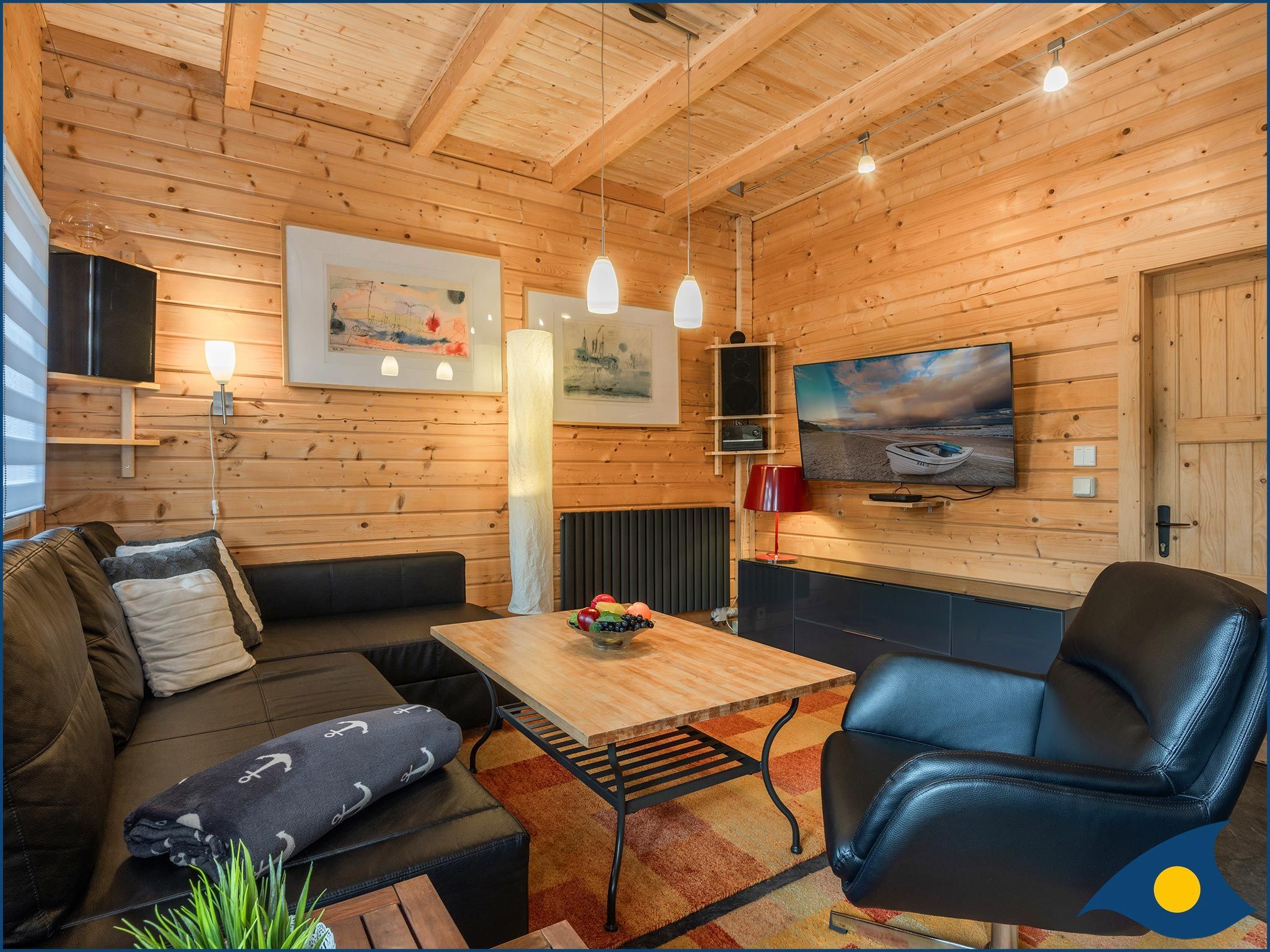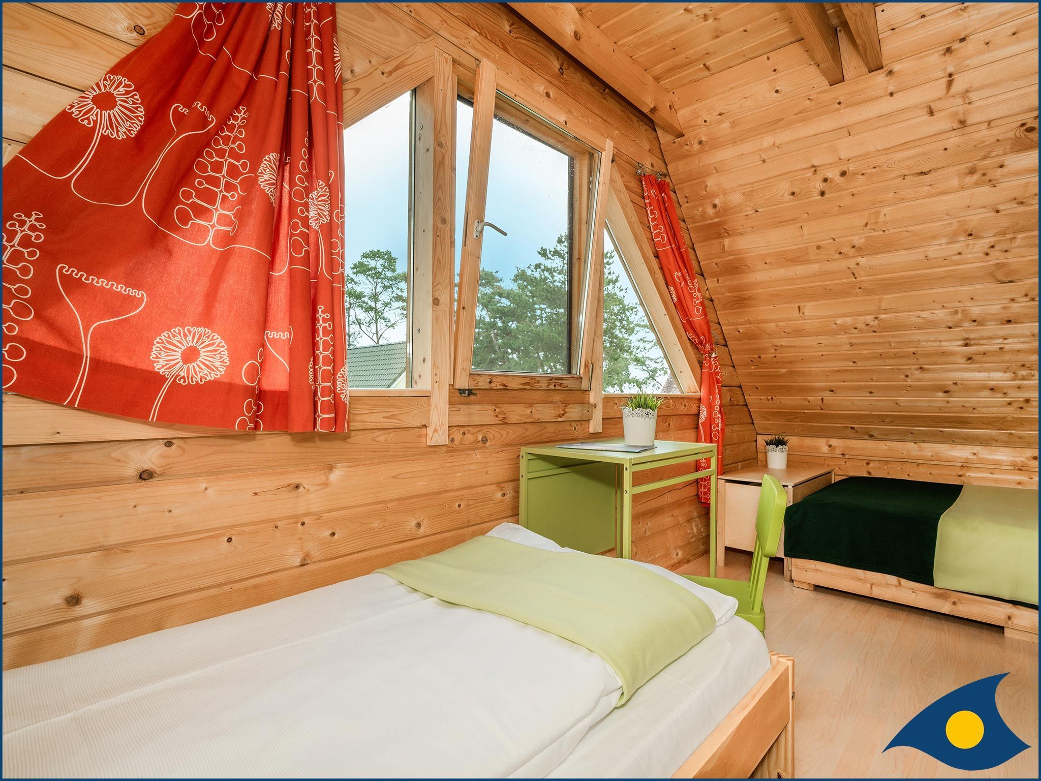 Beide Schlafzimmer liegen im Obergeschoss, eins mit einem bequemen Doppelbett und eins mit zwei Einzelbetten und einer Liege. Das große Schlafzimmer verfügt zusätzlich über eine Sitzecke, die eine Rückzugsmöglichkeit, aber auch einen weiteren Fernsehplatz bietet.