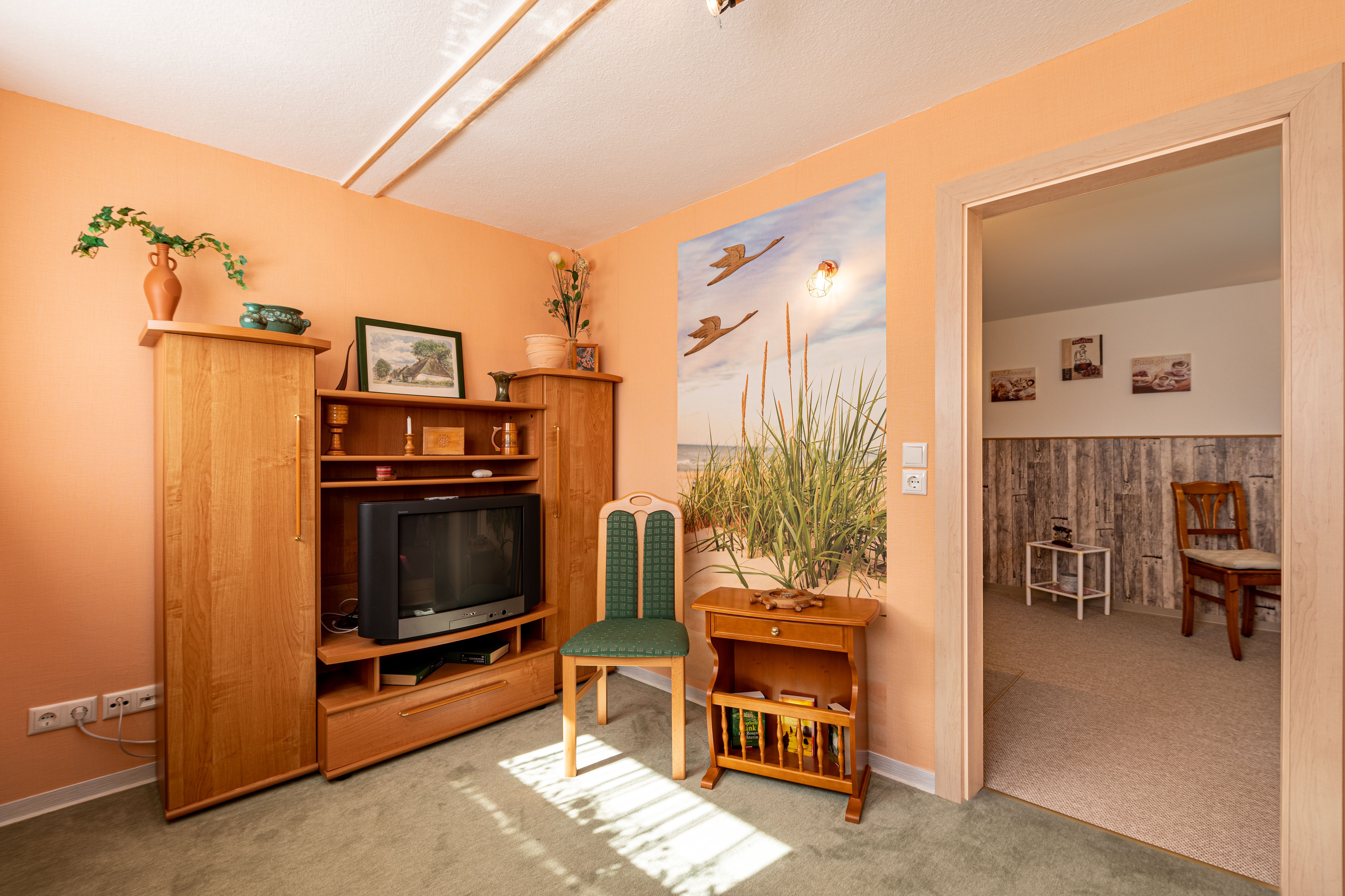 Es erwartet Sie ein Wohnzimmer mit TV und Sofa, eine gut ausgestattete Küche mit Esstisch, ein Schlafzimmer mit Doppelbett, ein Badezimmer mit Dusche und WC sowie ein geräumiger Flur.