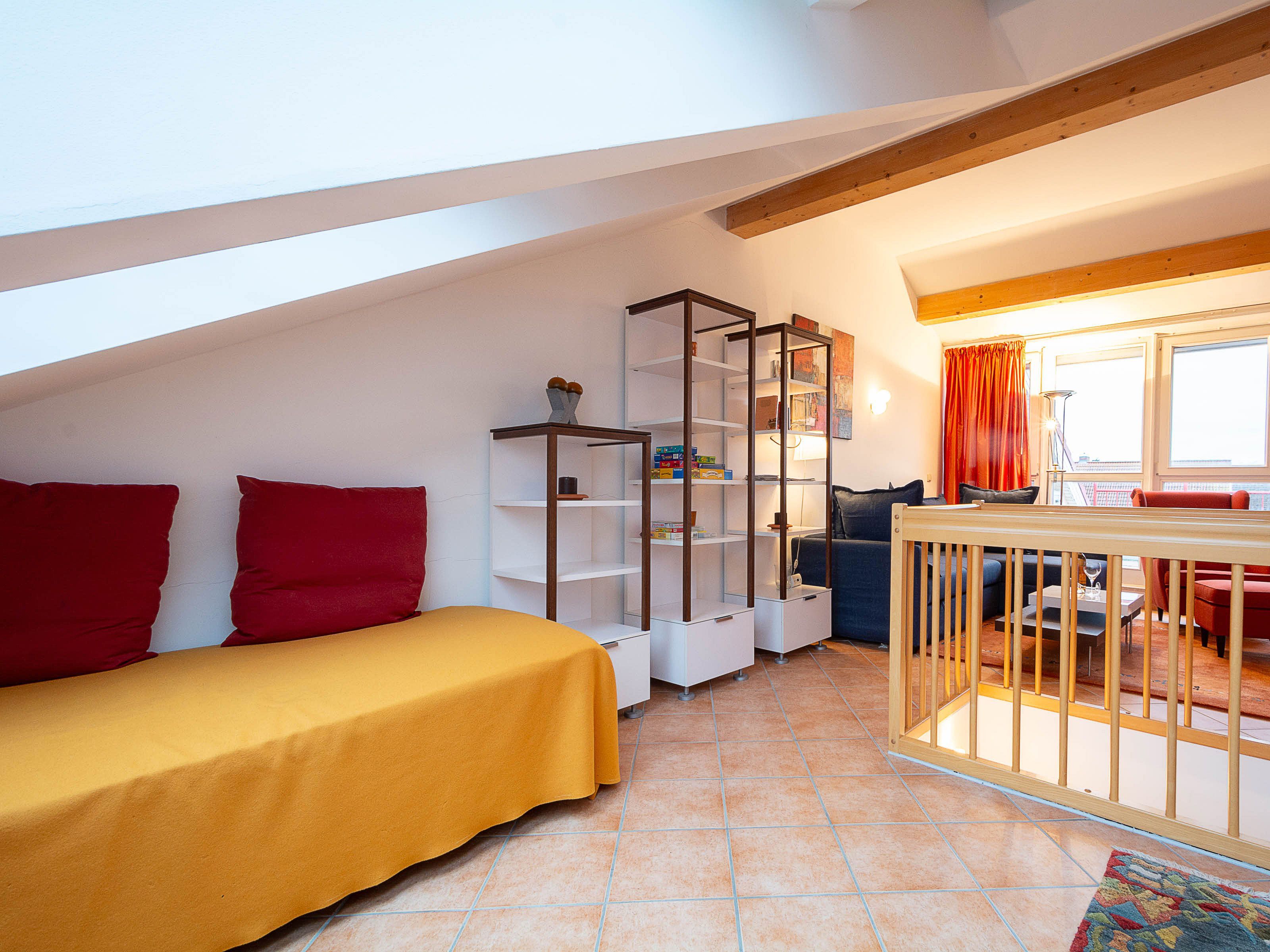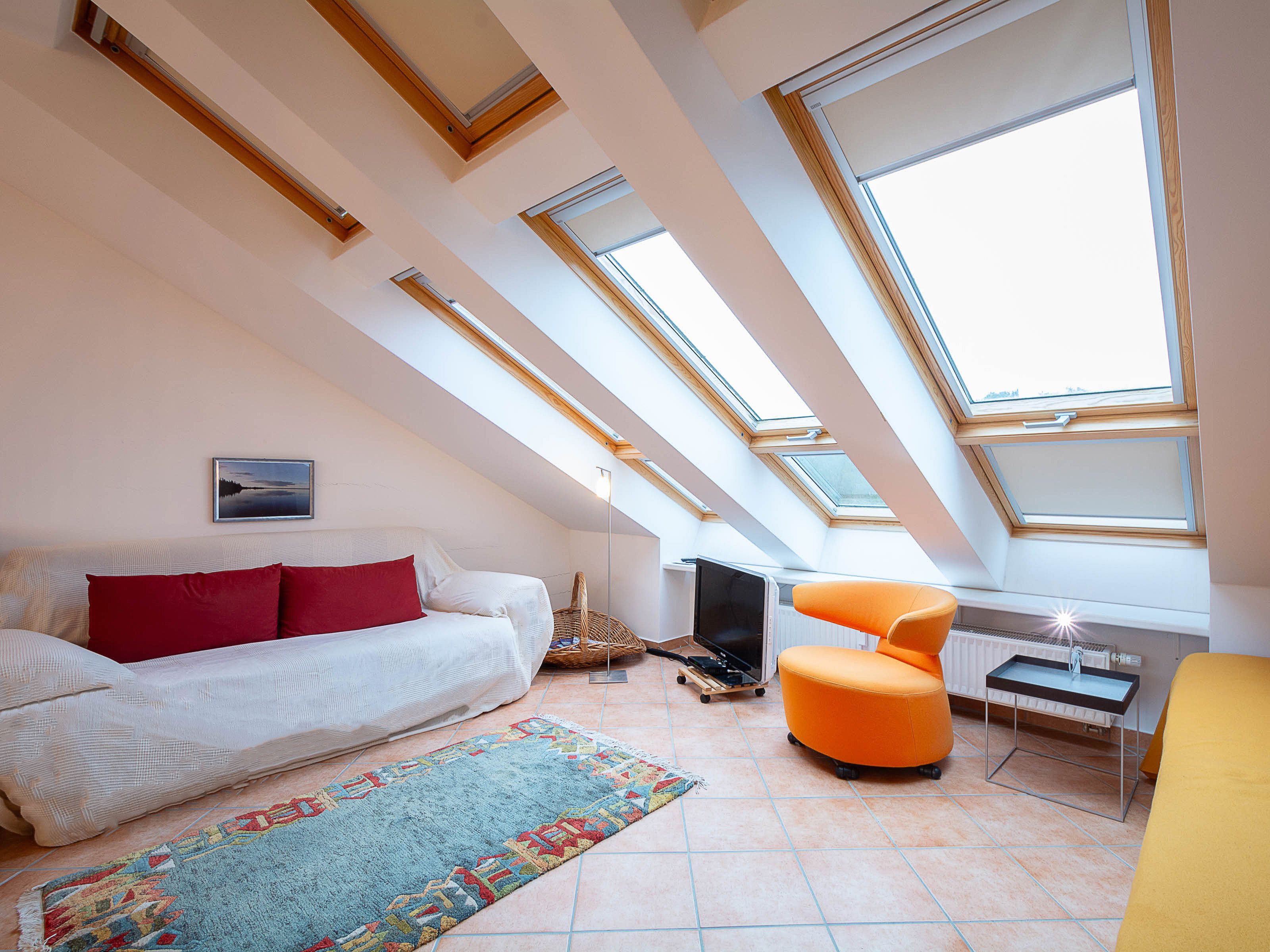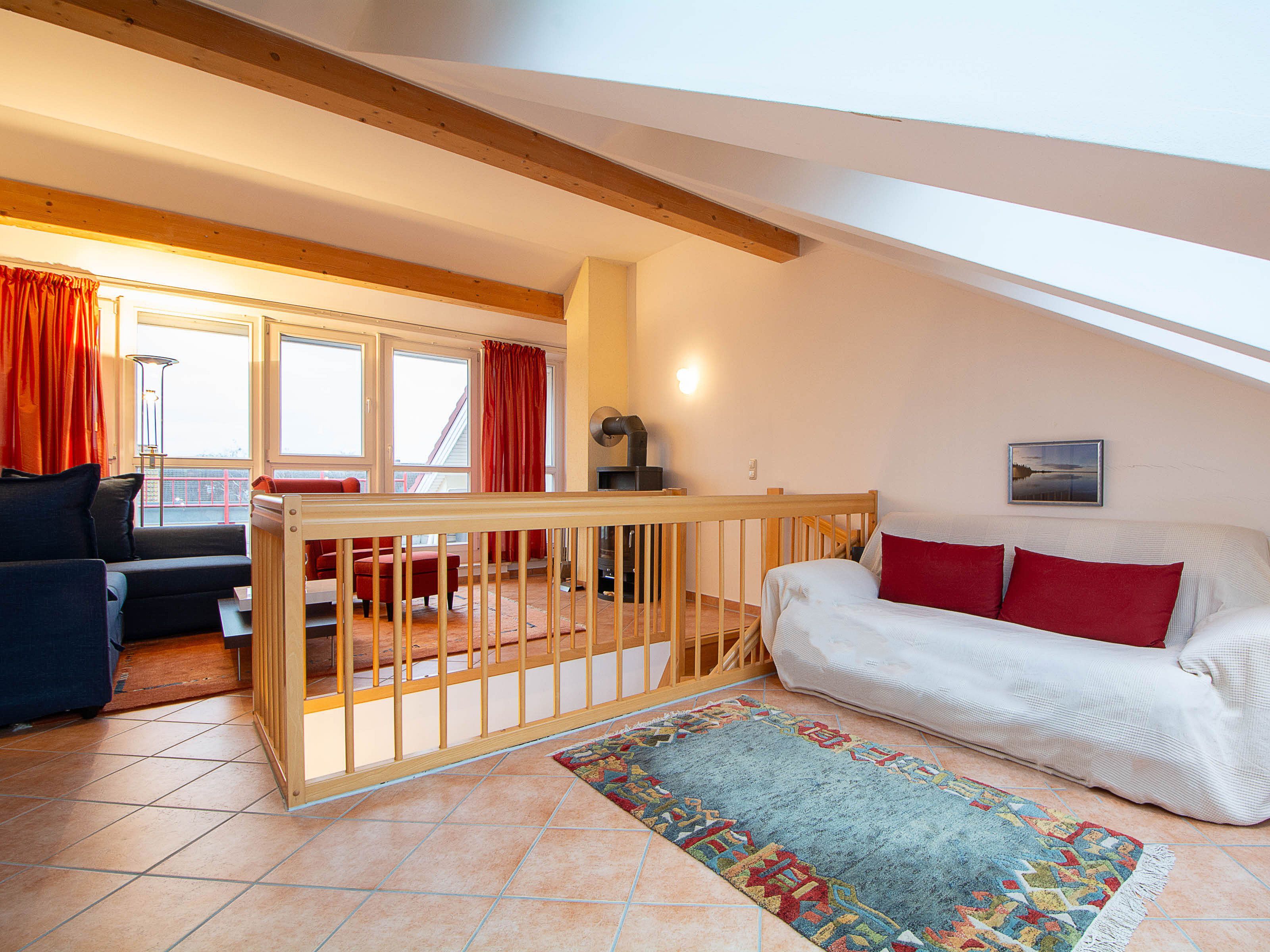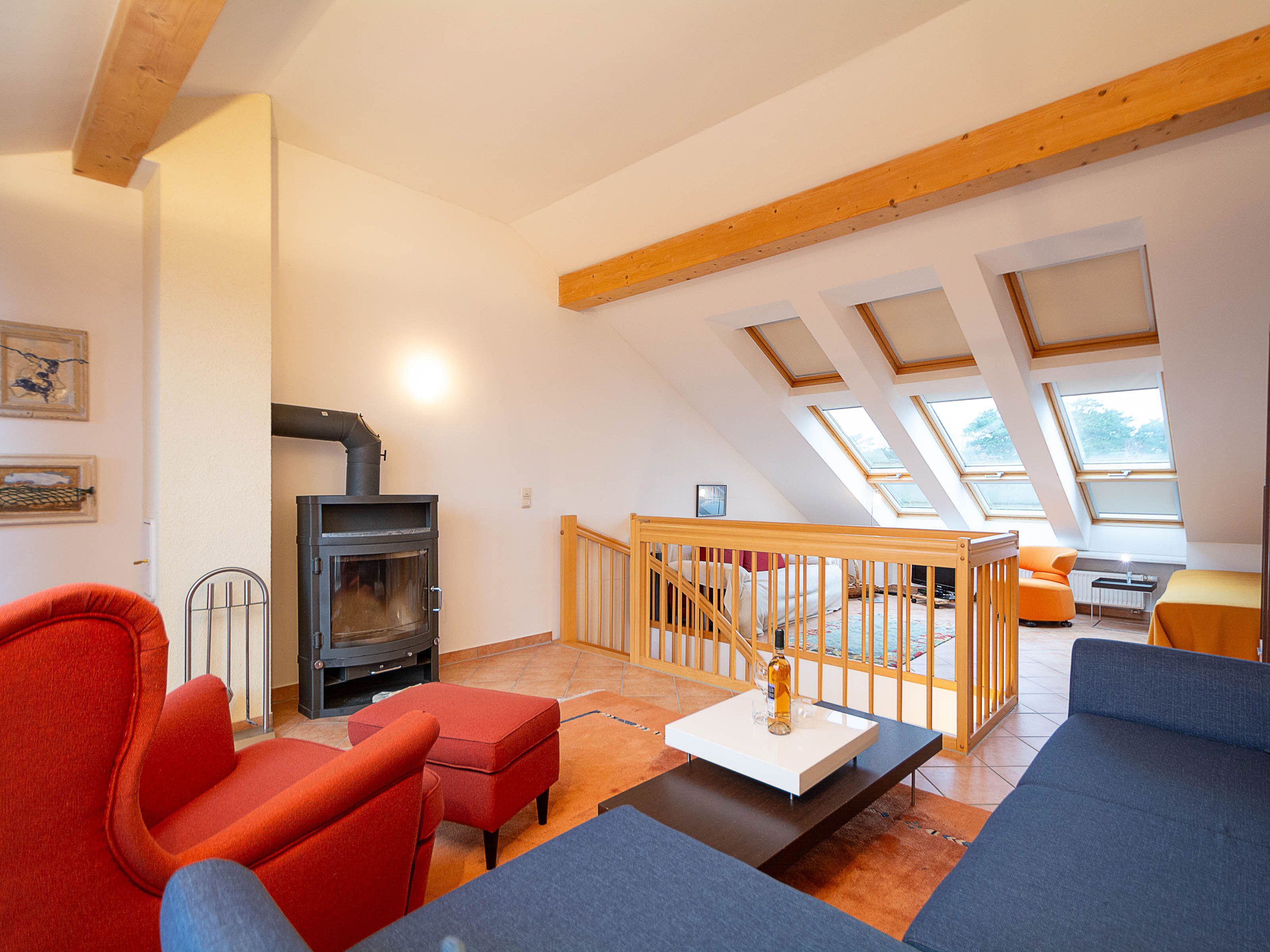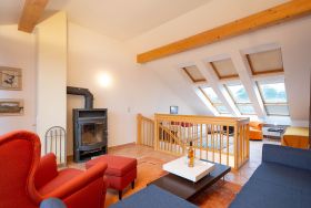 Im Schlafzimmer lädt Sie ein komfortables Doppelbett (2 x 90 x 200 cm) zur Nachtruhe ein. Der großzügige Kleiderschrank mit Ganzkörperspiegel bietet genügend Platz für Ihre Urlaubsgarderobe. In der oberen Etage finden Sie einen Wohn- Schlafraum mit Schlafcouch und TV sowie einen Holzofen vor. Der gemütliche Ofen im Wohnbereich schafft eine behagliche Atmosphäre und rundet das Wohlfühlambiente perfekt ab. Die große nach Süden ausgerichtete Dachterrasse, die zum Sonnenbaden und langen Abenden zu einem Gläschen Wein einlädt, betreten Sie vom oberen Wohnraum aus.