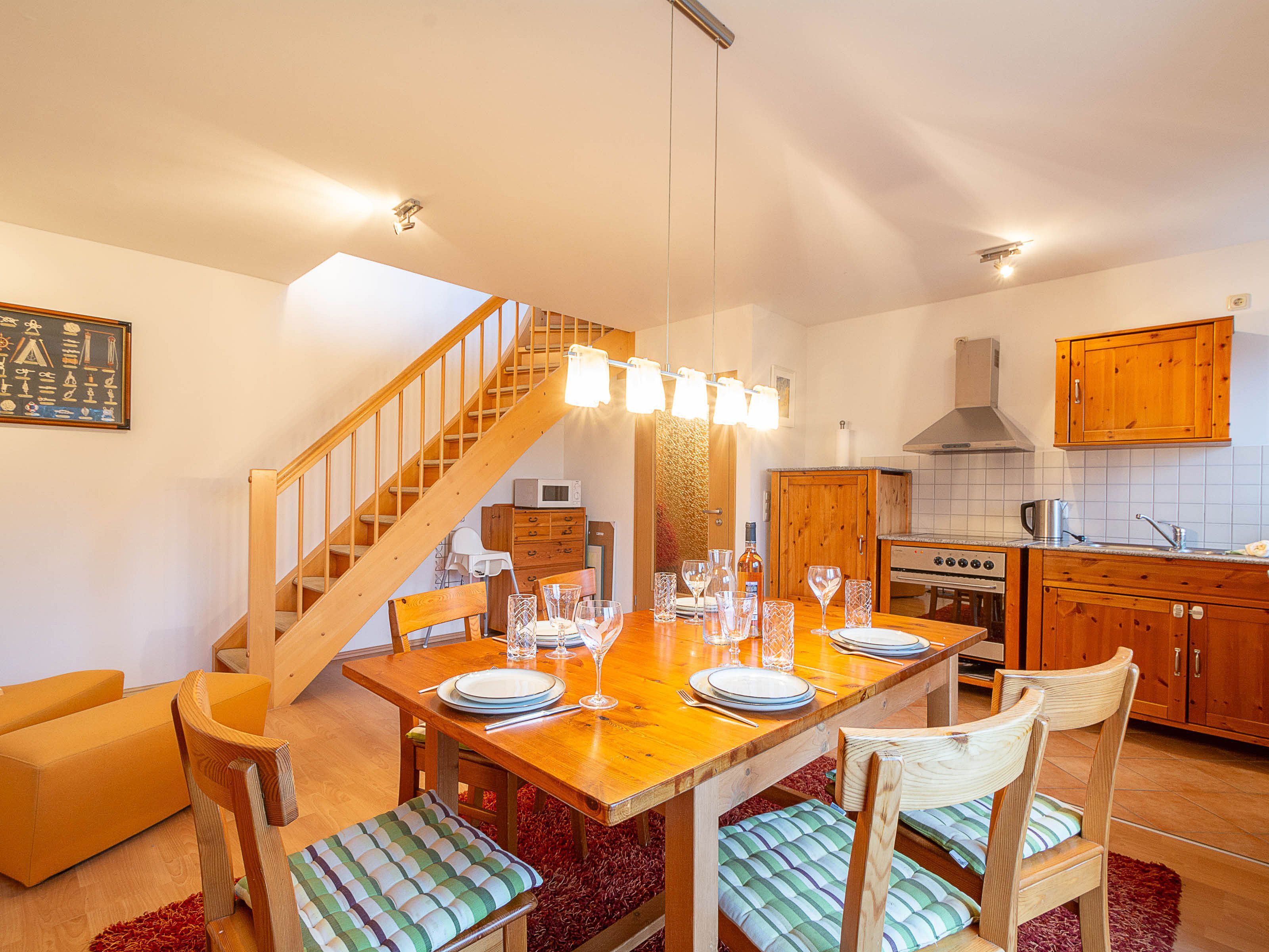 Der gemütliche Essbereich in der unteren Etage ist mit einem bequemen Sessel und einem Esstisch für gemeinsame Mahlzeiten eingerichtet. Die offene Küchenzeile aus rustikalen Kiefernholz hält für Sie alle wichtigen Küchengeräte und -utensilien bereit, die Sie für Ihr perfektes Dinner benötigen: Ein 4-Platten-Herd mit Dunstabzug, ein Backofen, eine Mikrowelle und ein Kühlschrank befinden sich in der Küche. Eine Kaffeemaschine, ein Wasserkocher und ein Toaster sowie genügend Koch- und Essgeschirr vervollständigen die Kücheneinrichtung.