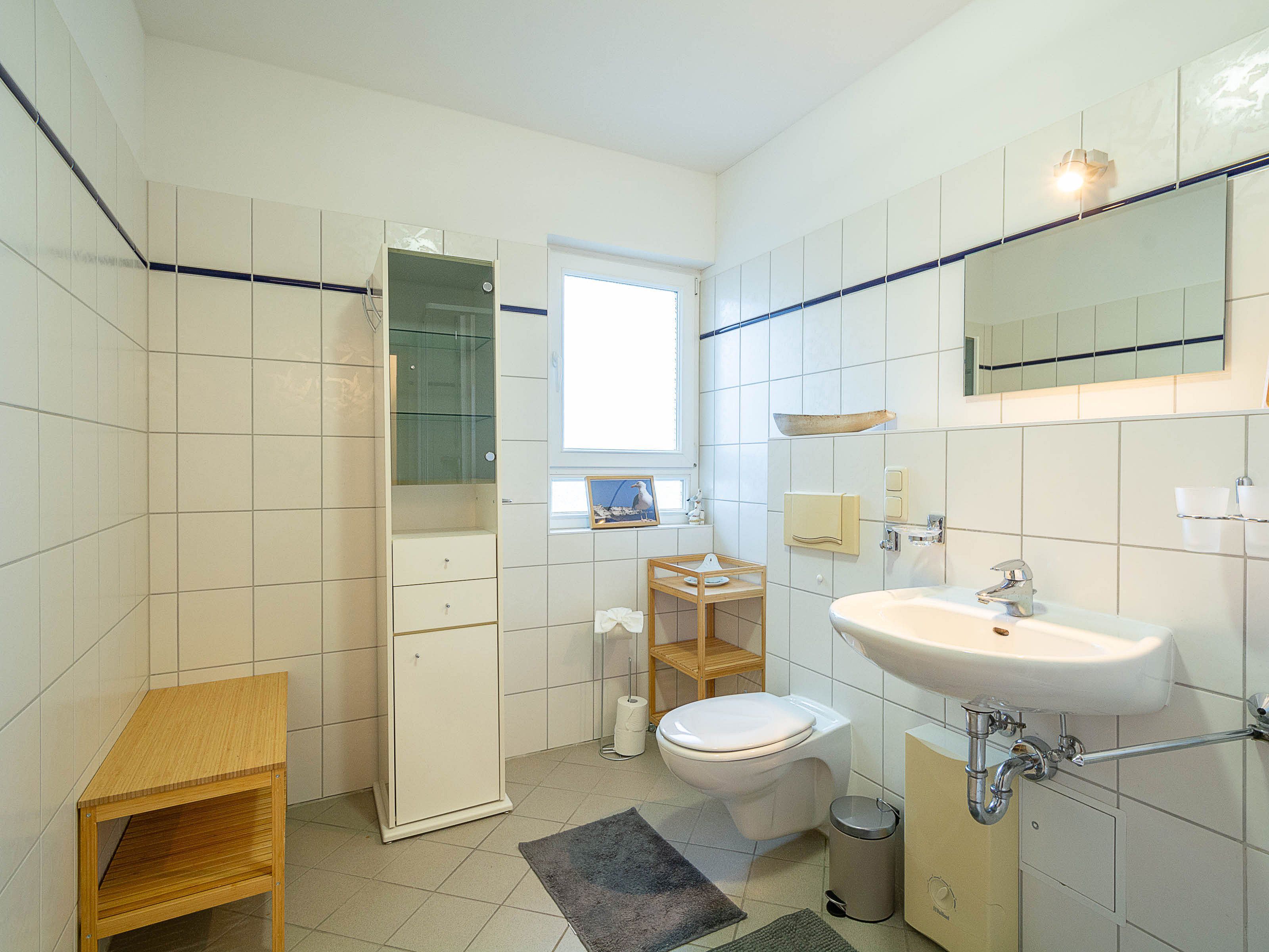 Das geflieste Tageslichtbad ist ausgestattet mit einer Dusche, Waschbecken und WC. Ein Handtuchheizkörper sorgt für kuschelig warme Handtücher.
