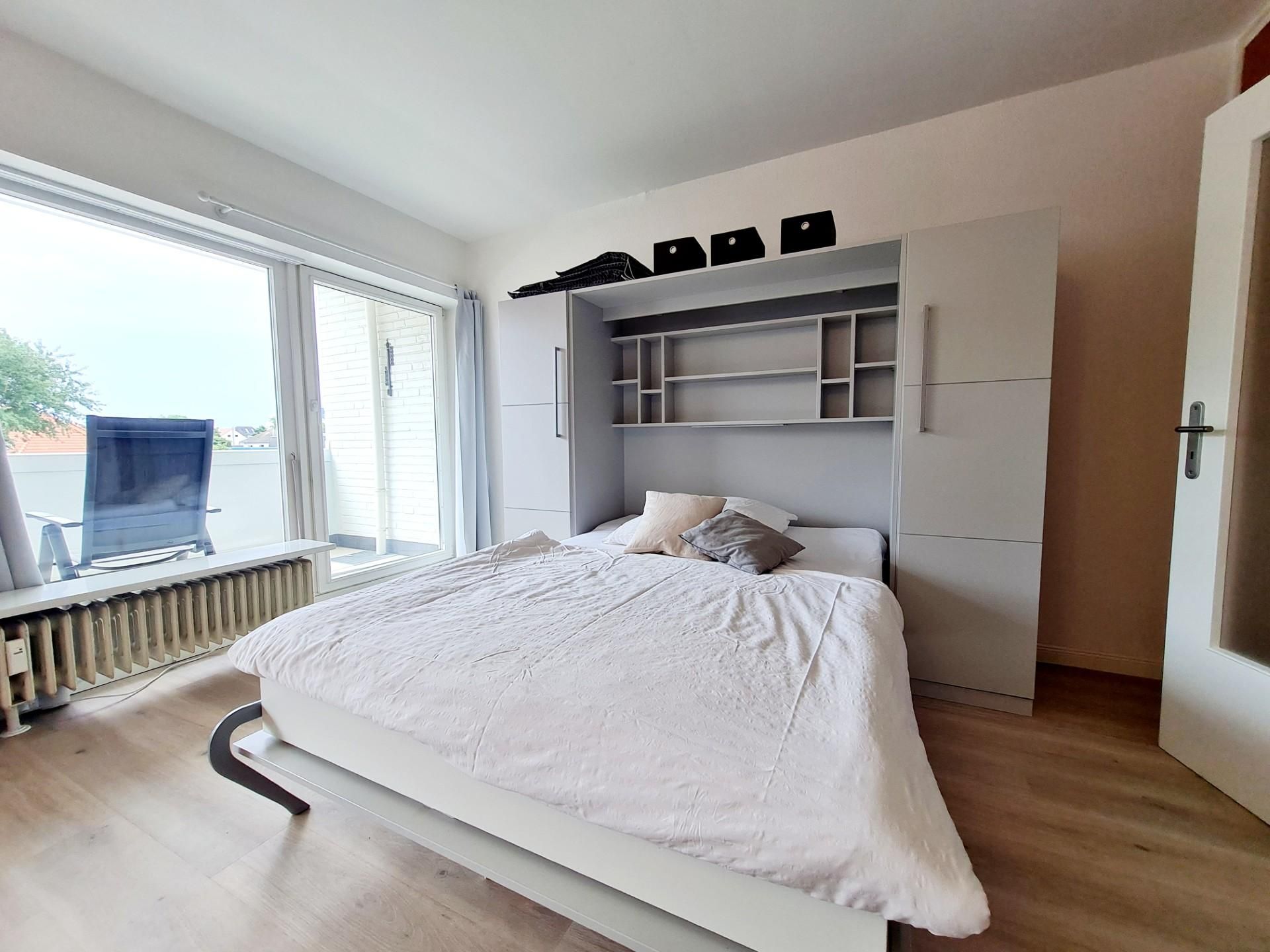 Das große Panoramafenster sorgt für viel Licht, wodurch das Wohn- und Schlafzimmer einladend hell wirkt. Der möblierte Balkon lädt zum entspannten Frühstück, zur Kaffepause oder einem Glas Wein am Abend ein.