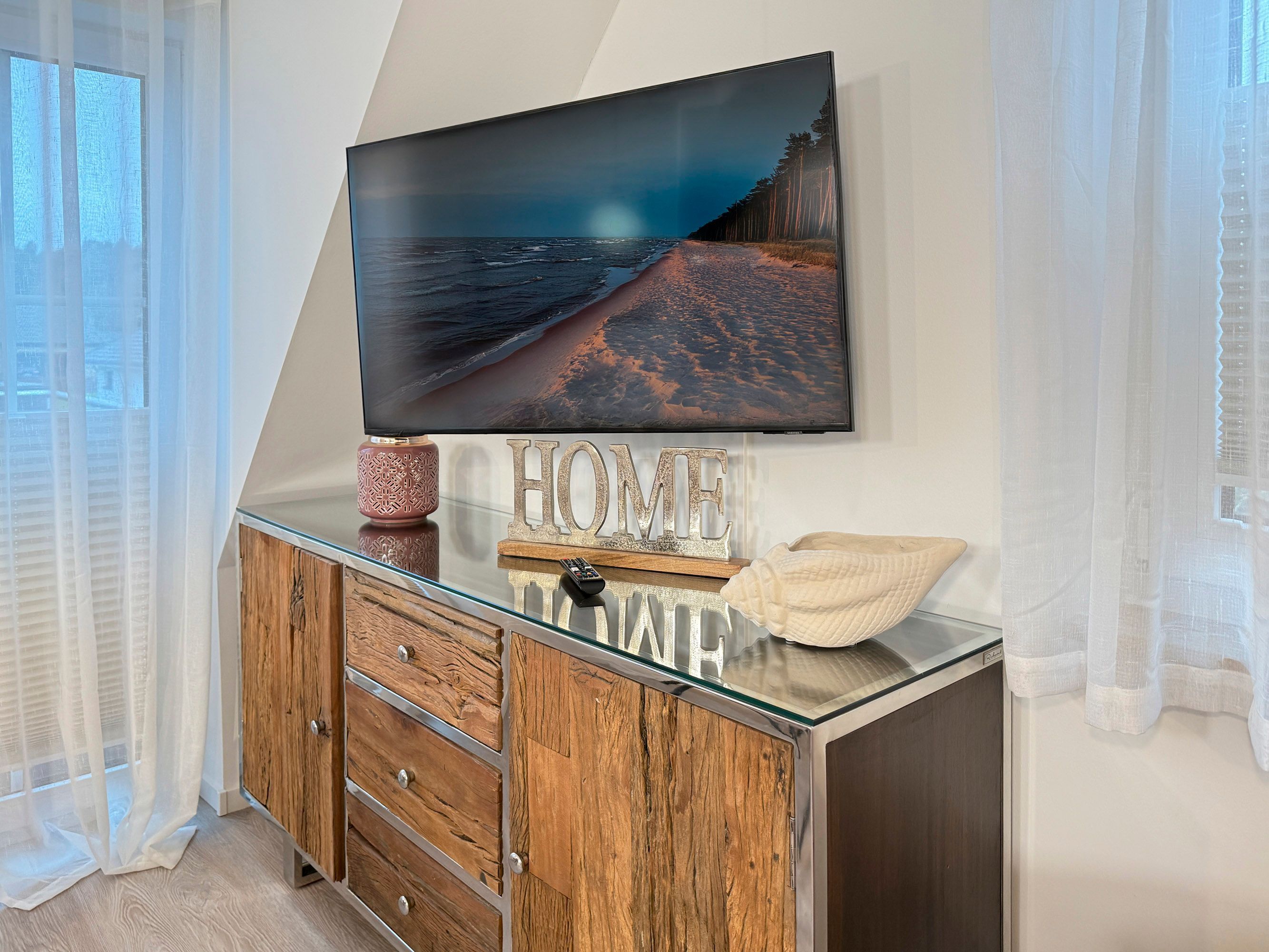 Die Ferienwohnung empfängt Sie mit einer modernen und komfortablen Ausstattung. Das Hauptschlafzimmer verfügt über ein gemütliches Boxspringbett und einen eigenen TV, während das zweite Schlafzimmer mit einem Einzelbett ausgestattet ist. Das Tageslichtbad bietet eine ebenerdige Dusche für besonderen Komfort. In der voll ausgestatteten Küchenzeile können Sie Ihre Lieblingsgerichte zubereiten und diese im gemütlichen Wohnbereich genießen. Der private Balkon mit Gartenblick lädt zu entspannten Stunden im Freien ein.