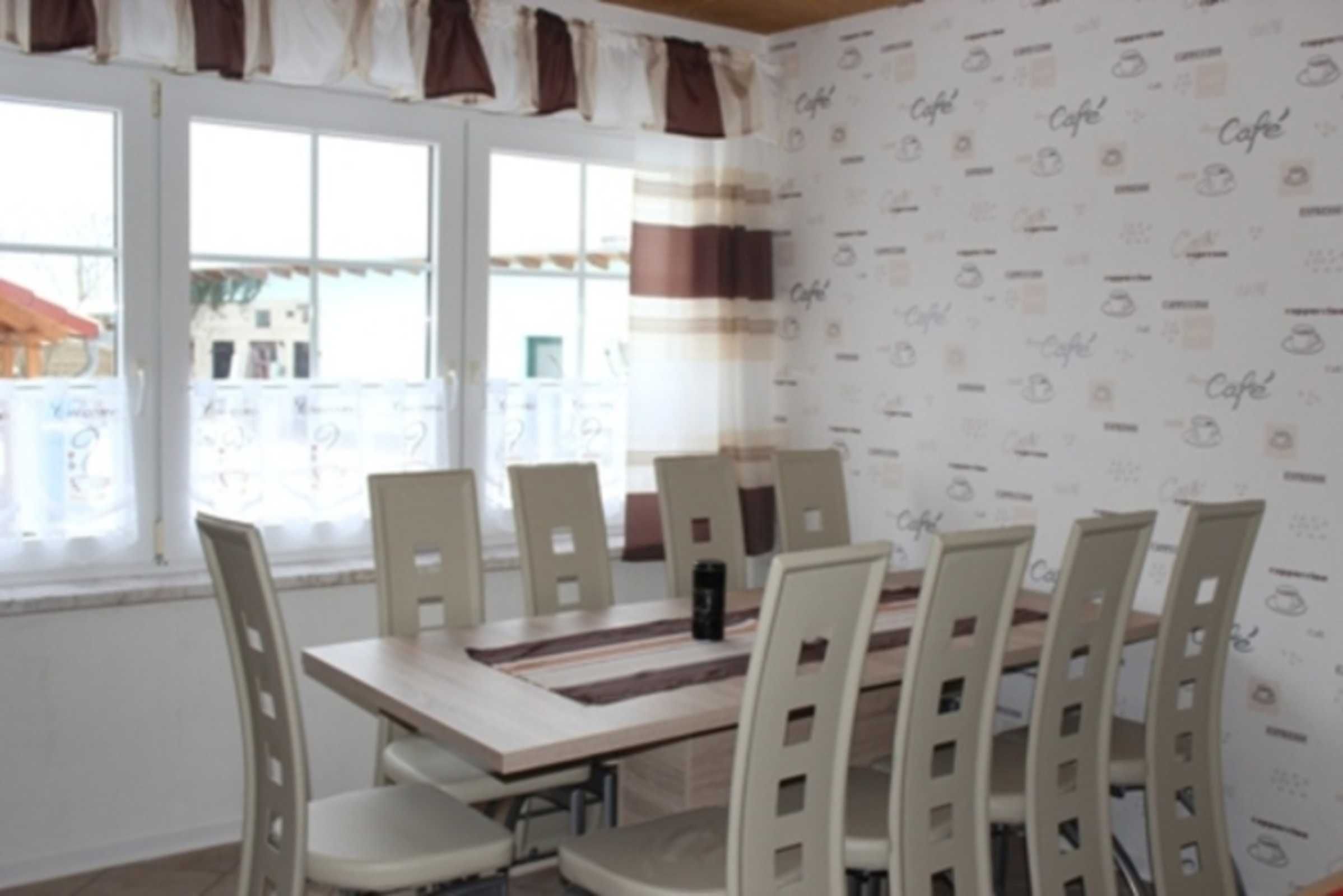 Großes Wohnzimmer, Küche mit Tisch für 8 Personen,
