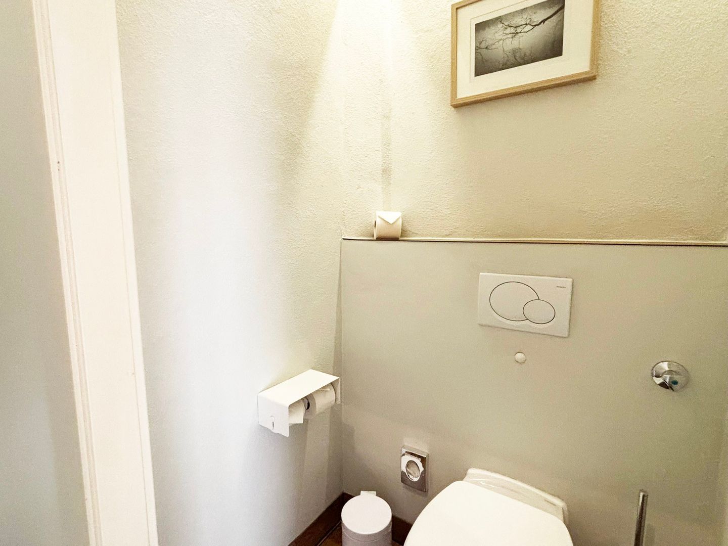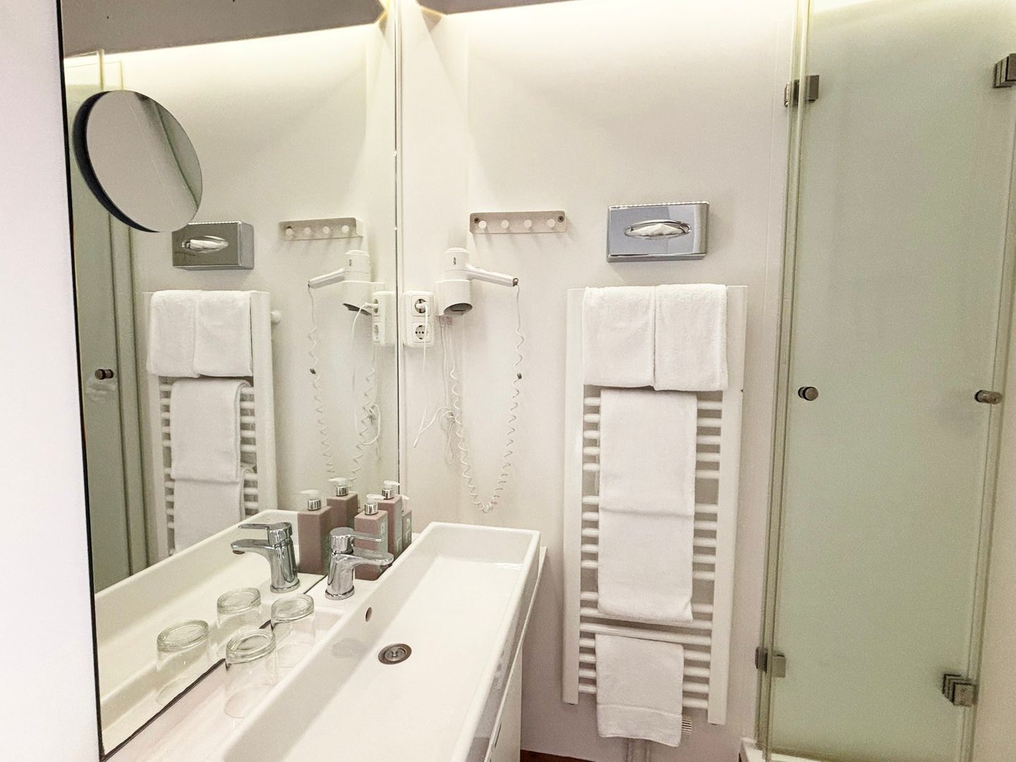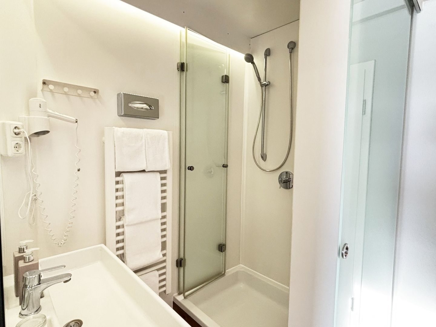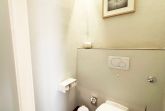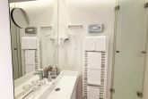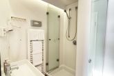 Das Badezimmer ist funktional in zwei separate Räume aufgeteilt: In einem Raum finden Sie das WC, während der andere Raum mit einer Dusche, Haartrockner, Kosmetikspiegel, Spiegel und einem Waschbecken ausgestattet ist.