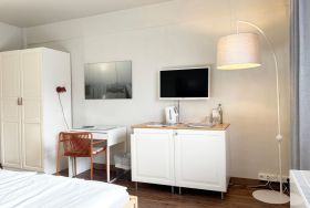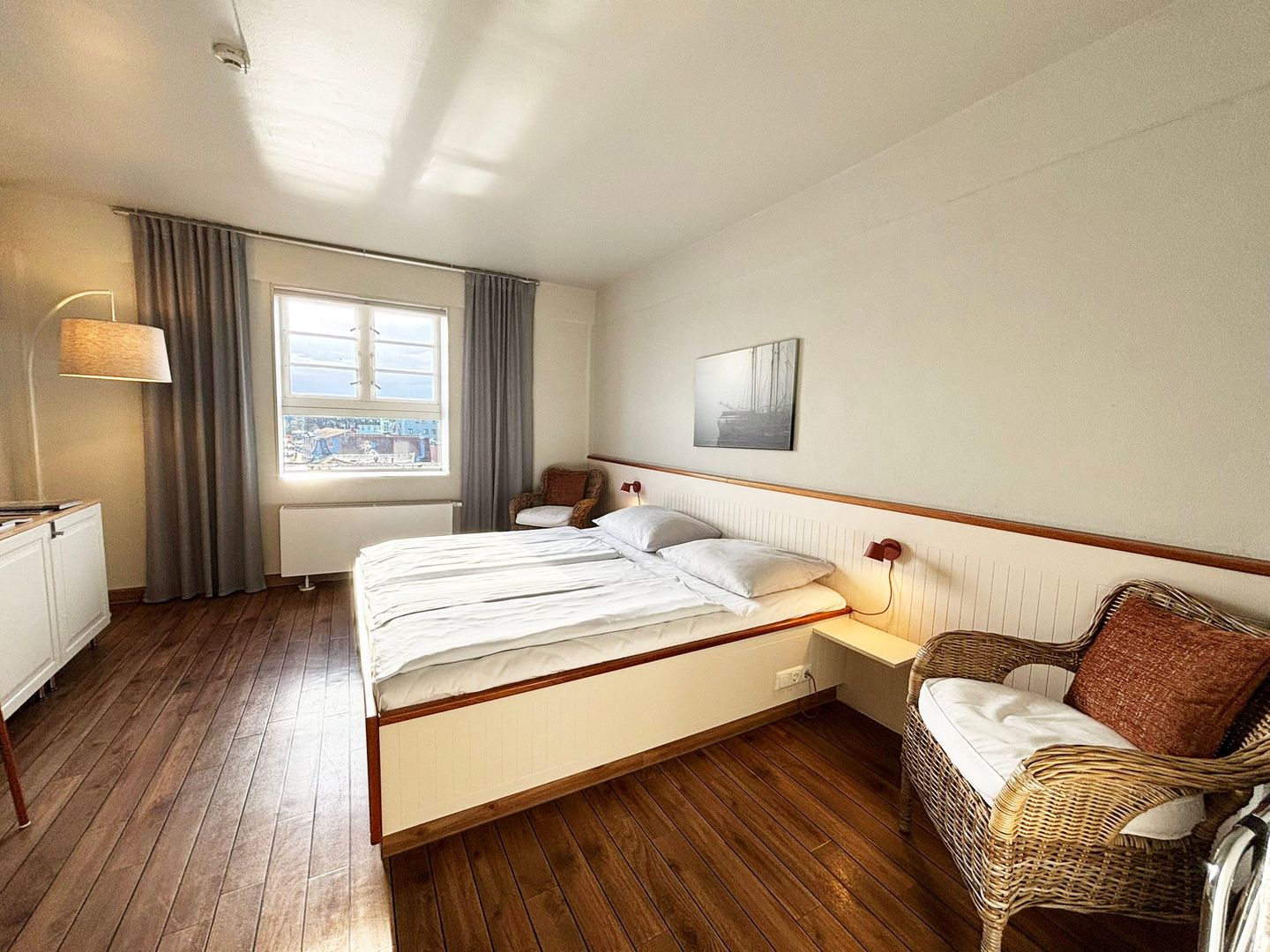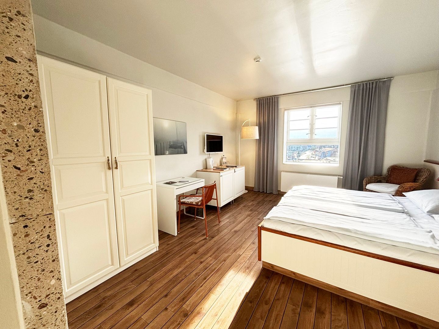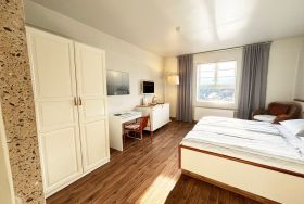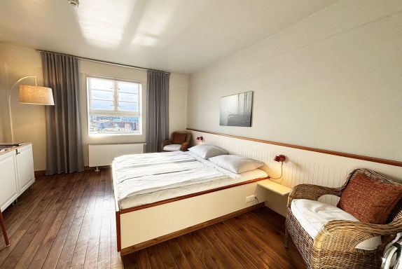 Das Appartement liegt in der vierten Etage des Pierspeichers und ist bequem über einen Aufzug oder das Treppenhaus erreichbar. Das Zimmer ist ausgestattet mit einem Doppelbett (180x200cm) mit getrennten Matratzen und offenem Fußende, Kleiderschrank, Verdunklungsmöglichkeit, Safe, zwei Korbsesseln und einem TV-Gerät.