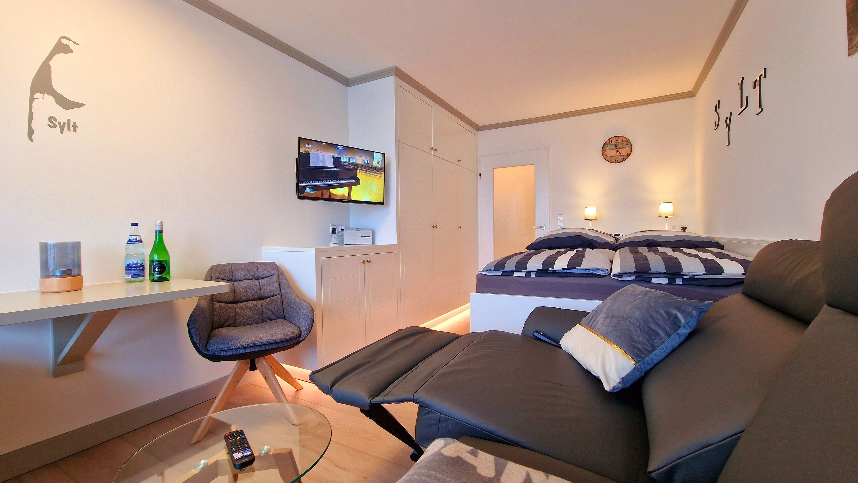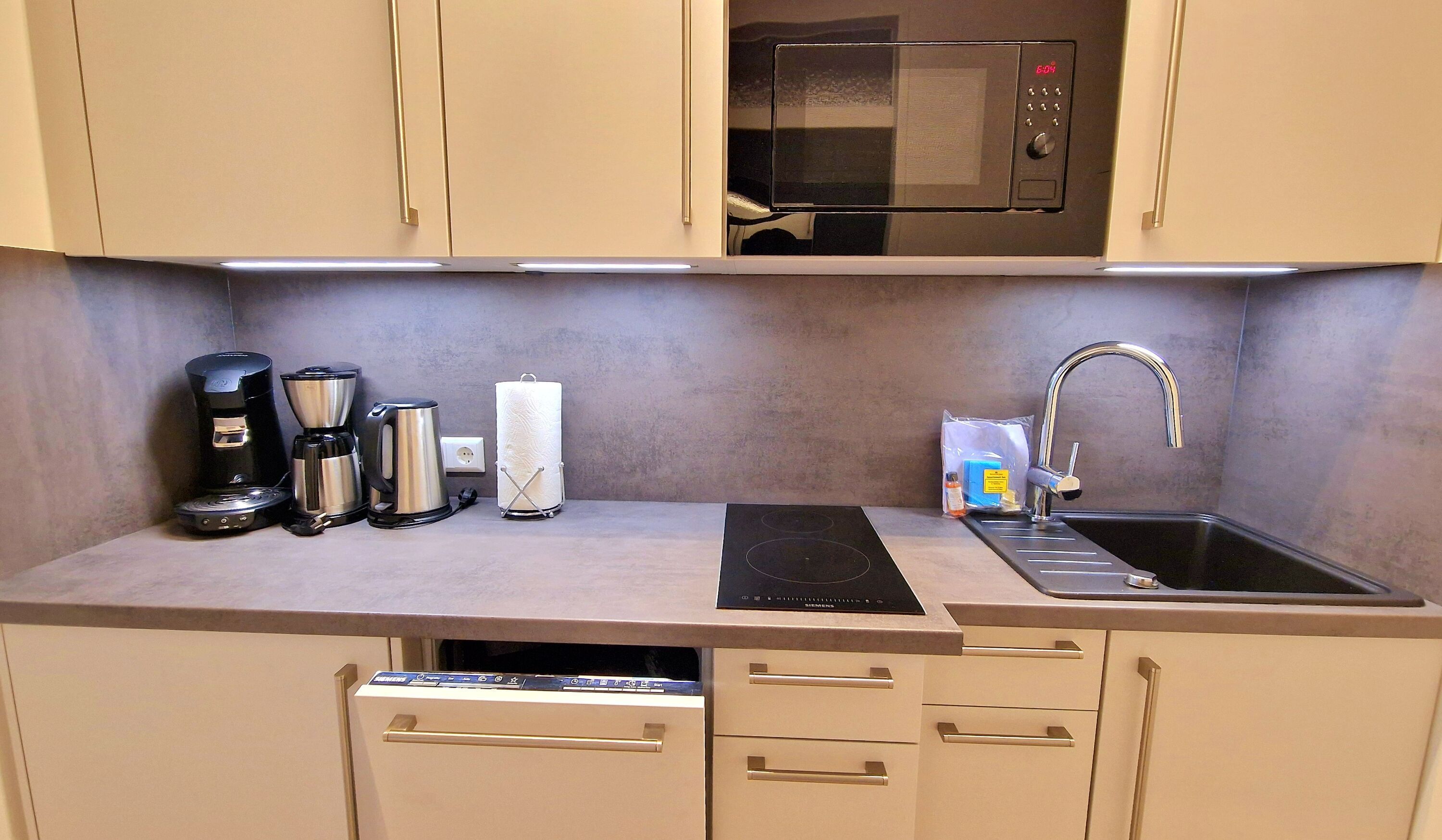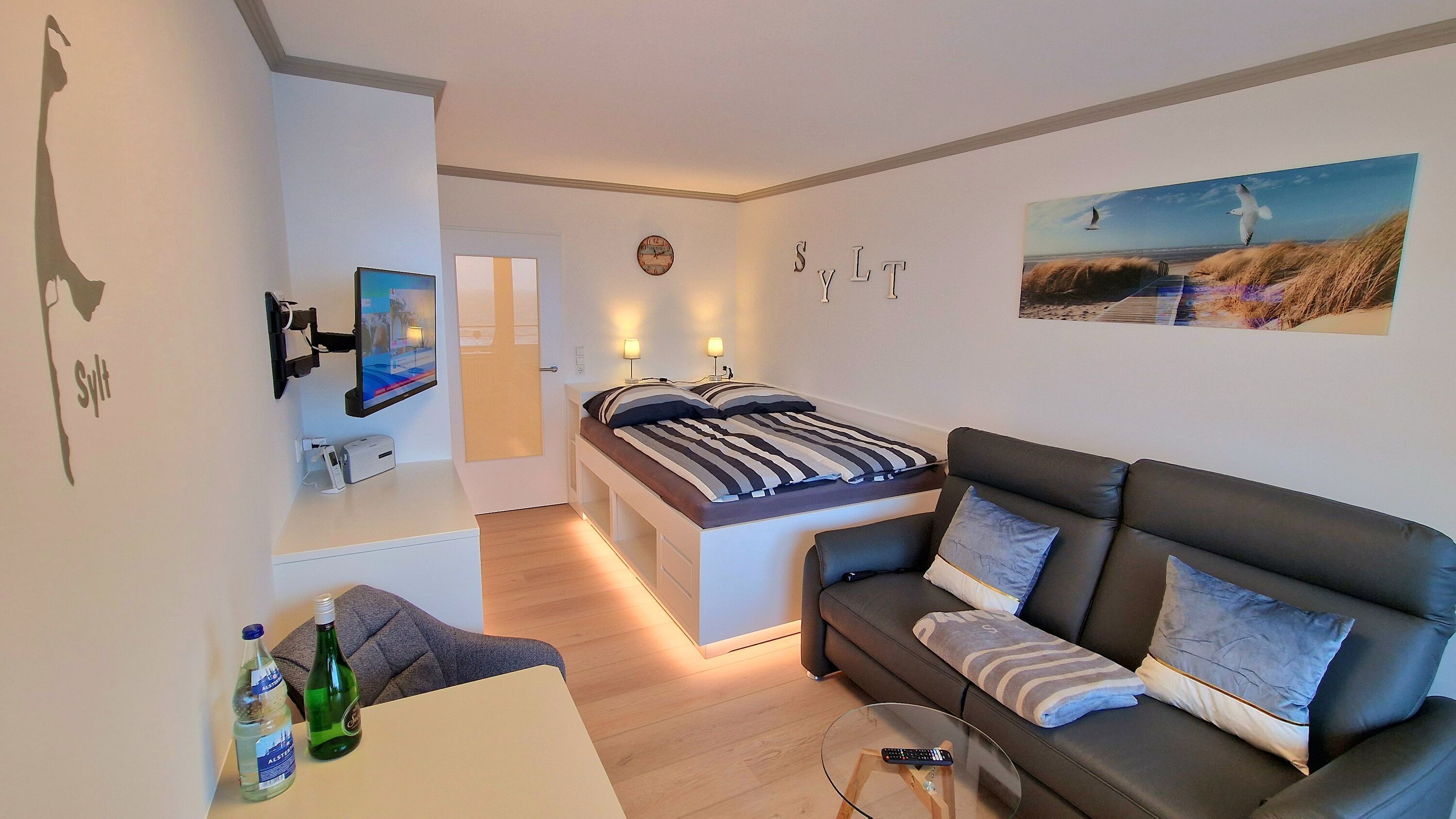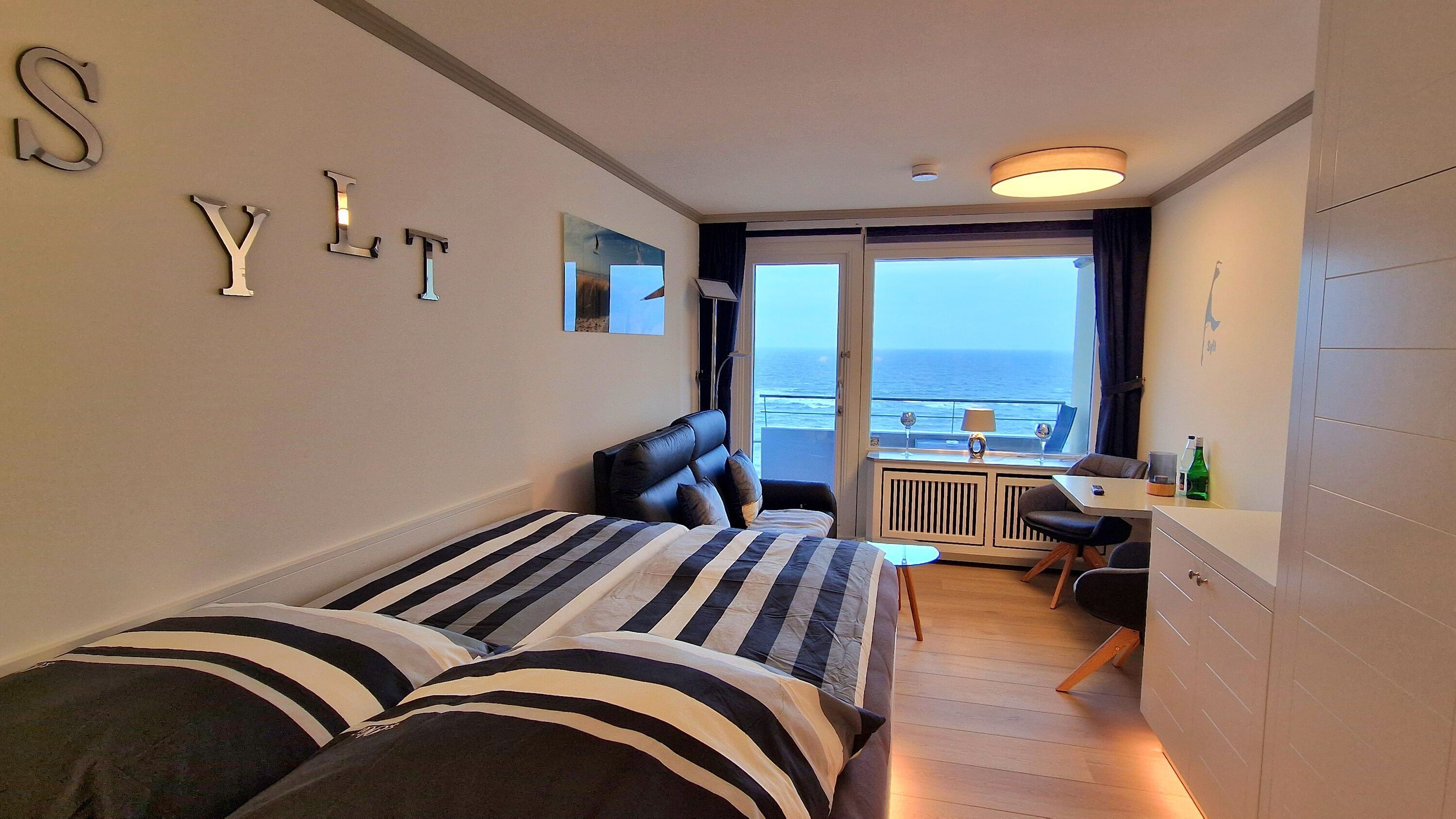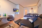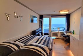 1-Zimmer-Apartment mit freiem Seeblick im 11. OG des Haus Metropol, ca. 25 m². Kombinierter Wohn- und Schlafraum mit festem Doppelbett (140x200 cm), 2er-Sofa mit elektronischer Liegefunktion, Esstisch mit gemütlichen Stühlen, Smart-TV, Festnetzanschluss, seperatem WLAN und möblierten Westbalkon. Hübsche Küchenzeile mit Geschirrspüler, Mikrowelle, 2er-Cerankochfeld und extra Senseo Kaffeemaschine. Duschbad mit WC. Tierhaltung und Rauchen ist in der Wohnung ist nicht gestattet.