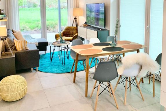 Unser nagelneues Ferienhaus MÖWE liegt unmittelbar hinterm Deich und ruhig gelegen im Feriendorf Jade-Sehestedt.