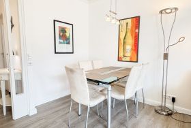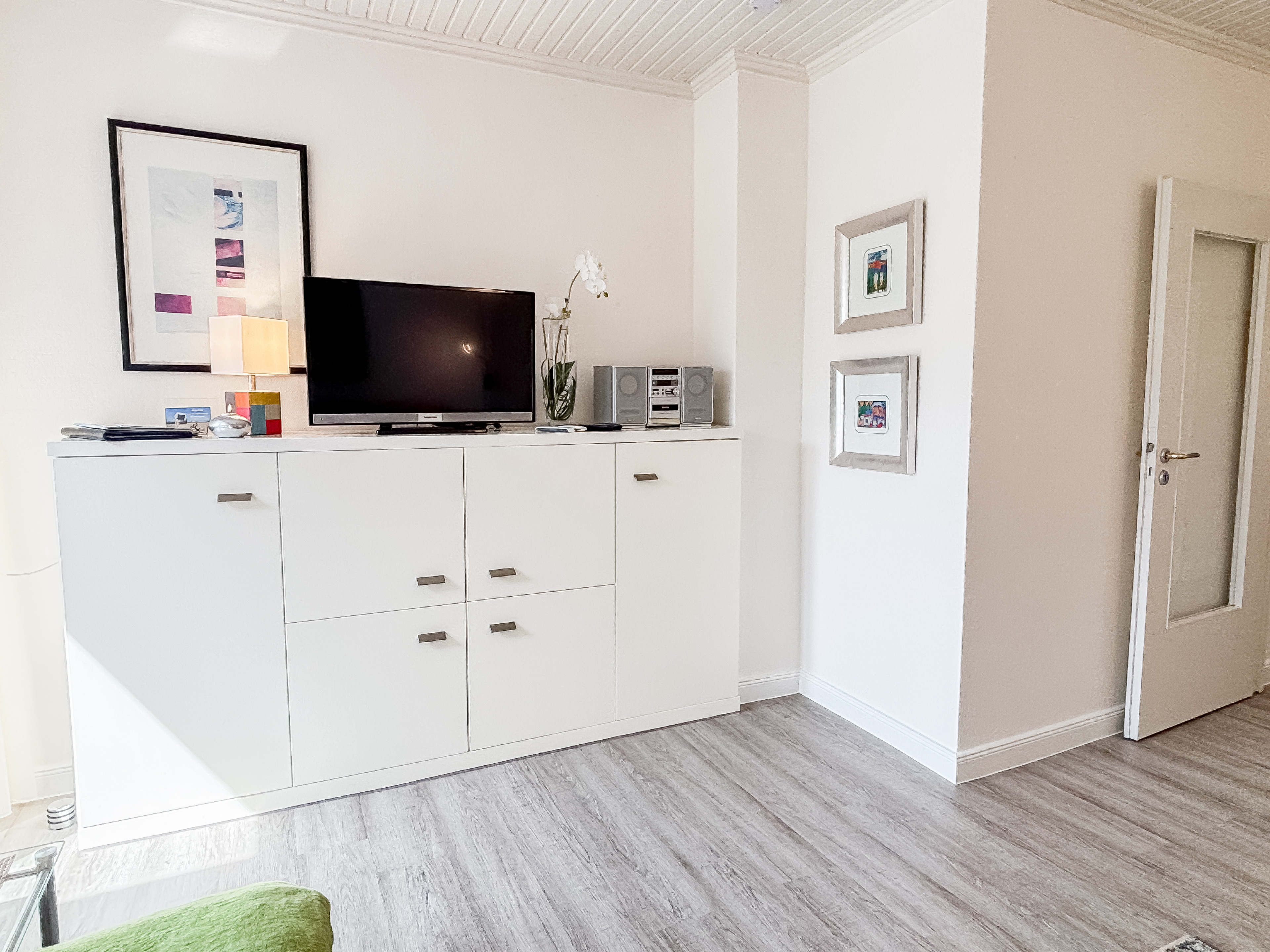 Das helle, liebevoll eingerichtete Wohnzimmer lädt mit einer bequemen Couchgarnitur, einem Flachbild-TV und einem Essplatz für zwei Personen zum Verweilen ein. Von hier gelangen Sie direkt auf den möblierten Balkon – perfekt, um die Abendsonne zu genießen.