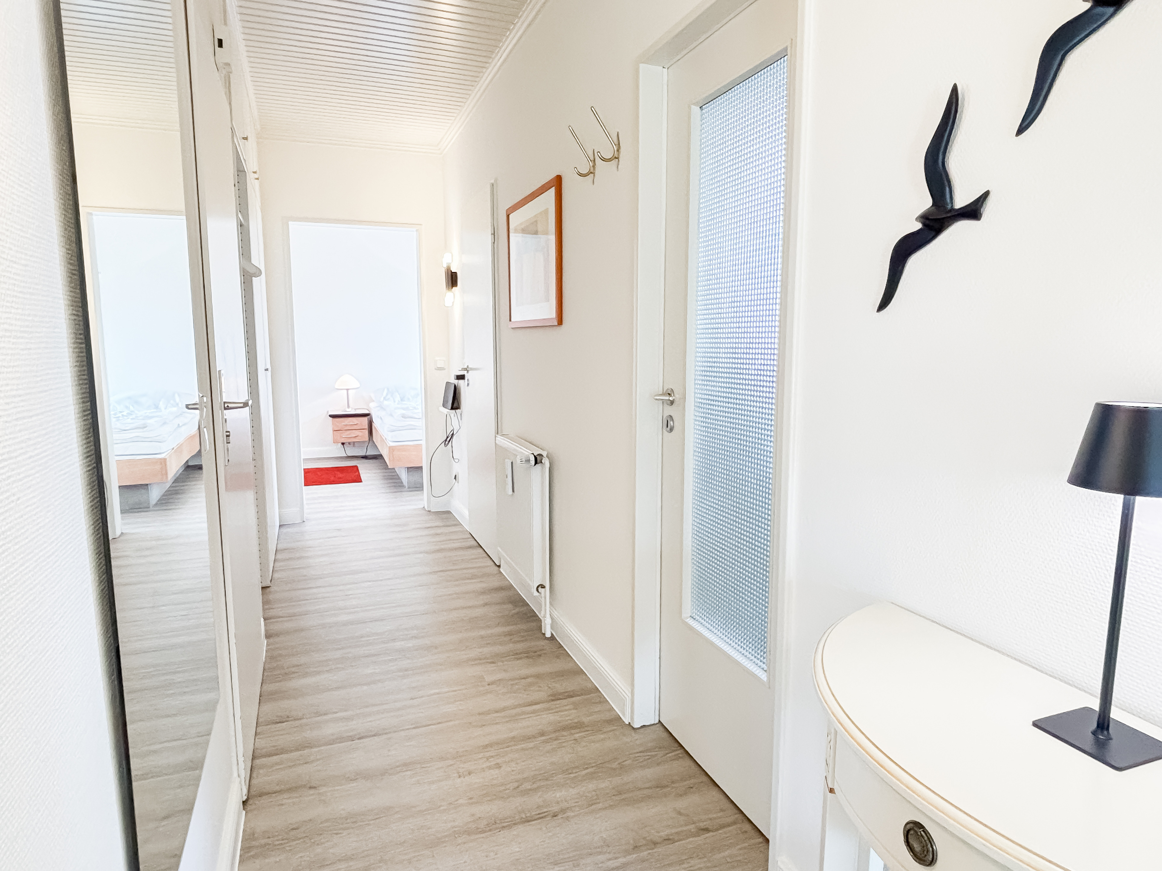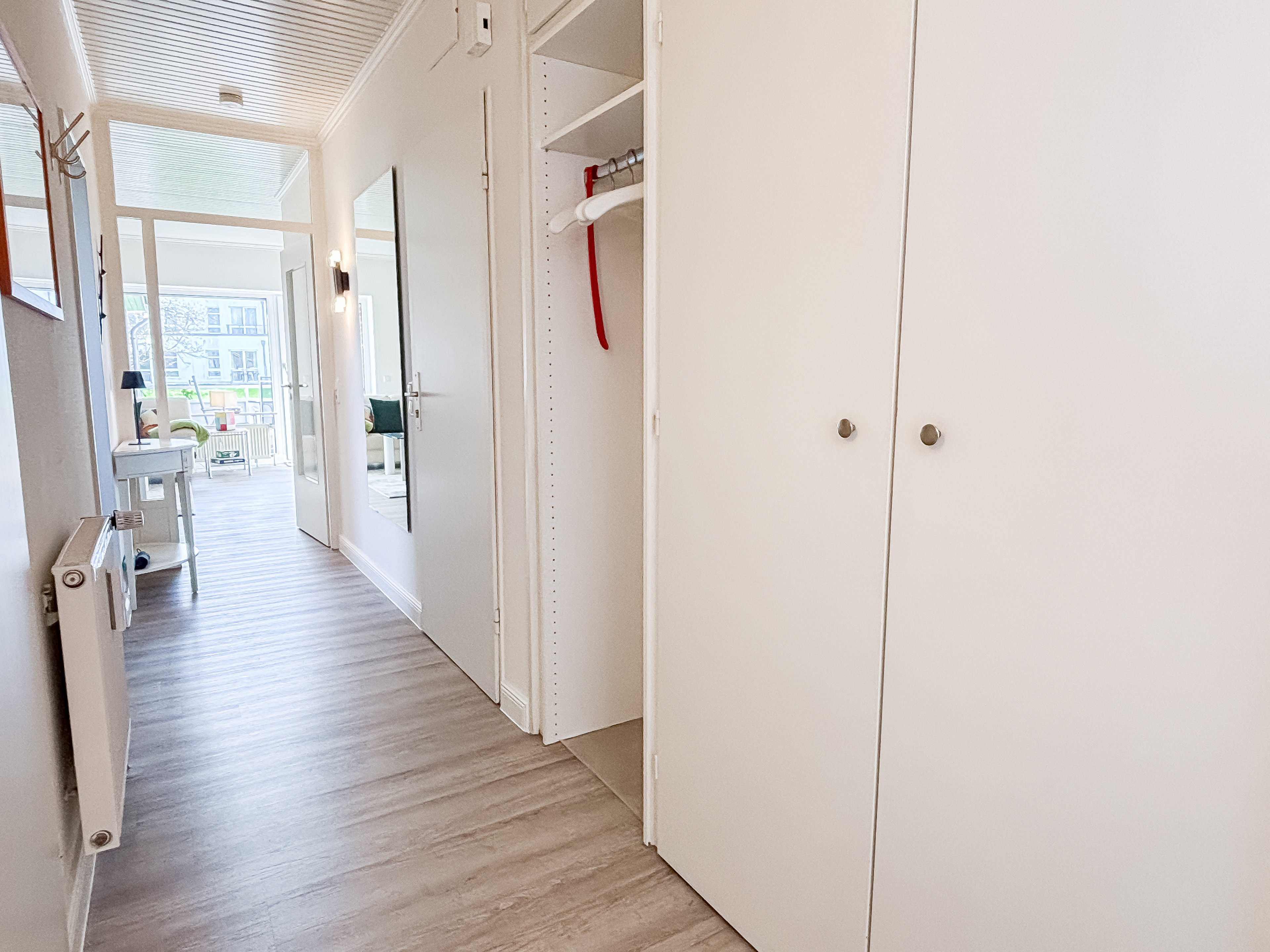 Ein robuster Vinylboden sorgt in der gesamten Wohnung für ein angenehmes Wohngefühl, während das Badezimmer klassisch gefliest ist.