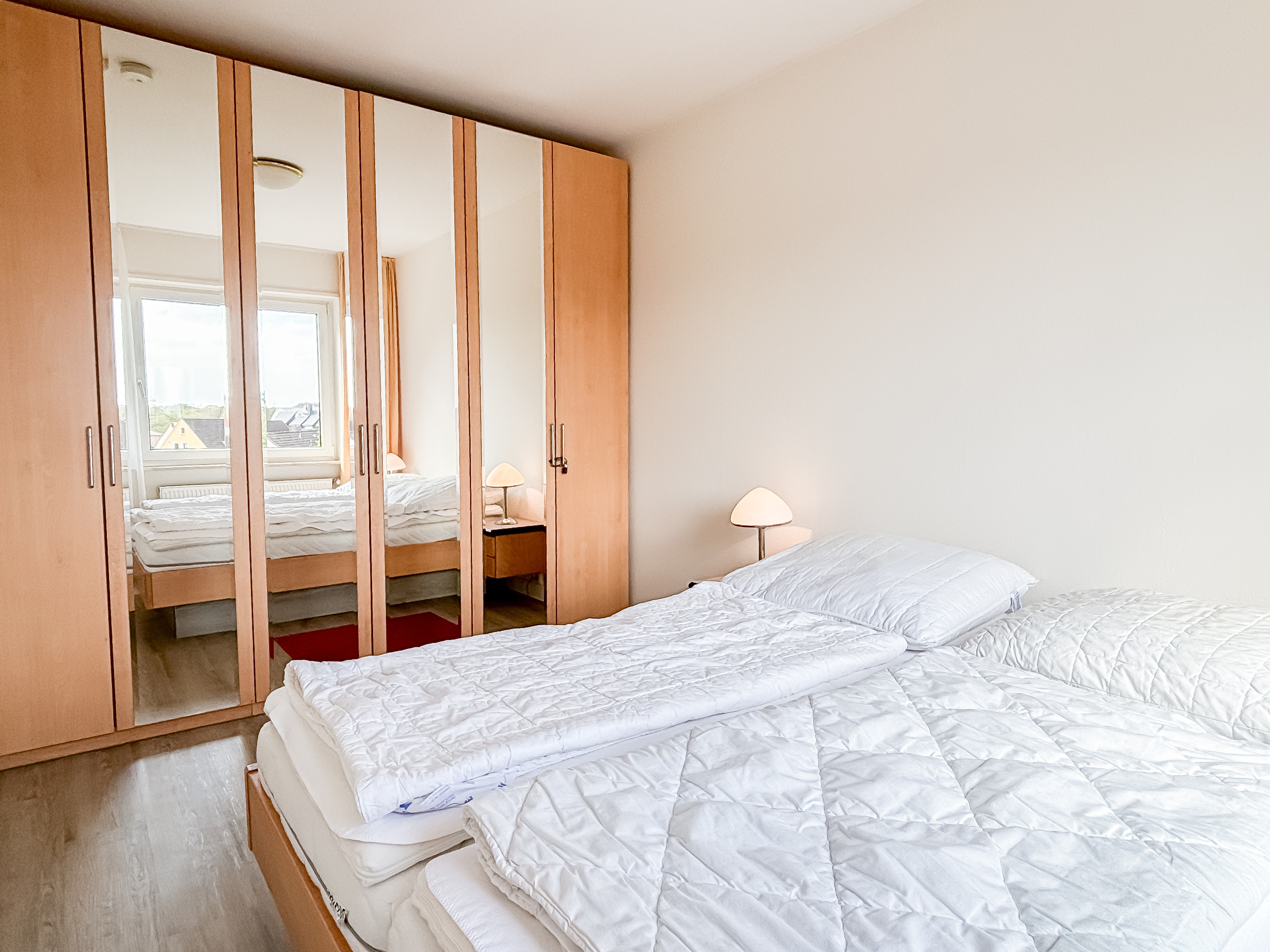 Im Schlafzimmer sorgt ein komfortables Doppelbett für erholsamen Schlaf; ein geräumiger Kleiderschrank bietet ausreichend Stauraum.
