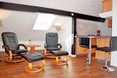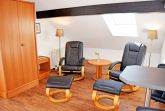 Im kombinierten Wohn-/Schlafraum befindet sich eine Couchgarnitur mit einem Sessel und ein modernes Flachbild-TV-Gerät.