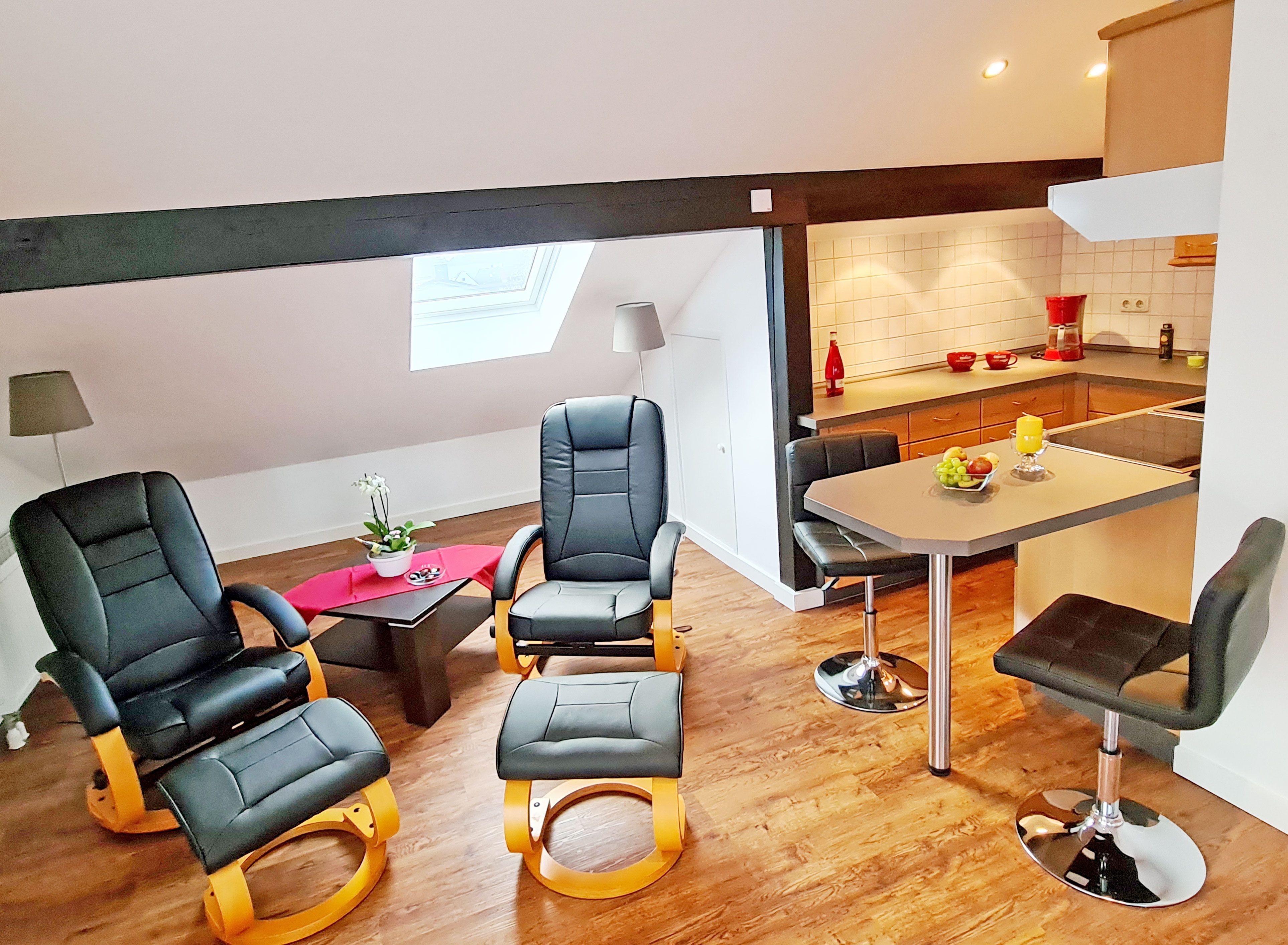 Die moderne Küchenzeile ist mit einem Kochfeld, Mikrowelle, Wasserkocher, Kaffeemaschine, Toaster und Kühlschrank komplett ausgestattet und wird durch zwei Essplätze ergänzt.