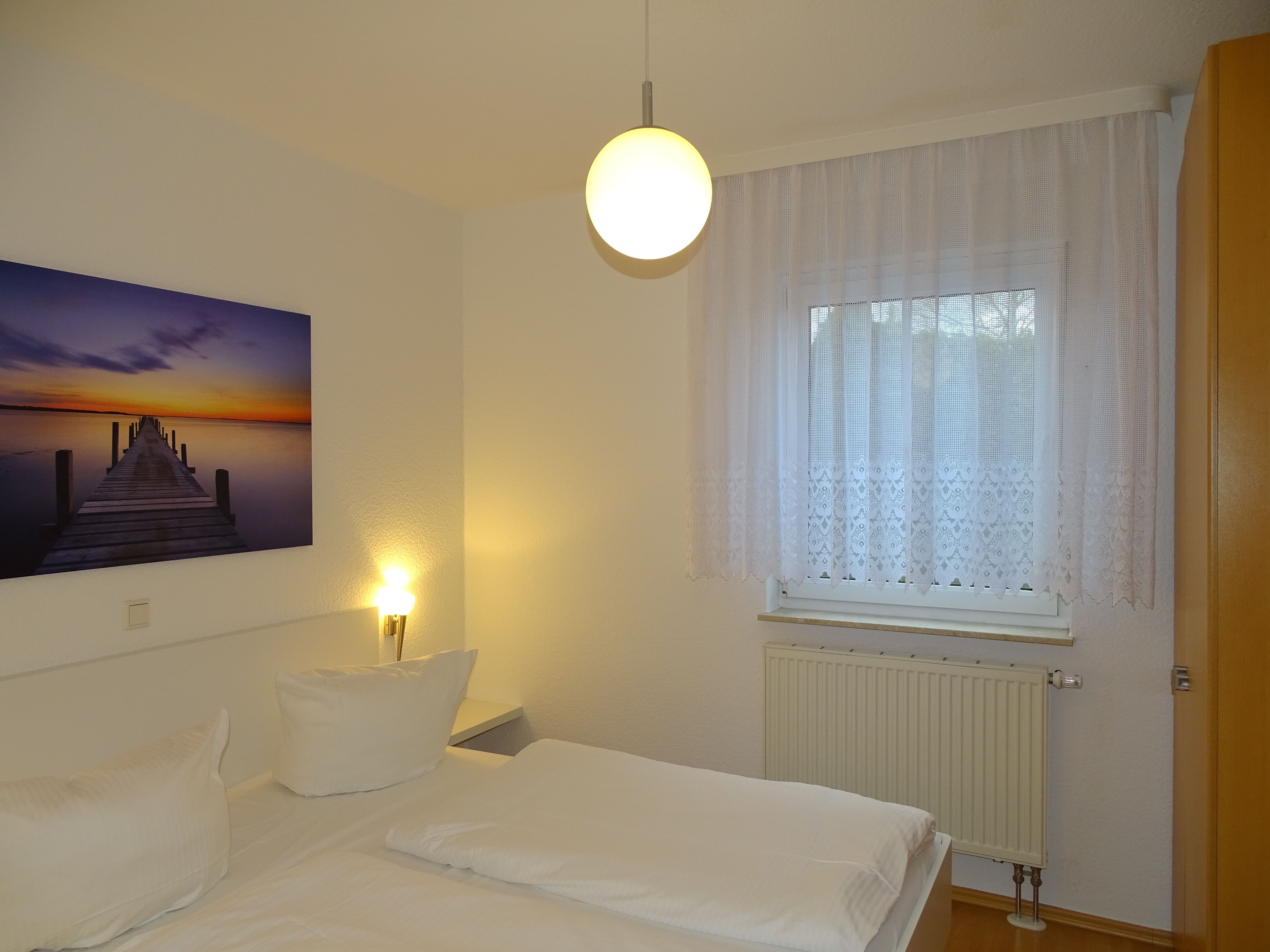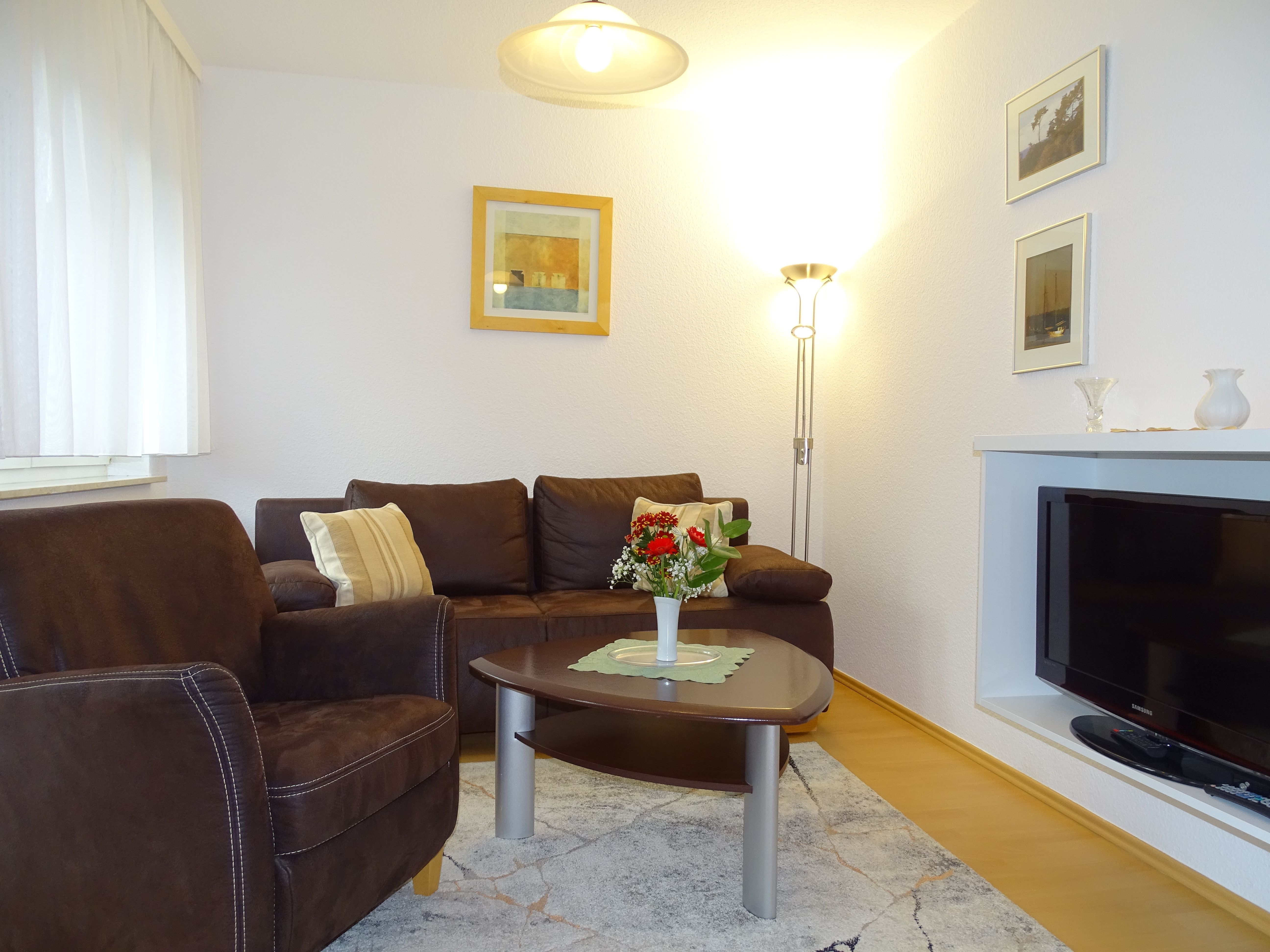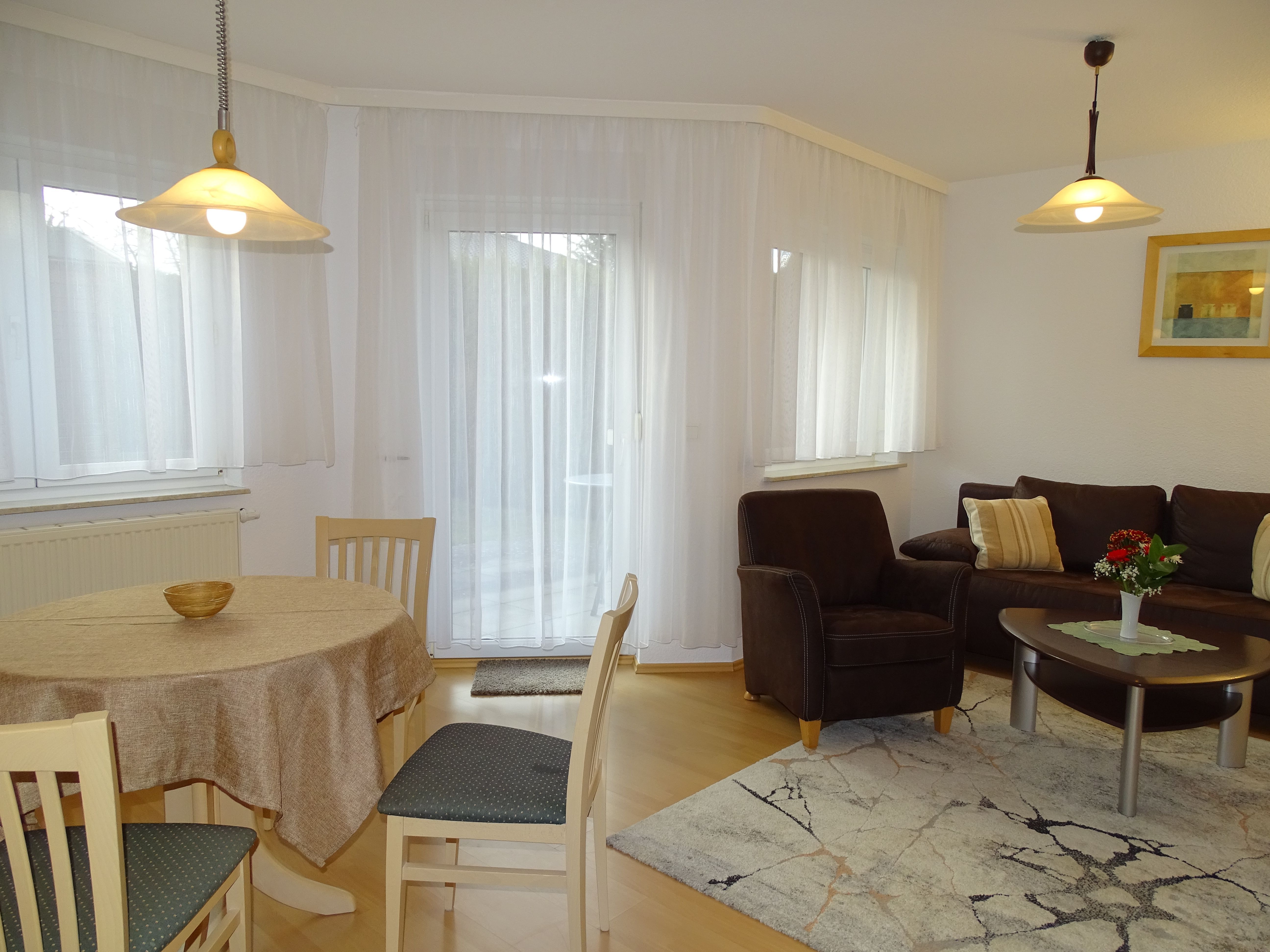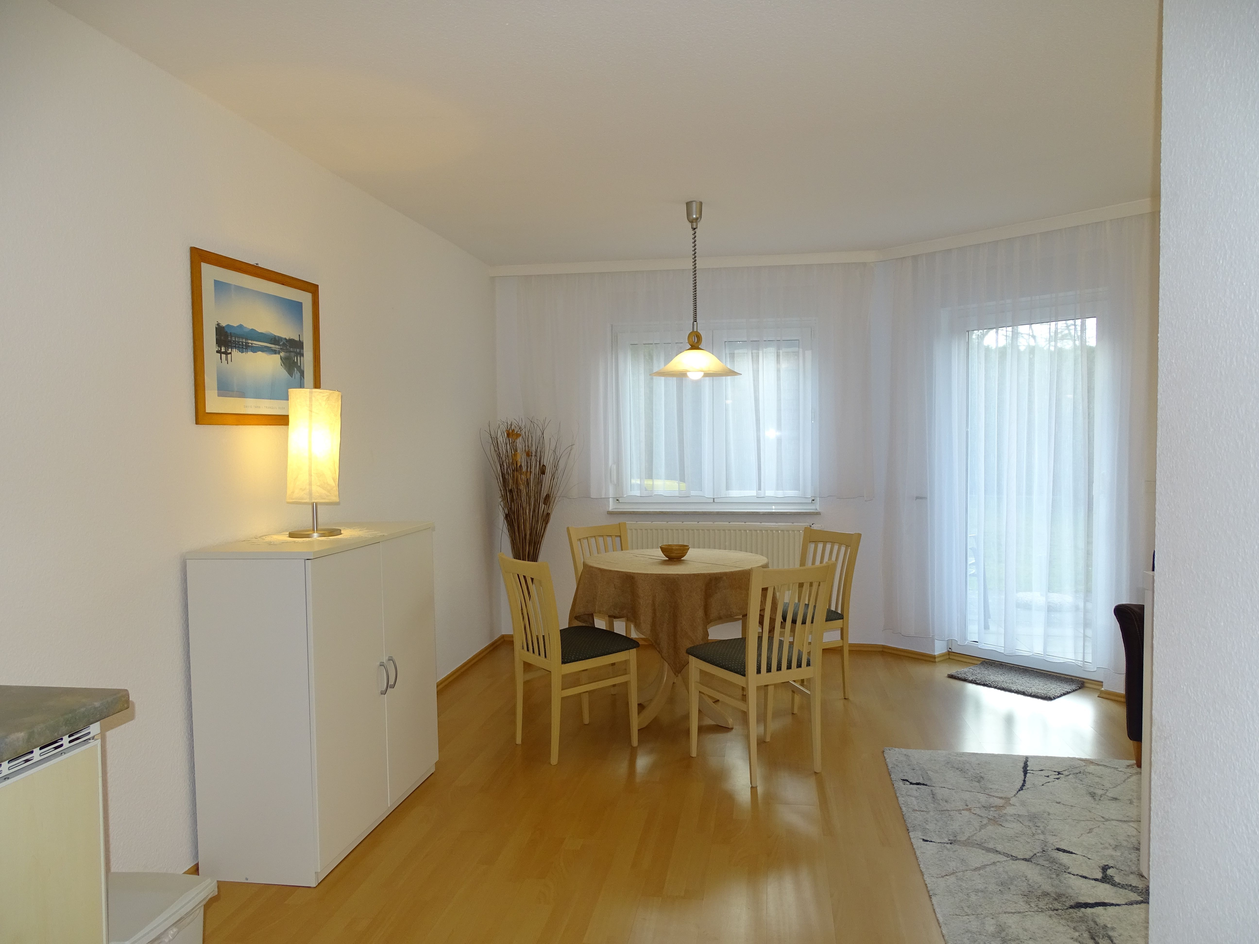 Erleben Sie erholsame Tage in unserer liebevoll eingerichteten, 47 qm großen Erdgeschosswohnung, ideal für Paare oder Familien mit einem Kind. Der großzügige Wohnraum lädt mit einer gemütlichen Sitzgruppe (inkl. Aufbettungsmöglichkeit) und einem Essbereich zum Verweilen ein. Die voll ausgestattete Küchenzeile mit Kühlschrank, Kochherd, Mikrowelle, Kaffeemaschine, Wasserkocher und Toaster bietet Ihnen alles, was Sie für Ihre Selbstversorgung benötigen. Ein separates Schlafzimmer sorgt für erholsamen Schlaf; das geräumige Badezimmer mit Dusche und WC bietet Komfort.