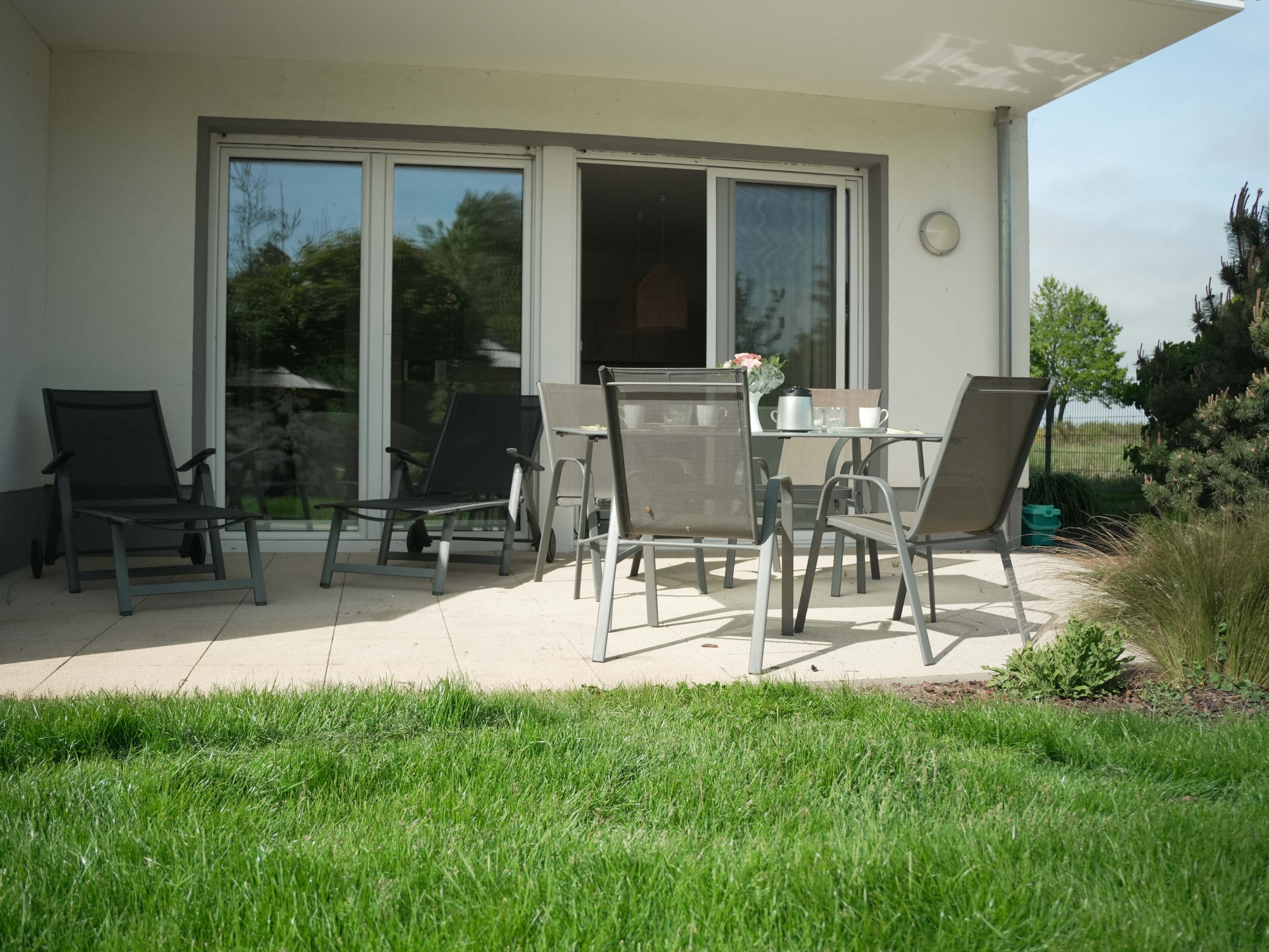 Unsere Ferienwohnung ist großzügig geschnitten und für bis zu 6 Personen geeignet, Erdgeschoß, 87 qm, 2 Schlafzimmer zzgl. Schlafcoach im Wohnzimmer, 1 Terrasse, 2 Bäder, Küche