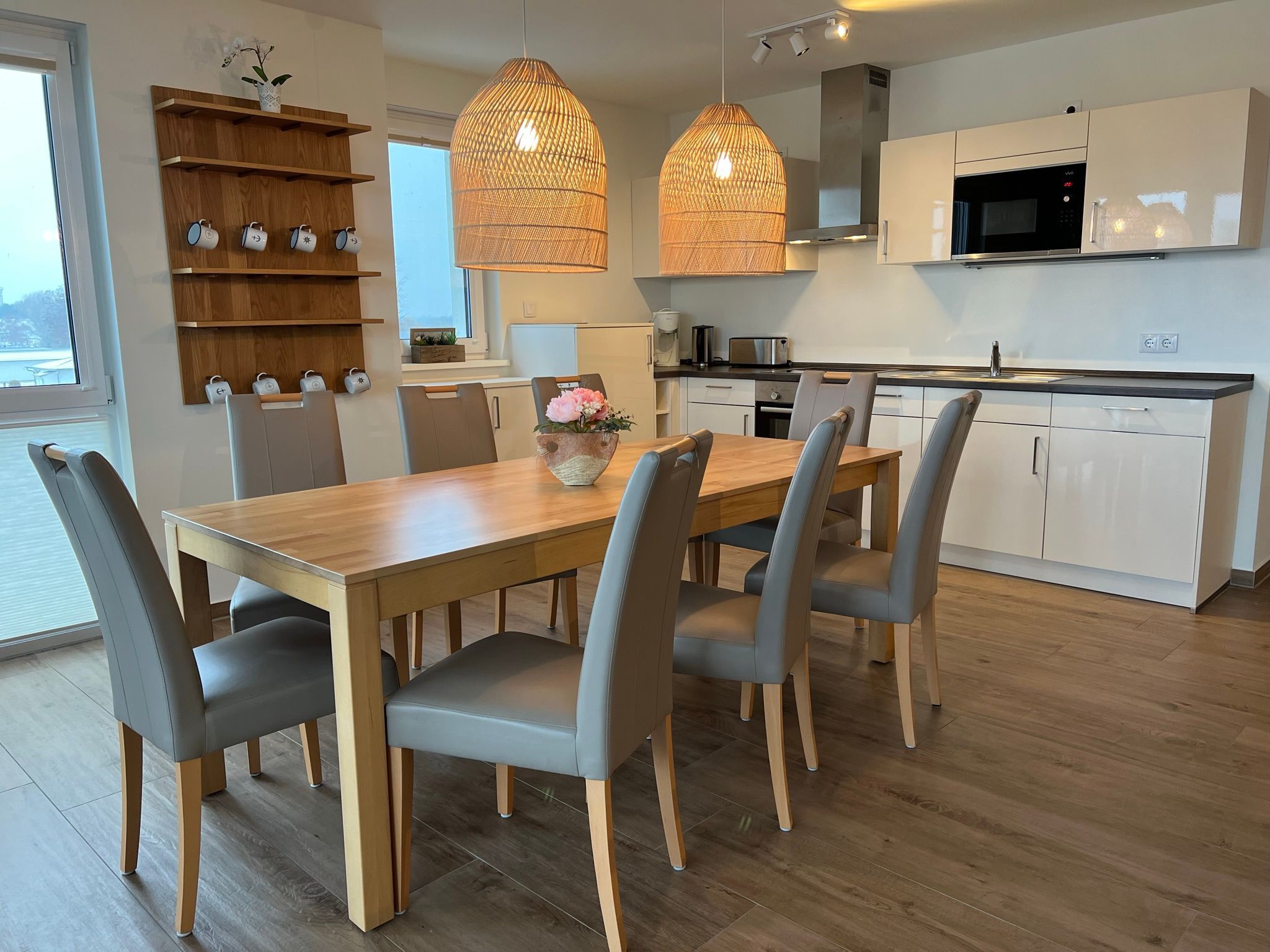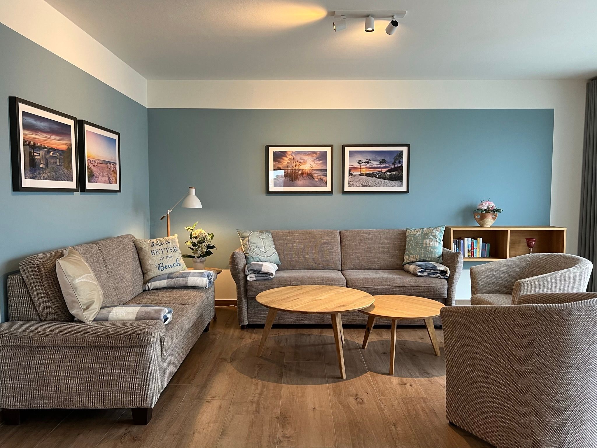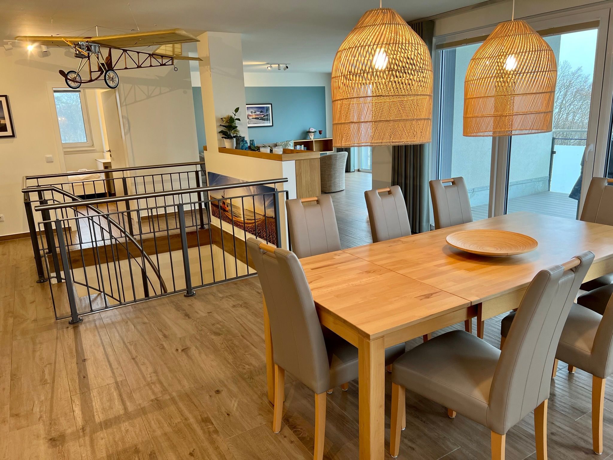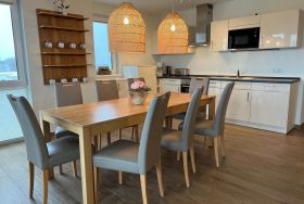 Unsere Ferienwohnung ist großzügig geschnitten und für bis zu 8 Personen geeignet, 2. OG, 160 qm, 3 Schlafzimmer zzgl. Schlafcoach im Wohnzimmer, 1 Balkon, 2 Bäder, Küche, eigene Sauna