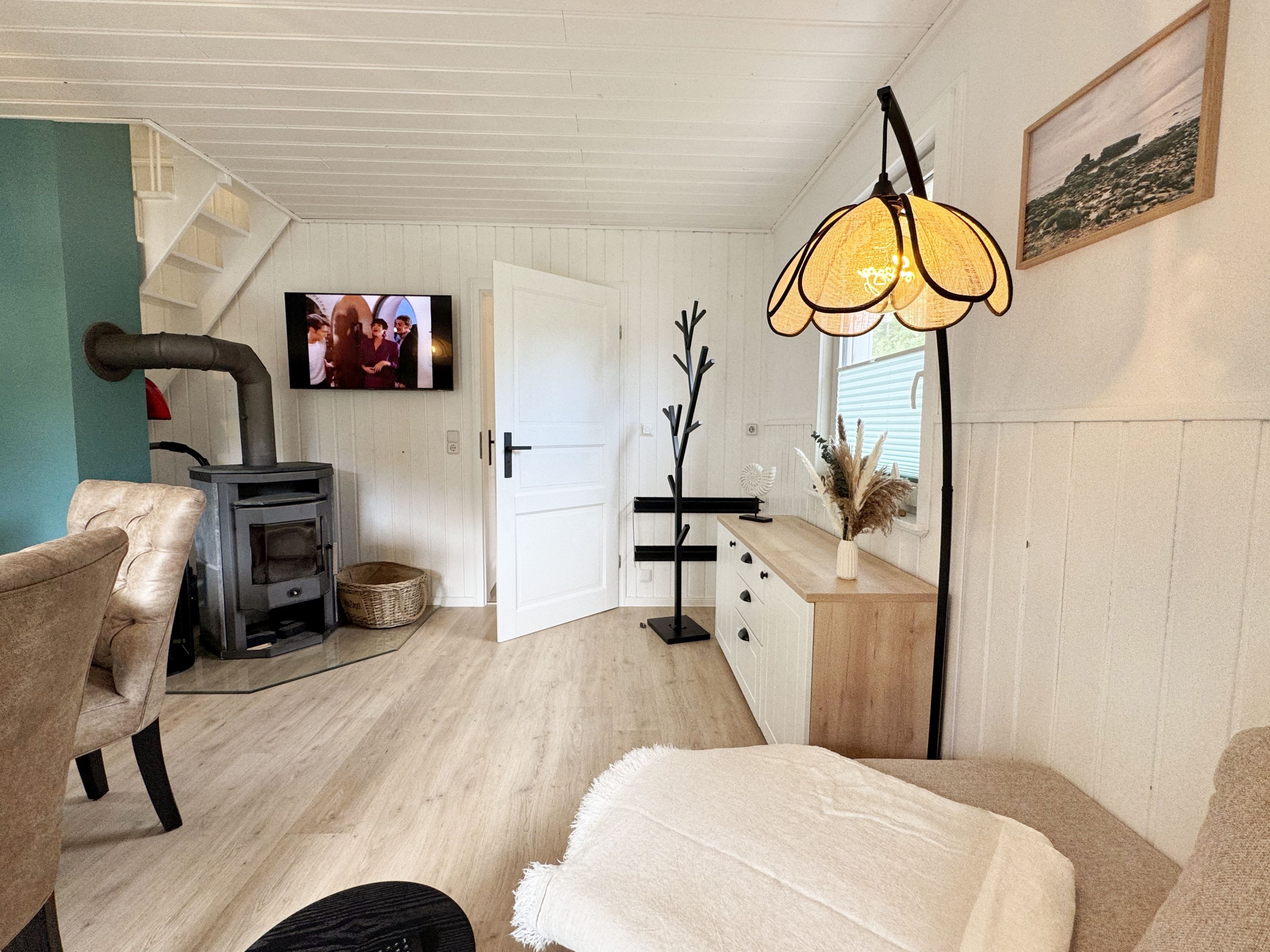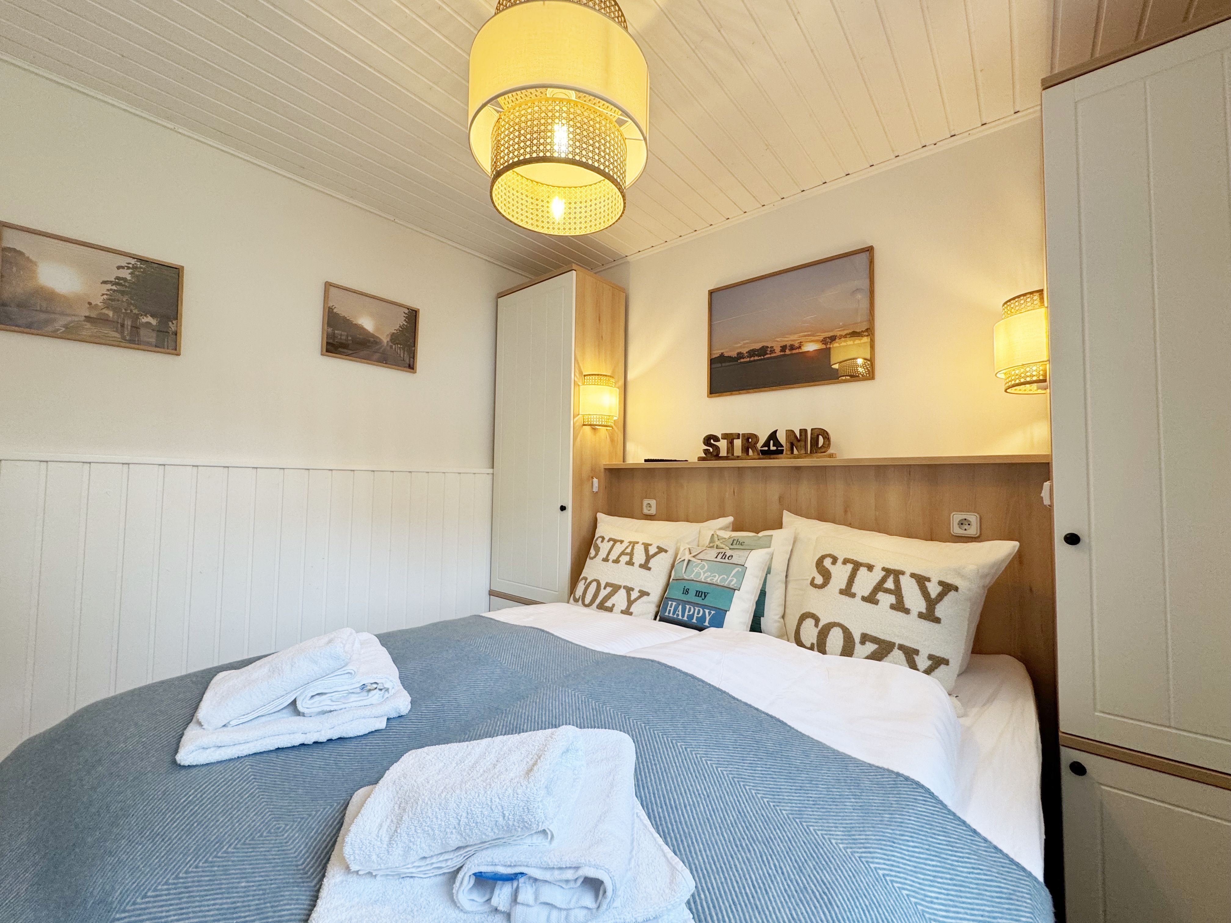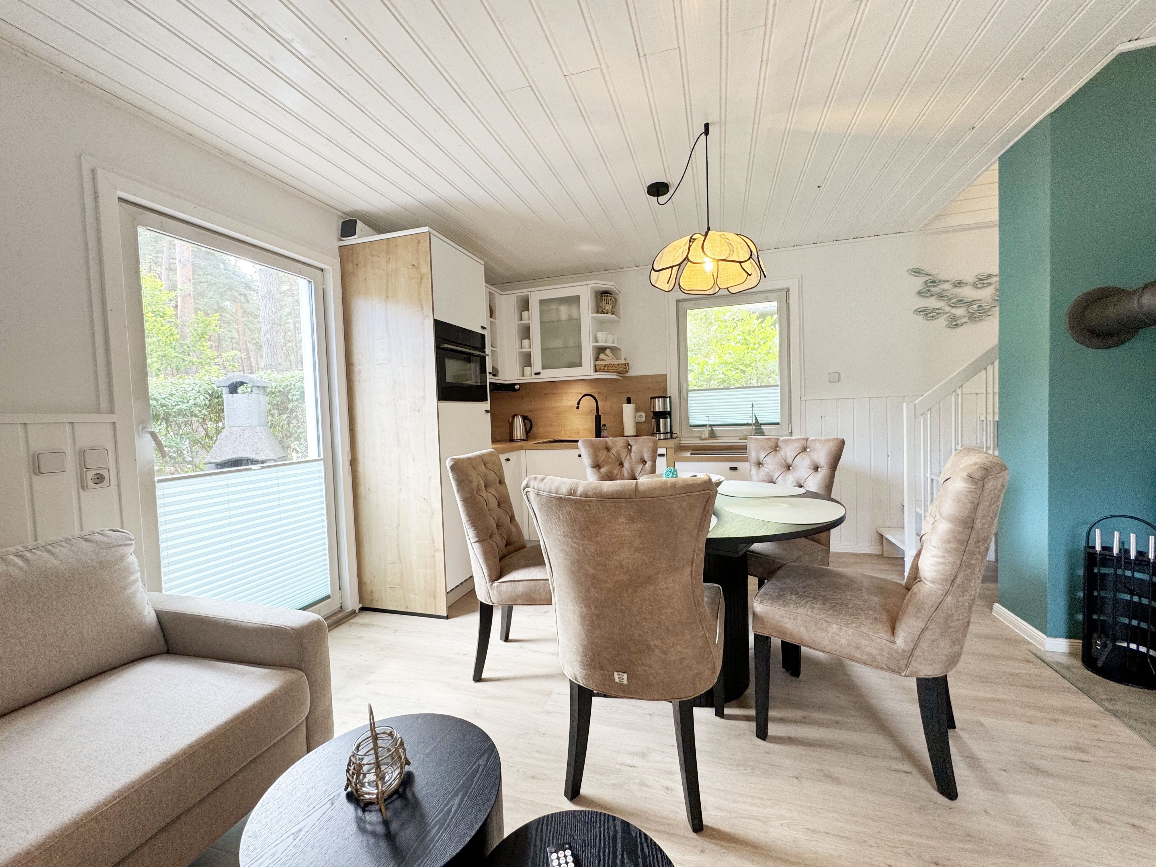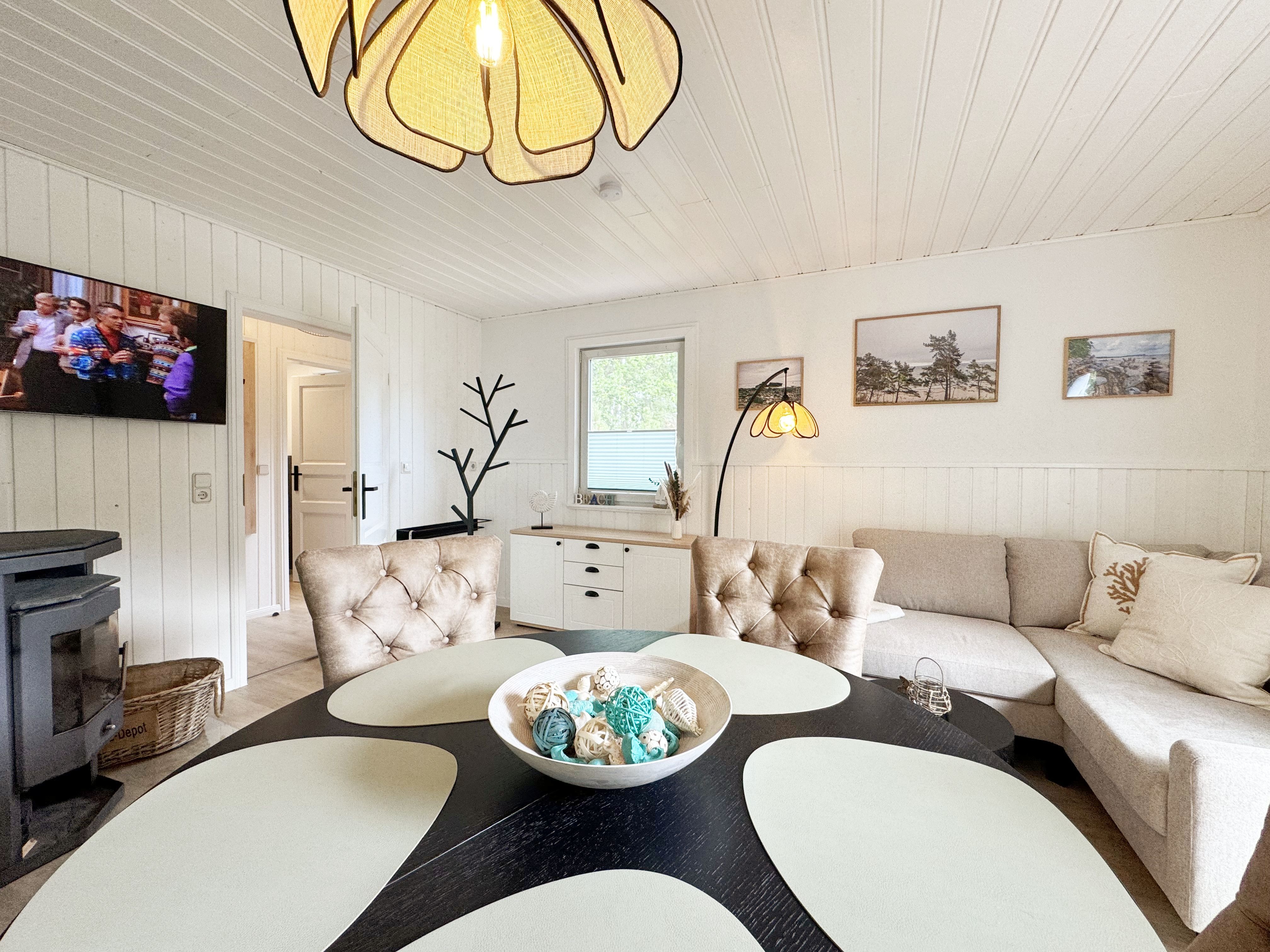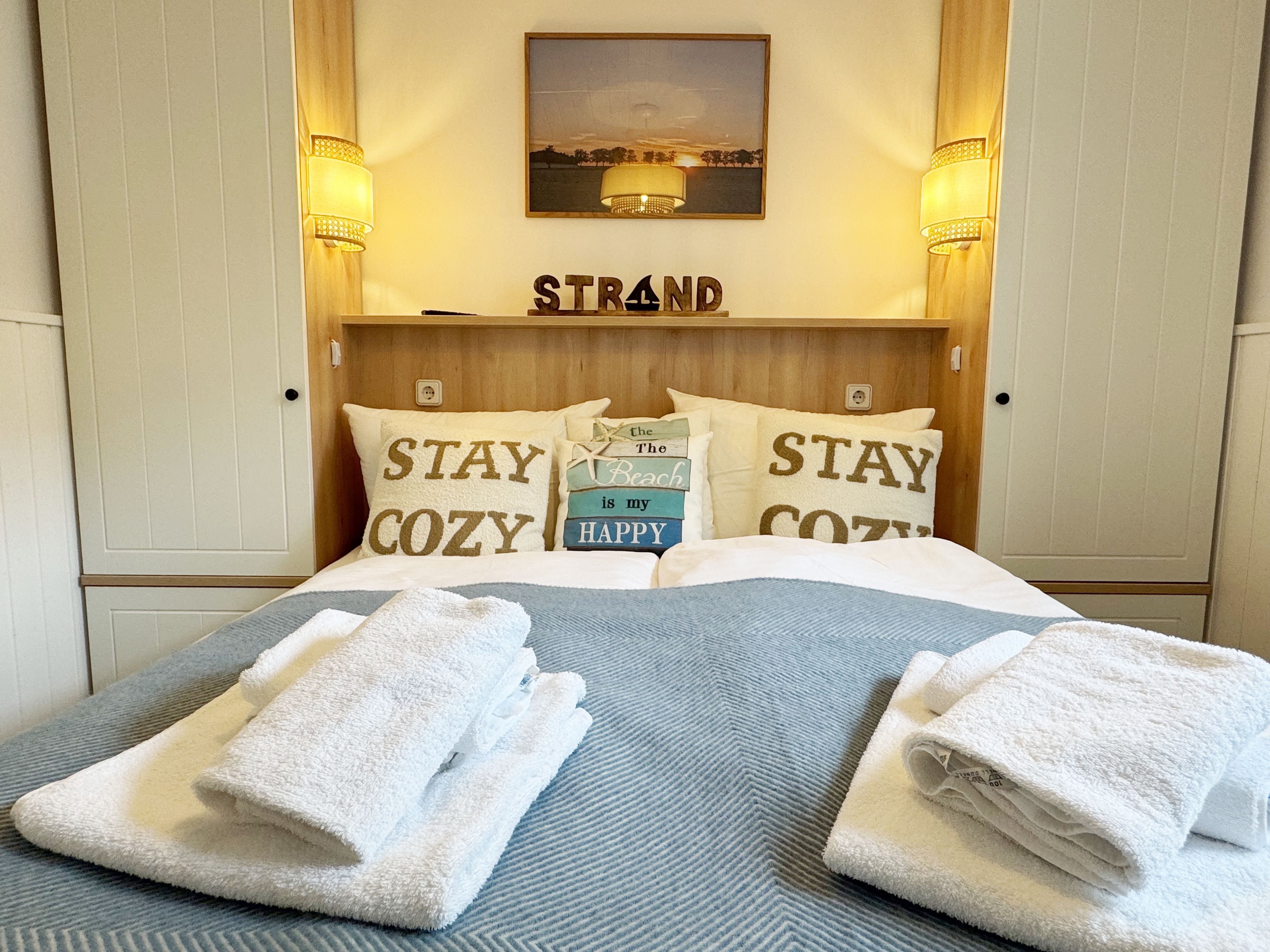 Das gemütliche 2005 in holzbauweise errichtete und 2025 renovierte Ferienhaus Strandmelodie (Nr.08c) mit einer Wohnfläche von 59 m² finden sie im Dünenpark Baabe, umgeben von Meer und Wald. Das optimal für 2 bis 4 Erwachsene + 1 Kleinkind bis 3 Jahre im Kinderreisebett ausgerichtete tierfreundliche Nichtraucherhaus betreten sie über einen kleinen Eingangsflur mit Garderobe. Im Erdgeschoß befindet sich der Wohn- und Essbereich mit gemütlicher Wohnlandschaft mit Urlaubslektüre, Stehlampe, Smart-TV, DAB-Radio mit Bluetooth und auch für einen Internetzugang ist gesorgt. Dieser ist für sie inklusive. Wer es abends noch etwas gemütlicher mag, der zündet sich den Kamin an und lässt den Tag bei einem prasselnden Feuer und einem Glas Wein ausklingen. Dem Wohnbereich angeschlossen ist die Einbauküche mit Geschirrspüler, Kühlschrank mit Gefrierfach, Ceranfeld, Backofen, Mikrowelle, Kaffeemaschine, Eierkocher, Wasserkocher und Waschmaschine mit Trocknerfunktion. Am Esstisch finden alle Personen Platz, wo auch für ein Hochstuhl gesorgt ist. Direkt vom Wohn-& Essbereich haben sie die Möglichkeit die Terrasse zu betreten, welche mit bequemen Terrassenmöbeln, einem Steingrill, einer Überdachung und Sonnenschutz ausgestattet ist. Das freundlich eingerichtete Schlafzimmer ist mit einem Boxspringbett (1,60m x 2,00m) mit verstellbaren Lattenrosten, Nachttischkonsole, Leseleuchten, Kleiderablage, einem Safe, einem Smart-TV, Verdunklungsmöglichkeiten und Kleiderschrank ausgestattet. Auf gleicher Ebene befindet sich das Tageslicht-Bad mit ebenerdiger Dusche, Waschplatz, Fön, Kosmetikspiegel, Insektenschutzgitter und WC. Über eine Holztreppe erreichen sie das Obergeschoß zum 2. Schlafzimmer mit 2 Einzelboxspringbetten (je 0,90m 2,00m), Ablagemöglichkeiten, Leseleuchten, Verdunklungsmöglichkeit, einem kleinen Sitzbereich und einer Kommode zur Kleiderablage. Im Vorflur befindet sich zusätzlich ein Einbauschrank, wo Sie Ihre Kleidung zudem auch aufhängen können. Unsere bis zu 100° beheizbare Trockensauna befindet im angrenzenden Nebenraum mit Blick ins Grüne.Im kleinen Vorraum befindet sich eine Sitzgelegenheit zum entspannen. Das Haus verfügt in allen Räumen über eine Fußbodenheizung und in den Schlafräumen, Wohn-& Essbereich befinden sich vor den Fenstern Insektenschutzgitter, die Ihnen einen ruhigen Schlaf ermöglichen. Ihre geliehenen oder mitgebrachten Fahrräder/E-Bikes können sie in dem am Haus befindlichen Fahrradschuppen mit Auflademöglichkeit sicher unterbringen. Ein Haustier ist mit seinem eigenen Schlafplatz gegen eine Gebühr ein gern gesehener Gast. Ihr PKW-Stellplatz (Nr.08c) befindet sich in unmittelbarer Nähe und in Sichtweite. Die Erstausstattung eines Wäschepaketes (komplette Bettwäsche, 1 Duschhandtuch, 2 kleine Handtücher) können Sie bis 14 Tage vor Anreise gegen einen Aufpreis dazu buchen oder durch eigenes Ergänzen. Ab 2 gebuchten Paketen erhalten Sie einmalig 1 Geschirrhandtuch und 1 Duschvorleger hinzu.